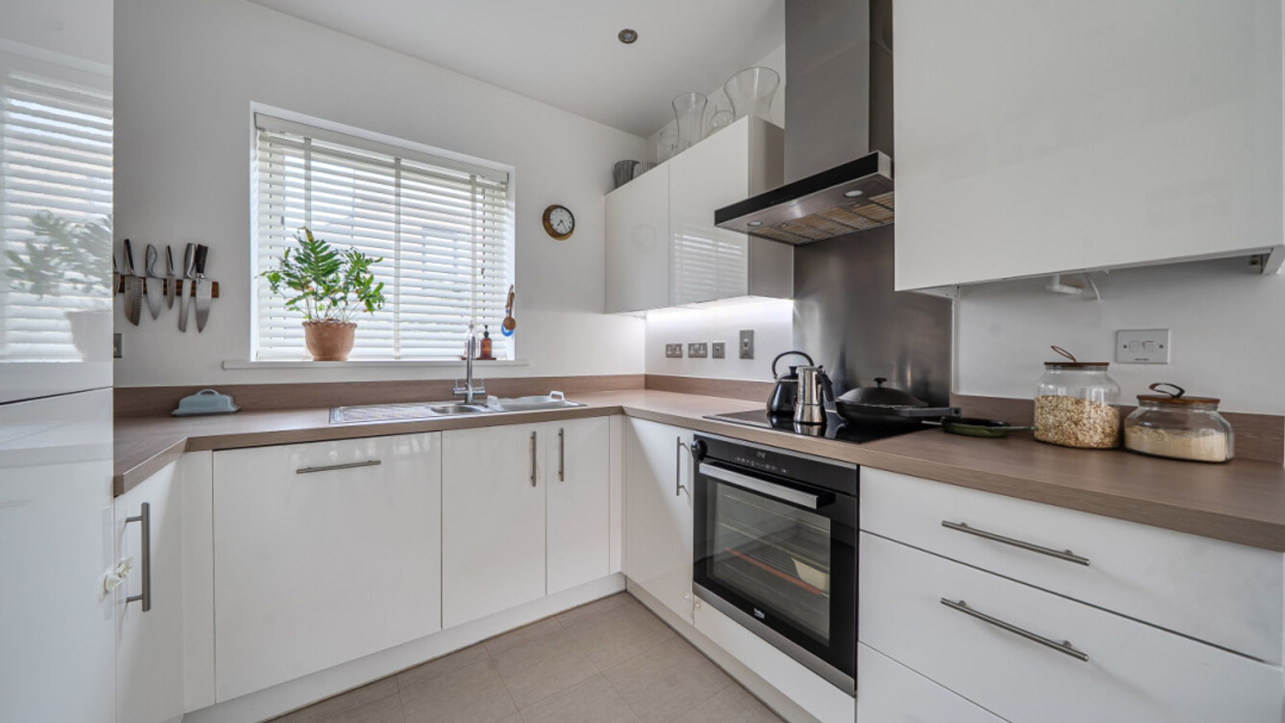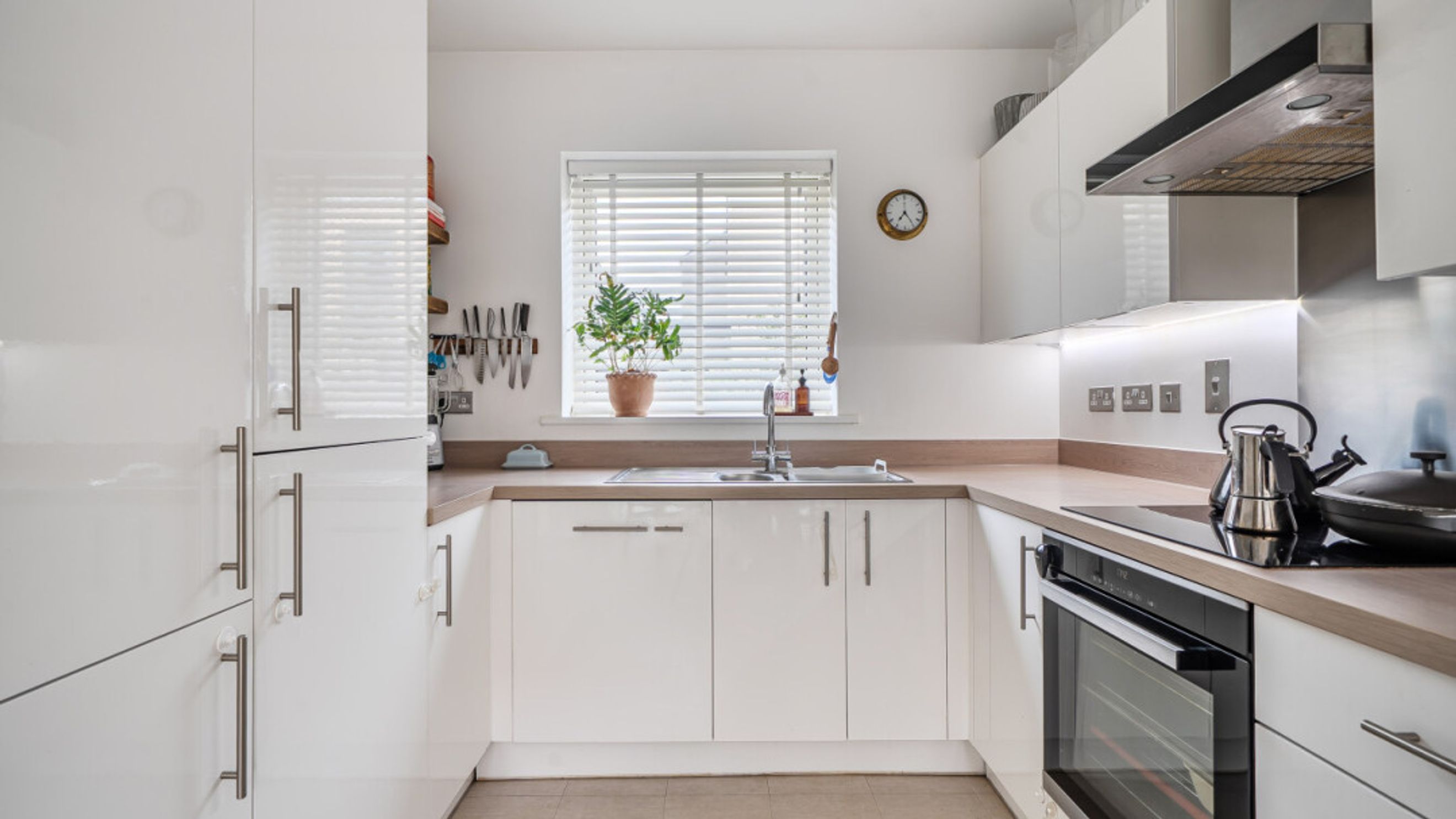 The ground floor of this bright and spacious, double fronted, semi-detached house, consists of a stylish, dual aspect semi open-plan kitchen and living area, flooded with natural light. The kitchen is fitted with high gloss white wall and base units and a wood effect worktop. It also benefits from integrated appliances including a fridge freezer, oven, hob and extractor fan. There is also a downstairs cloakroom/WC. The garden is laid mainly to lawn with a patio area and shed. It also provides side access to your parking space. On the first floor find two generous double bedrooms with bespoke fitted wardrobes. The contemporary bathroom comes complete with a white three-piece suite with a shower over bath and a stone tile surround.