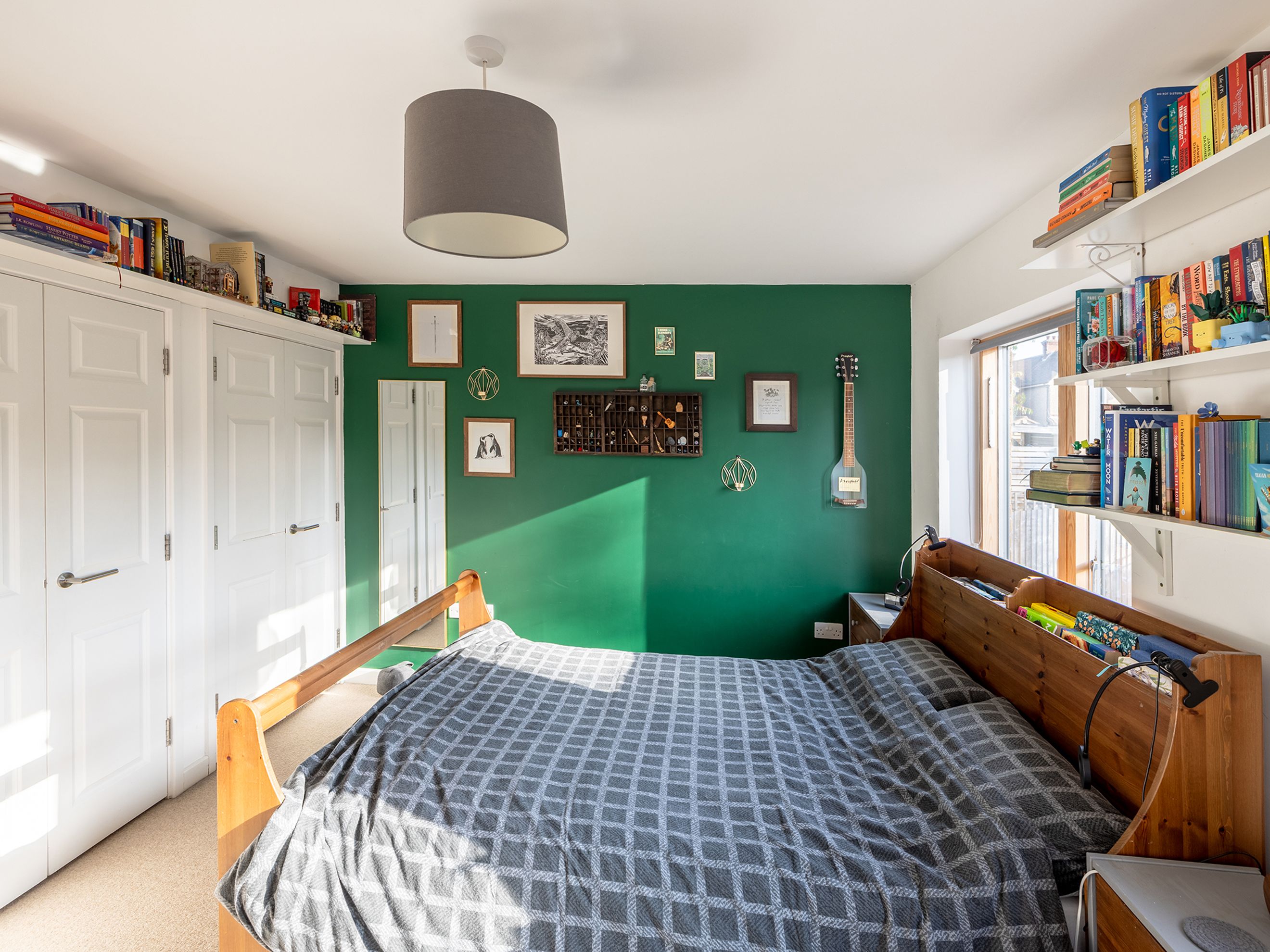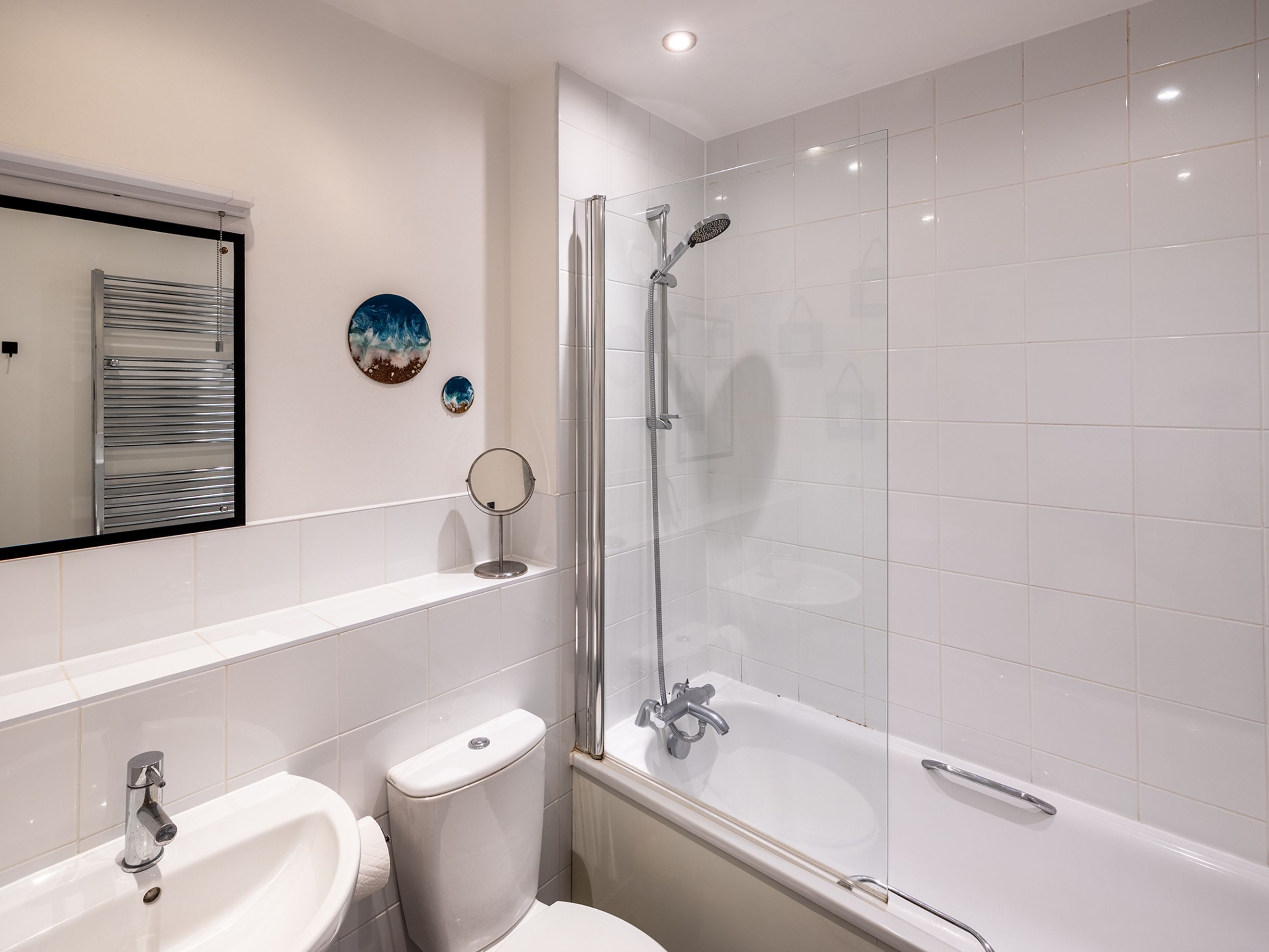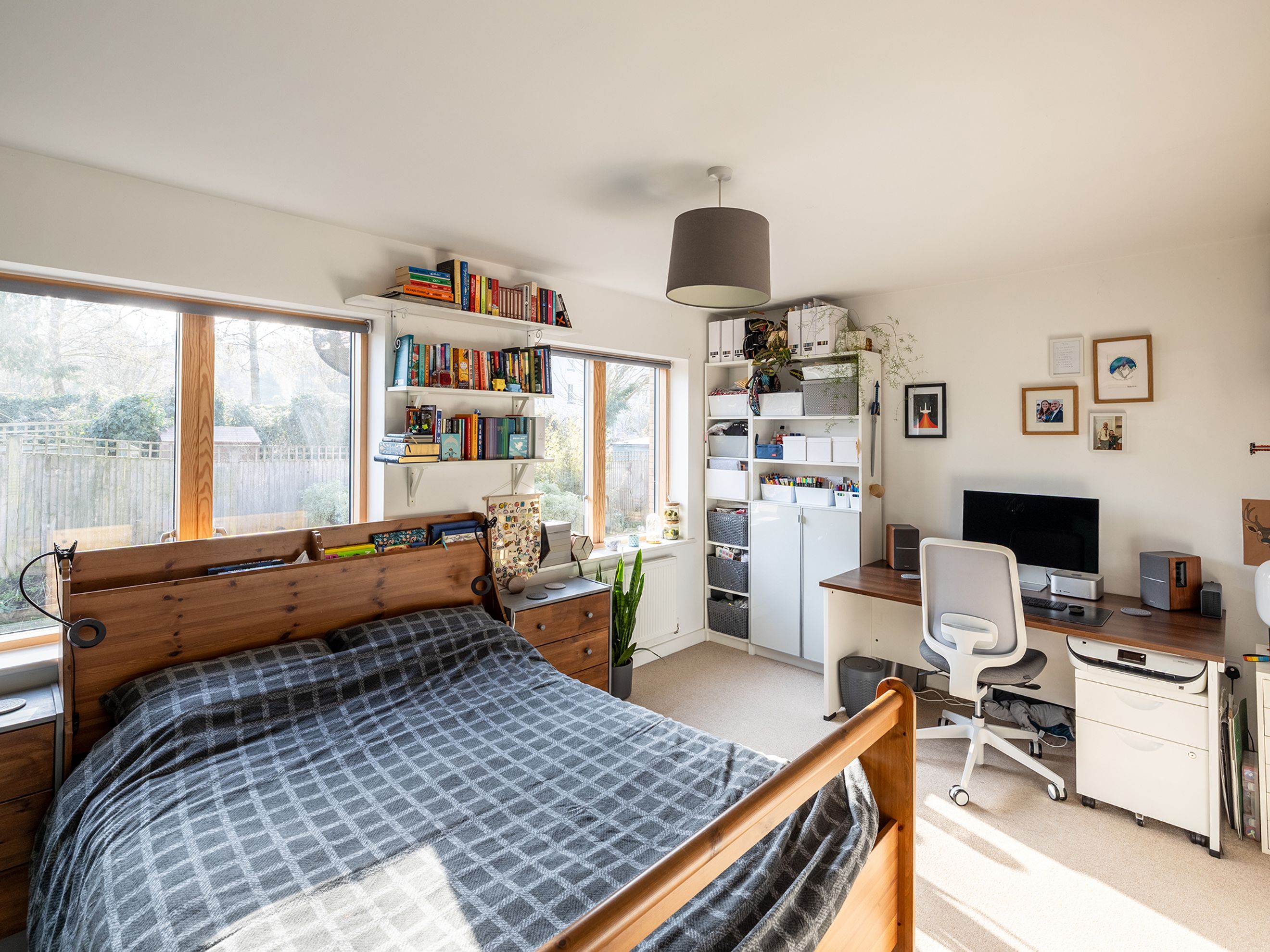 Upstairs features two spacious double bedrooms. The master bedroom has two fitted wardrobes, and is large enough to currently be used as a bedroom and office. The second bedroom has a nook for additional storage or workspace. The bathroom has a bath with shower, and includes a good height heated towel rail.