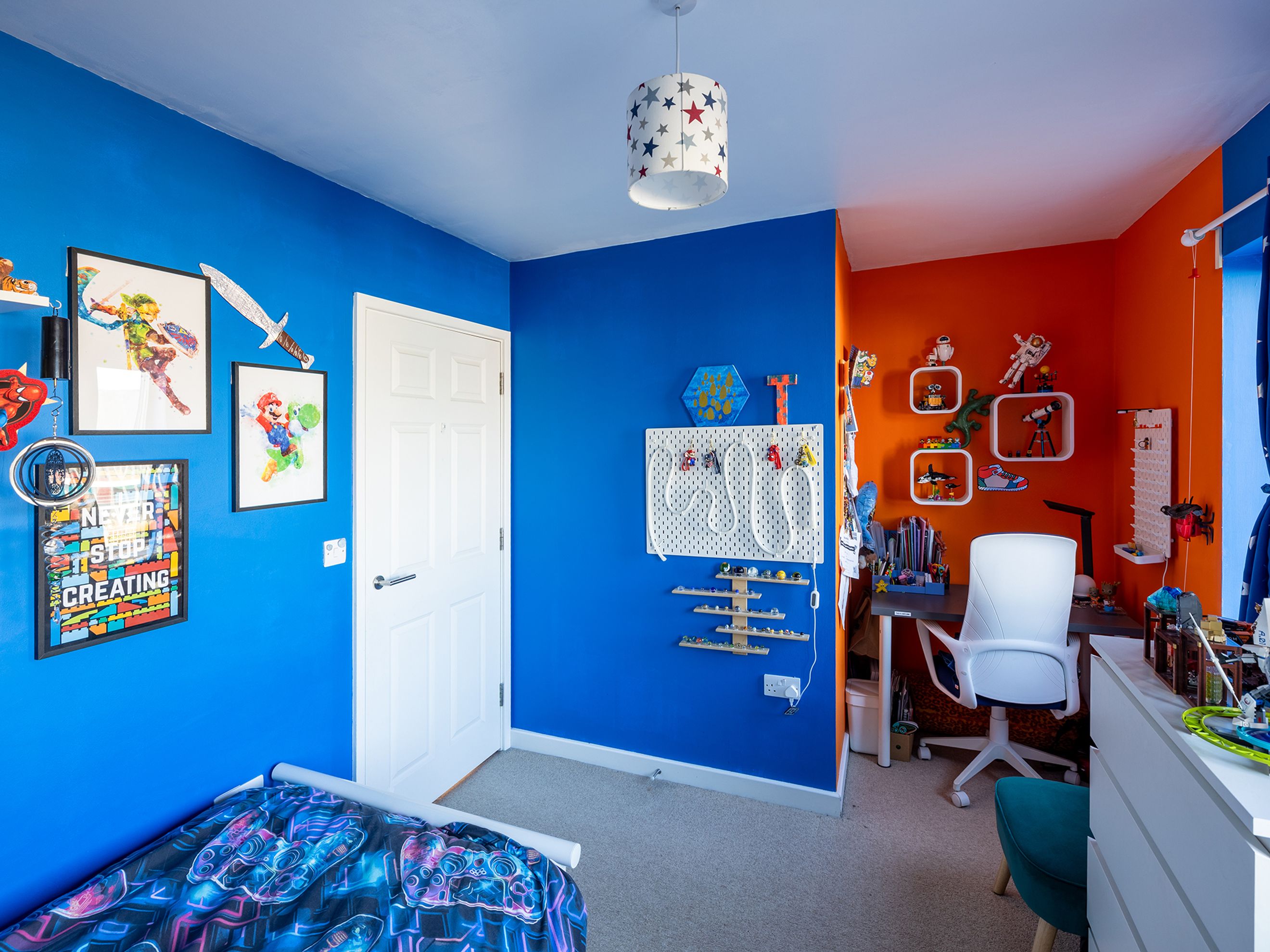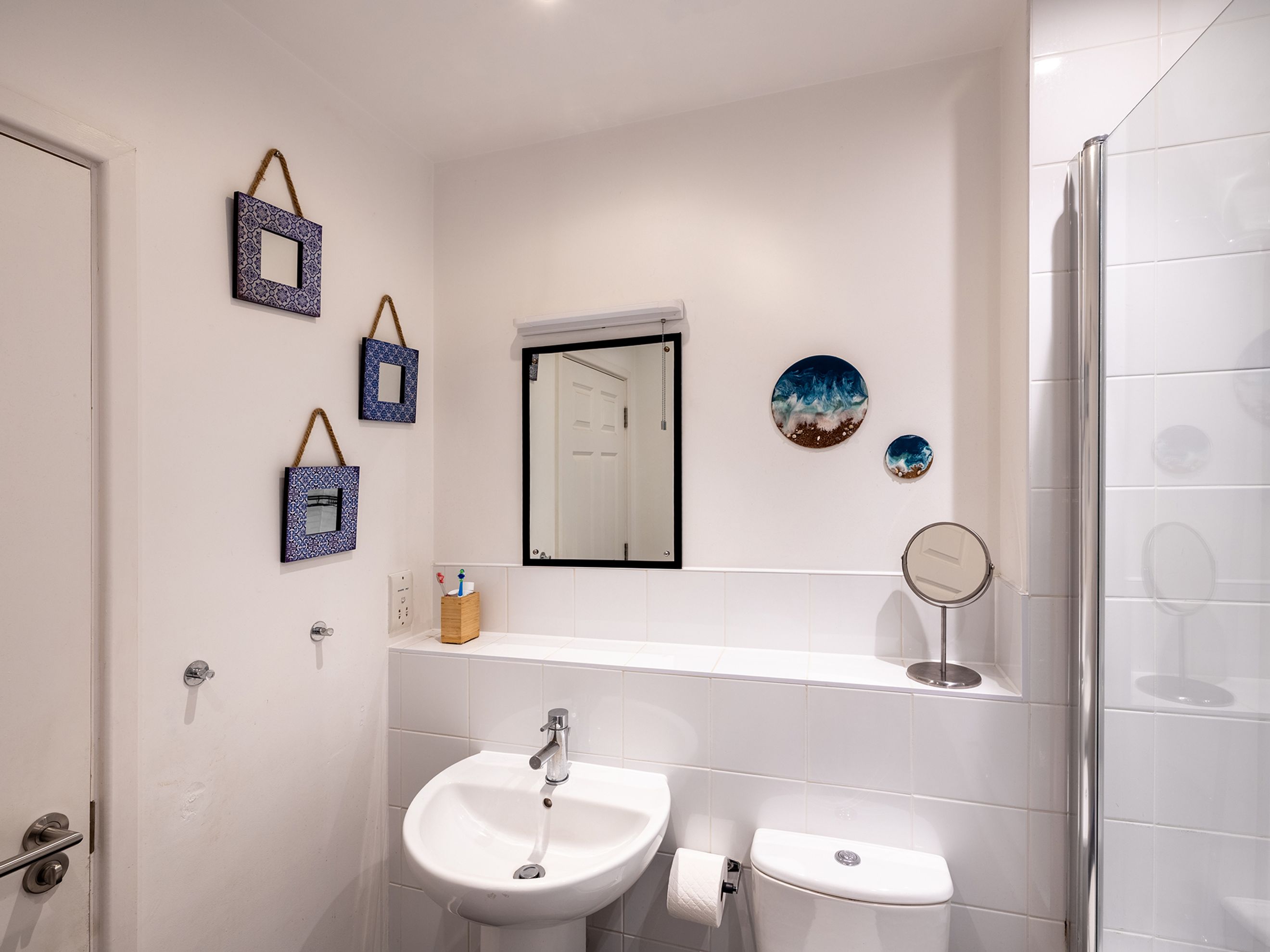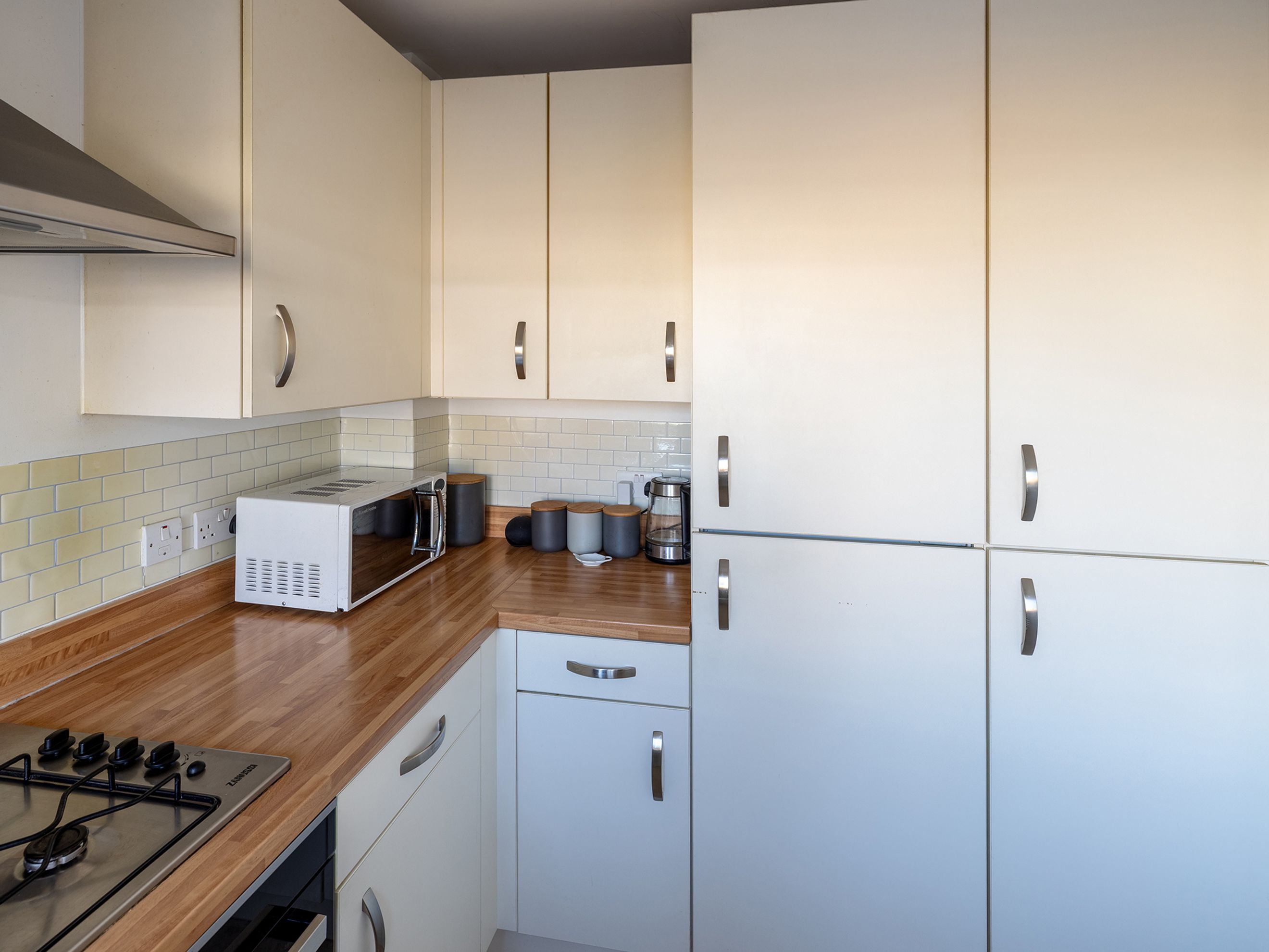 Upstairs features two spacious double bedrooms. The master bedroom has two fitted wardrobes, and is large enough to currently be used as a bedroom and office. The second bedroom has a nook for additional storage or workspace. The bathroom has a bath with shower, and includes a good height heated towel rail.