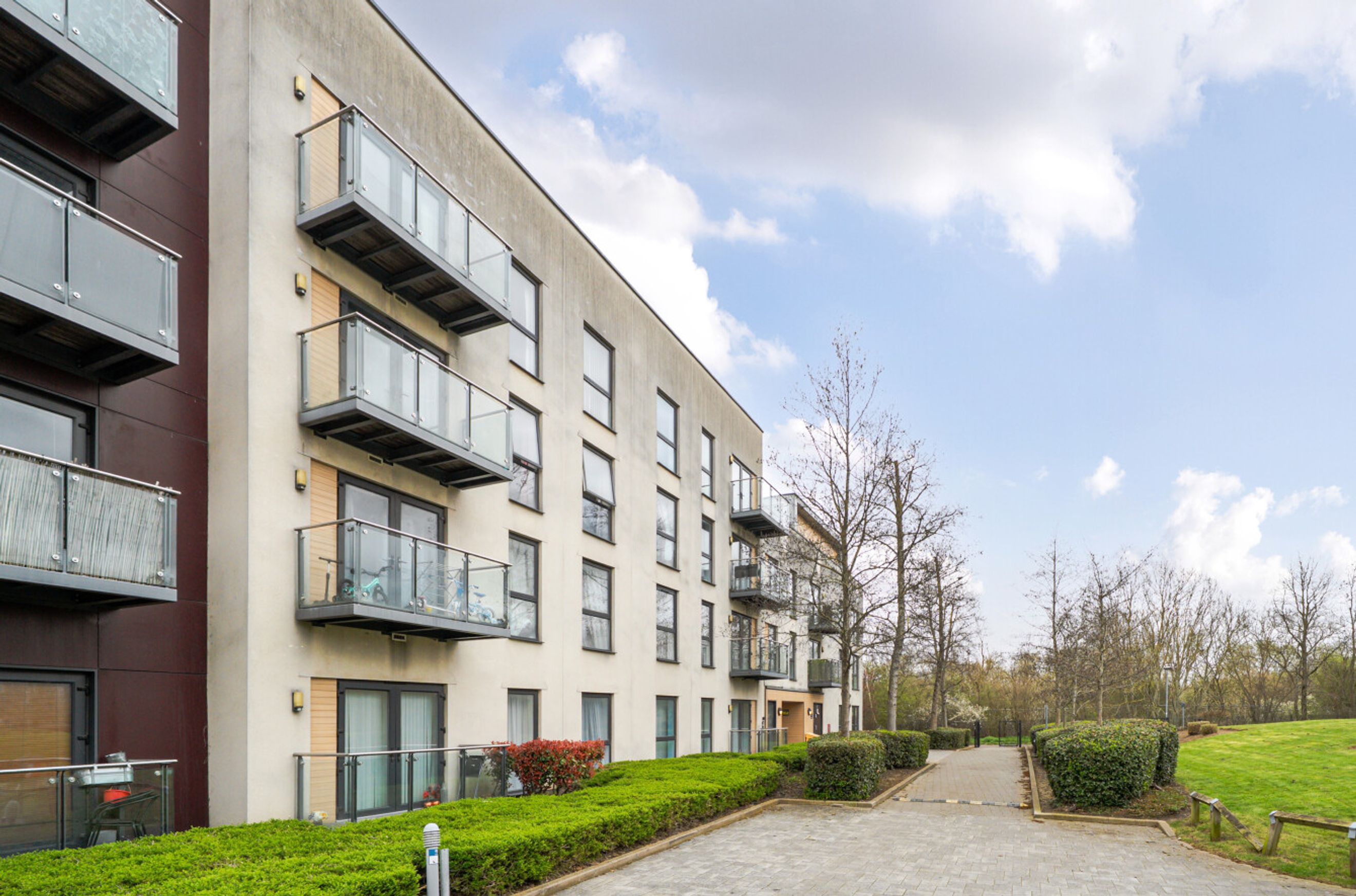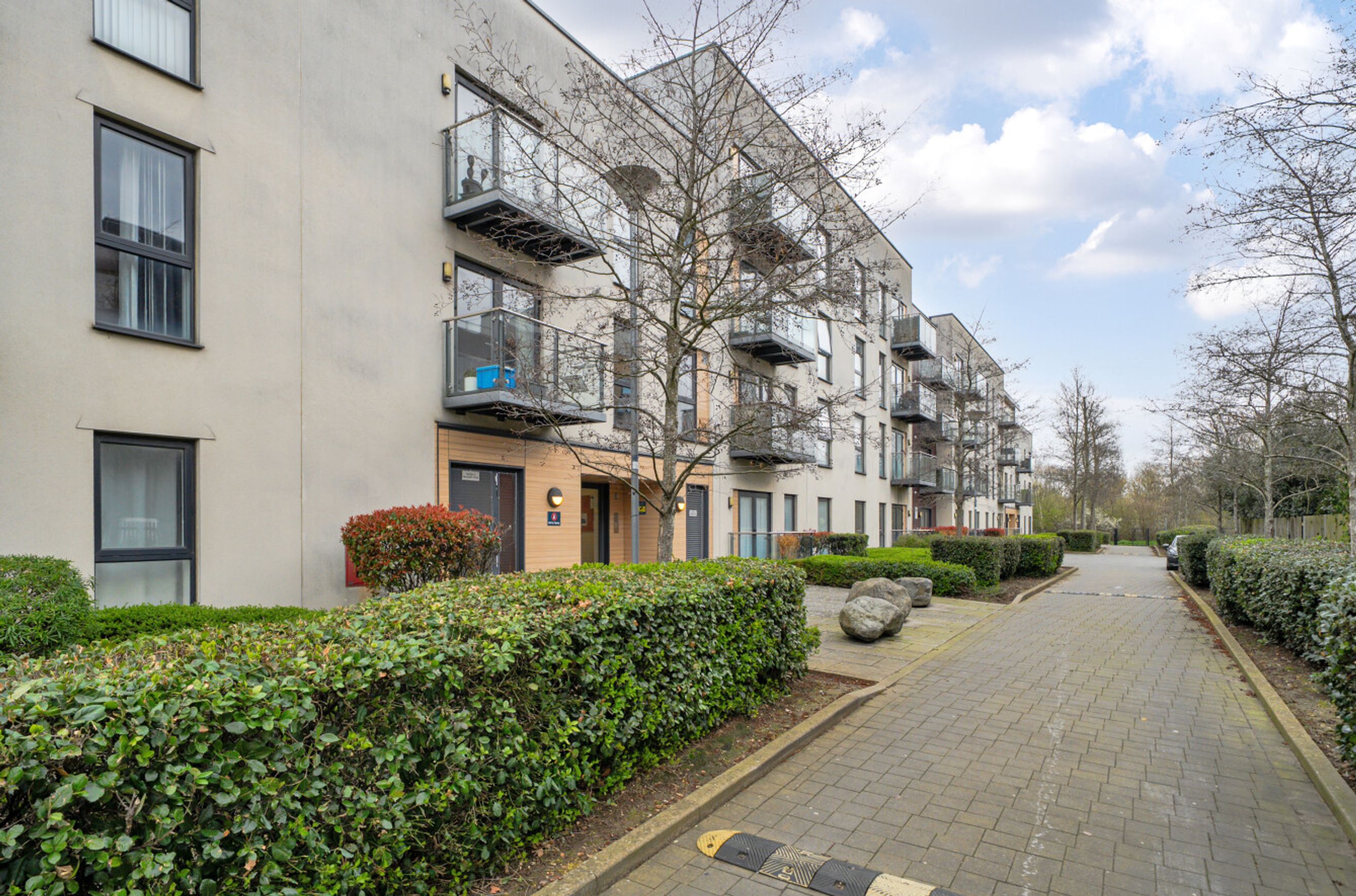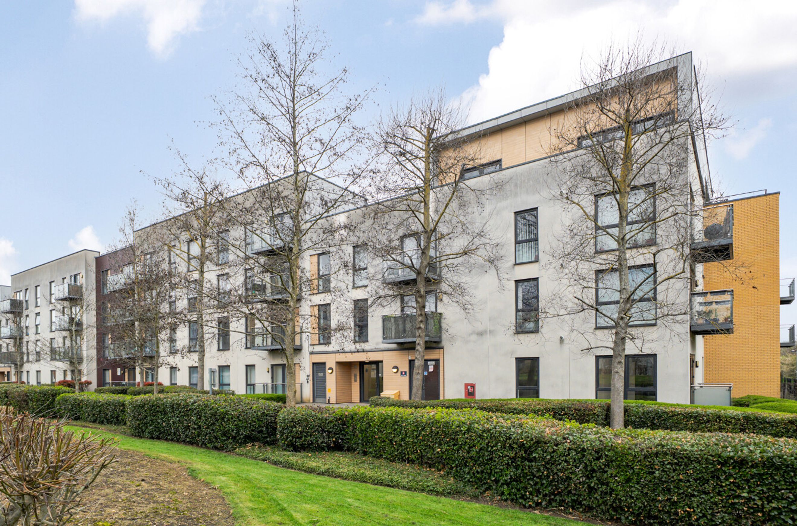 A second-floor flat which occupies a favourable position in this modern development. The property is south facing and overlooks the communal garden. Internal features include a semi-open-plan kitchen with sleek units and pencil-mosaic splashbacks and a living room with wood flooring and double doors that lead to the balcony. There is a spacious main bedroom with fitted wardrobe plus a good-sized second bedroom and a bathroom with combined overhead/hand-held shower. A large storage/utility cupboard has been provided in the entrance hall and well insulated walls, modern double glazing and gas central heating make for a very good energy-efficiency rating. The apartment comes with use of an allocated space within the underground car park and is also just a short walk from Enfield Lock Station.