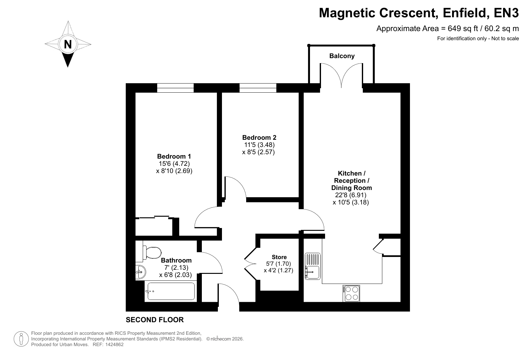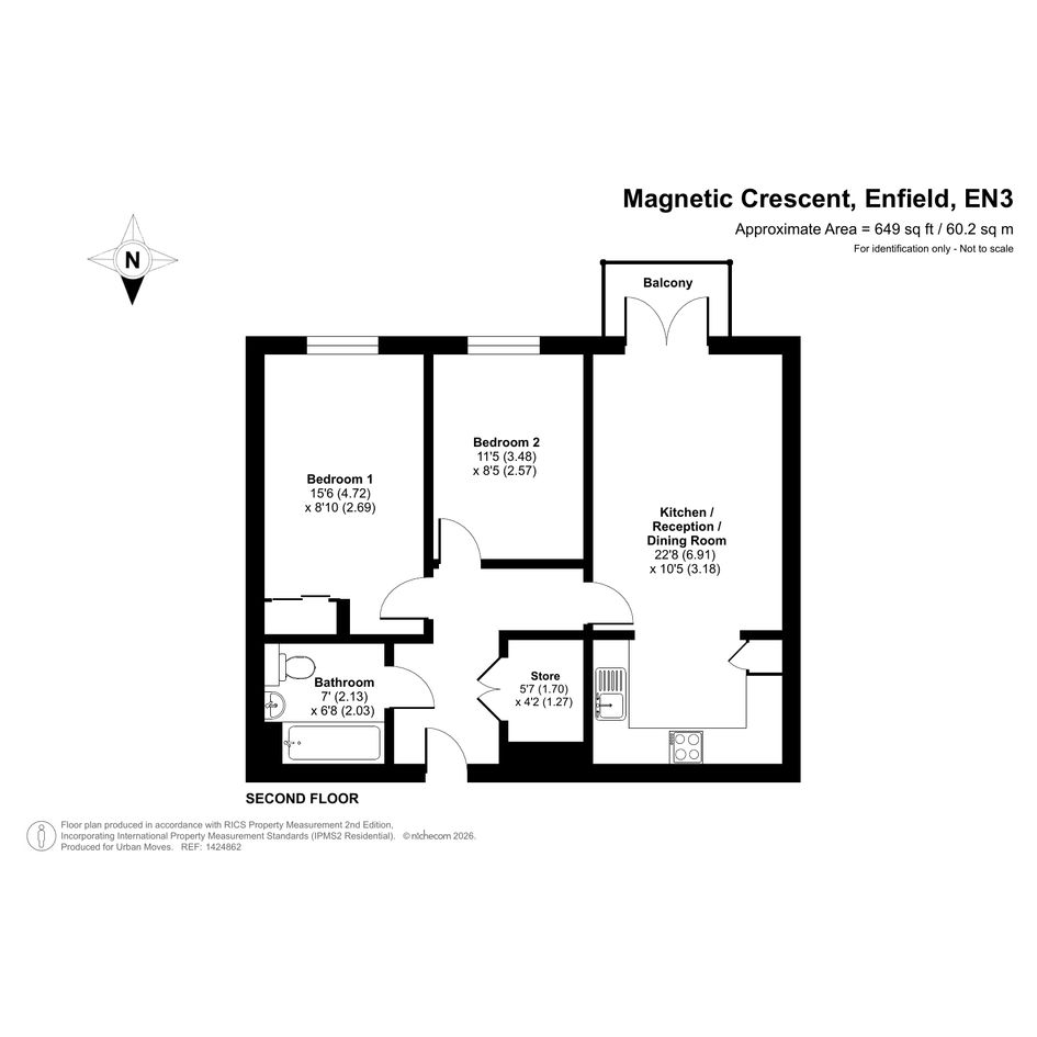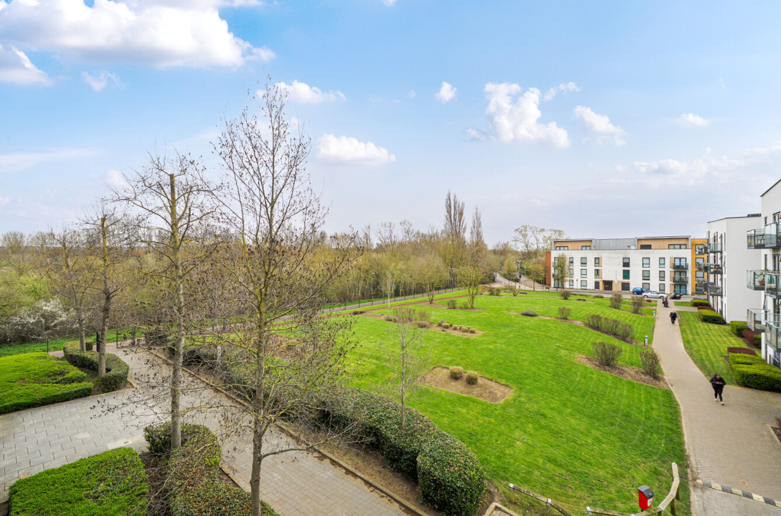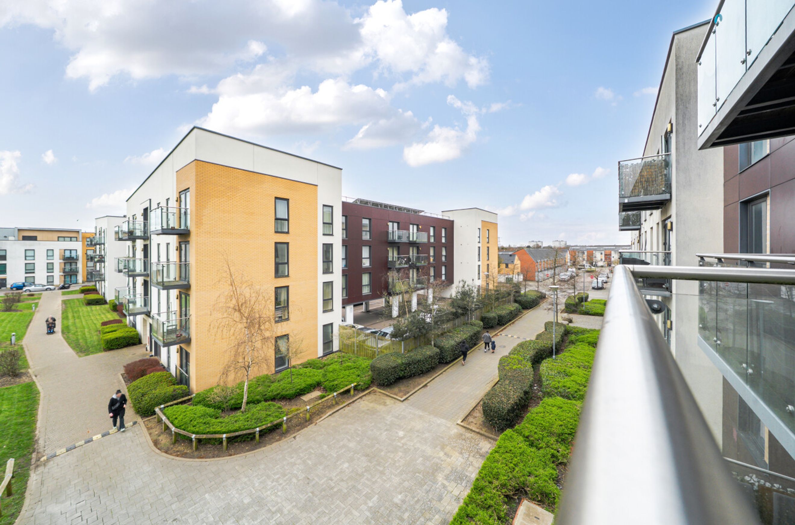 A second-floor flat which occupies a favourable position in this modern development. The property is south facing and overlooks the communal garden. Internal features include a semi-open-plan kitchen with sleek units and pencil-mosaic splashbacks and a living room with wood flooring and double doors that lead to the balcony. There is a spacious main bedroom with fitted wardrobe plus a good-sized second bedroom and a bathroom with combined overhead/hand-held shower. A large storage/utility cupboard has been provided in the entrance hall and well insulated walls, modern double glazing and gas central heating make for a very good energy-efficiency rating. The apartment comes with use of an allocated space within the underground car park and is also just a short walk from Enfield Lock Station.