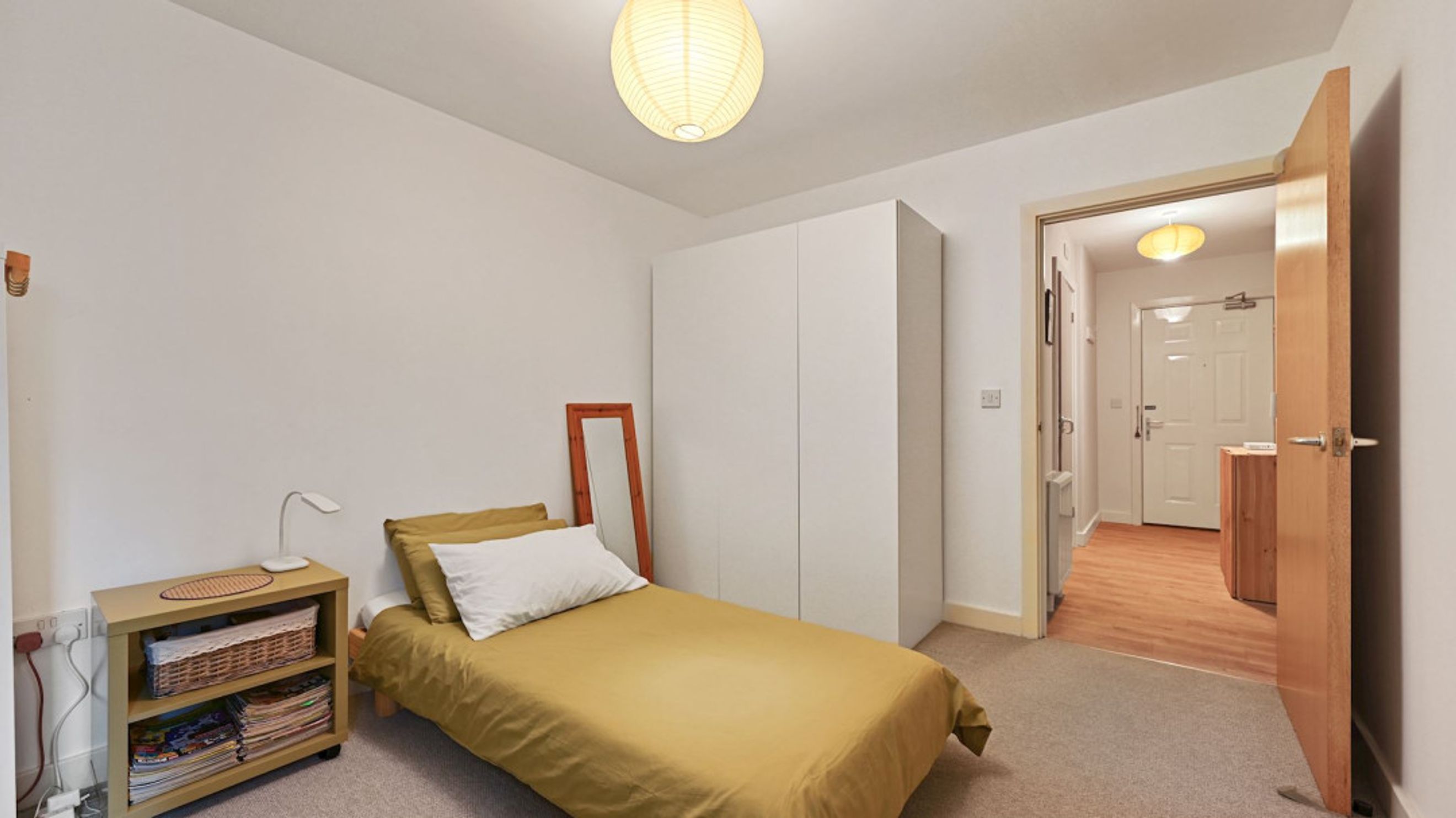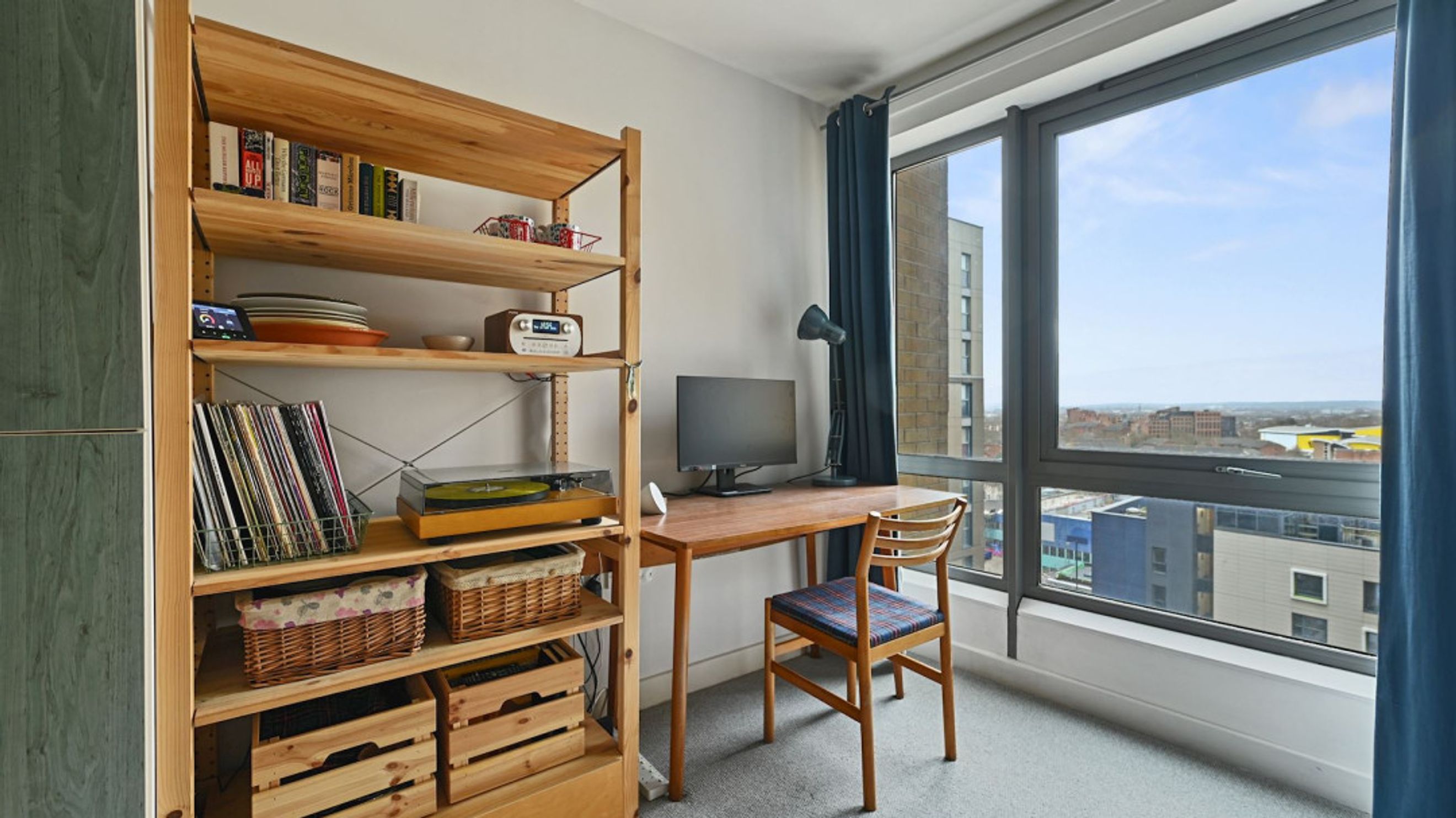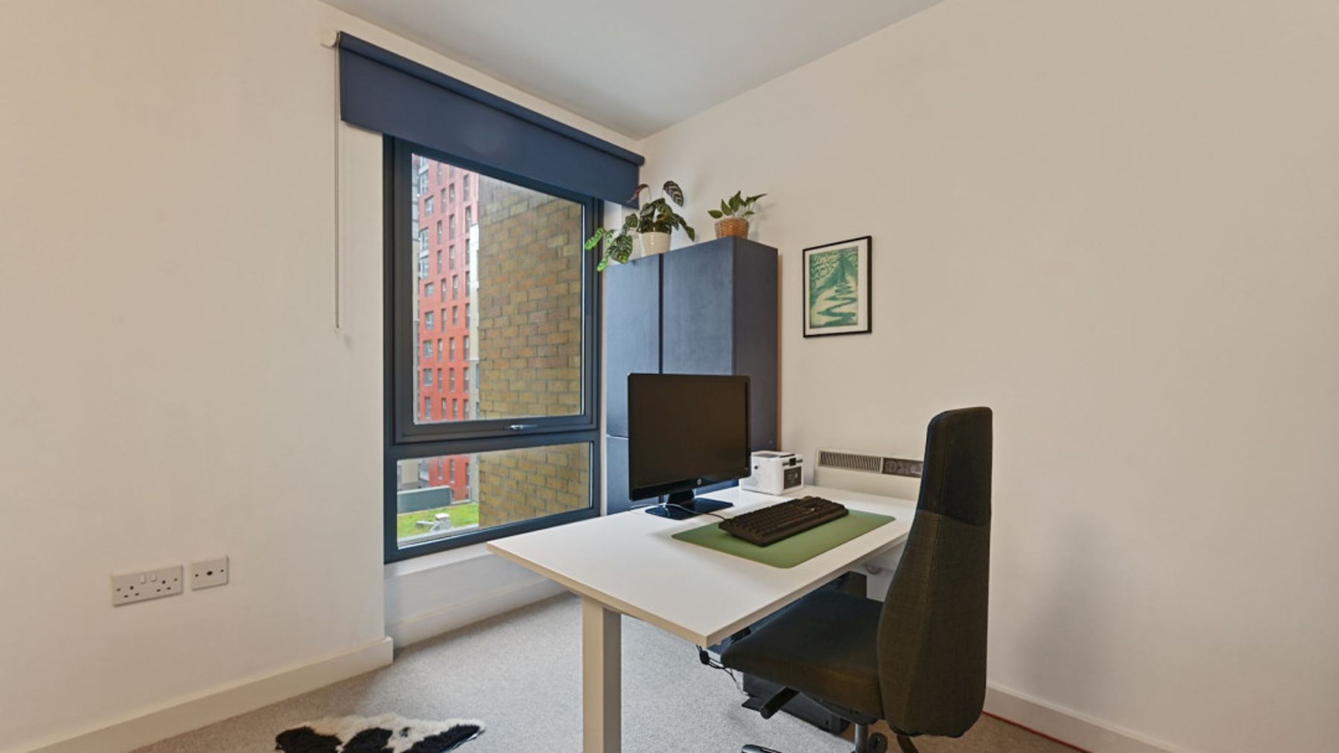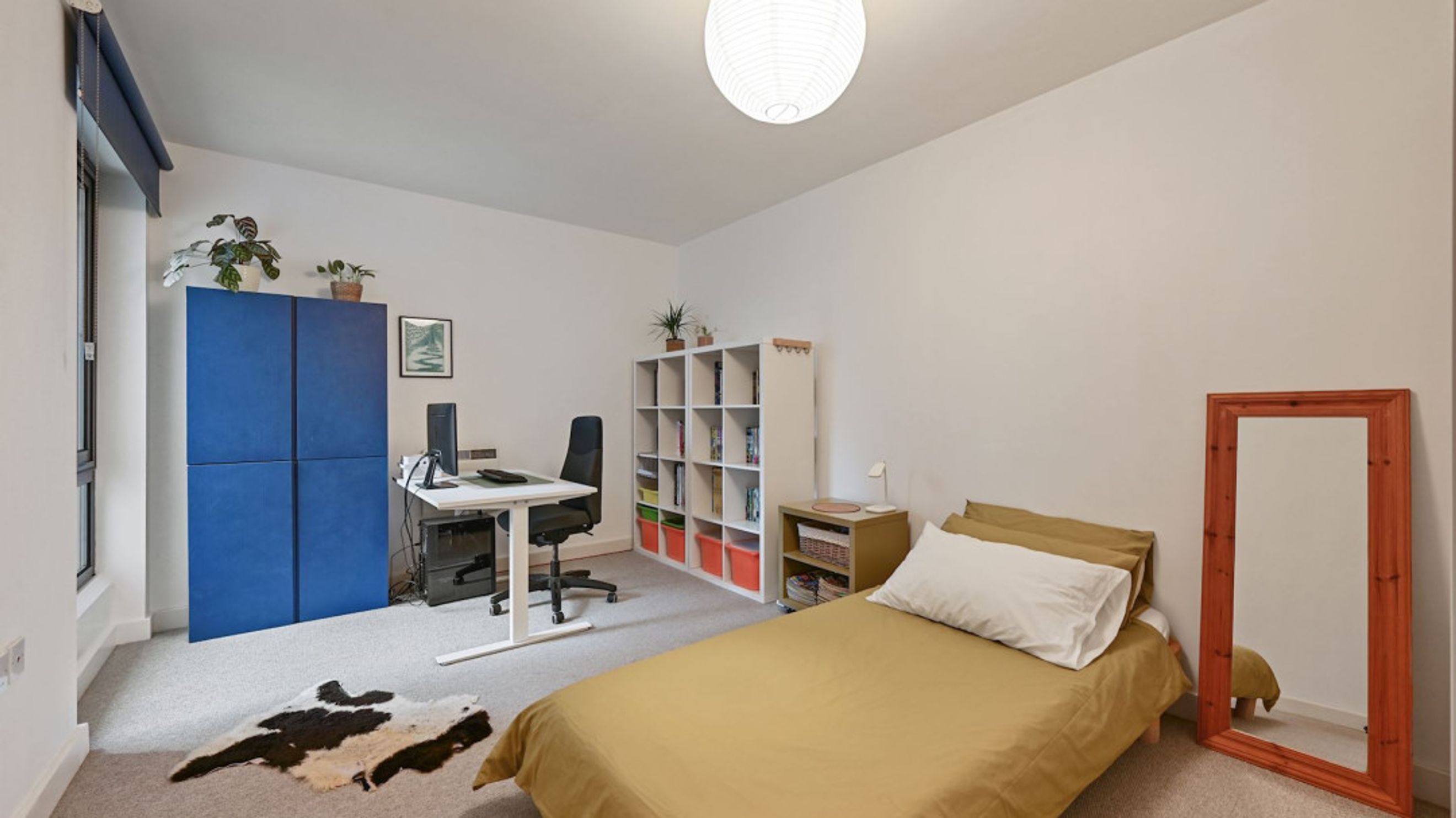 The bedroom is generously proportioned, allowing space for a comfortable home office.