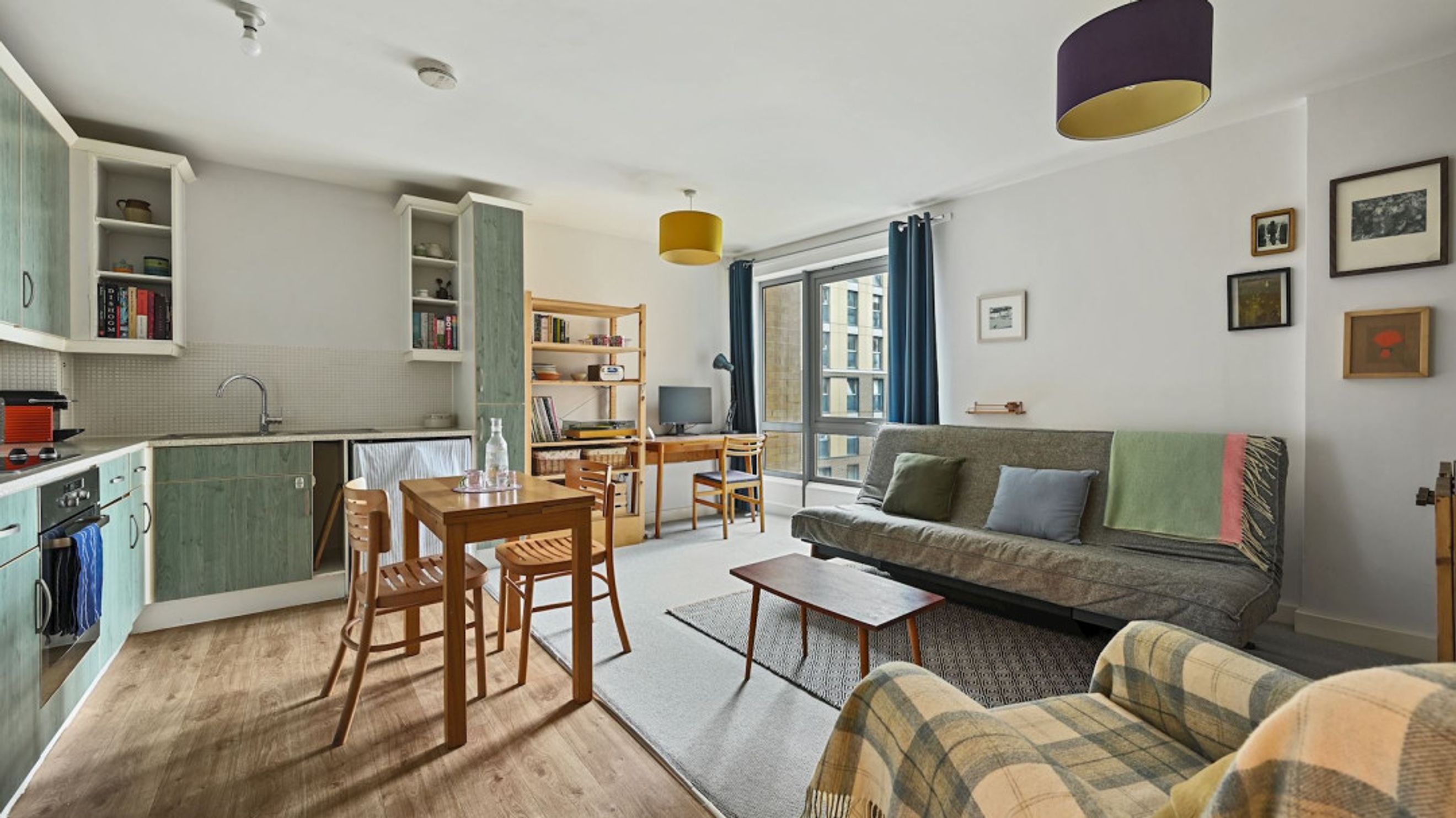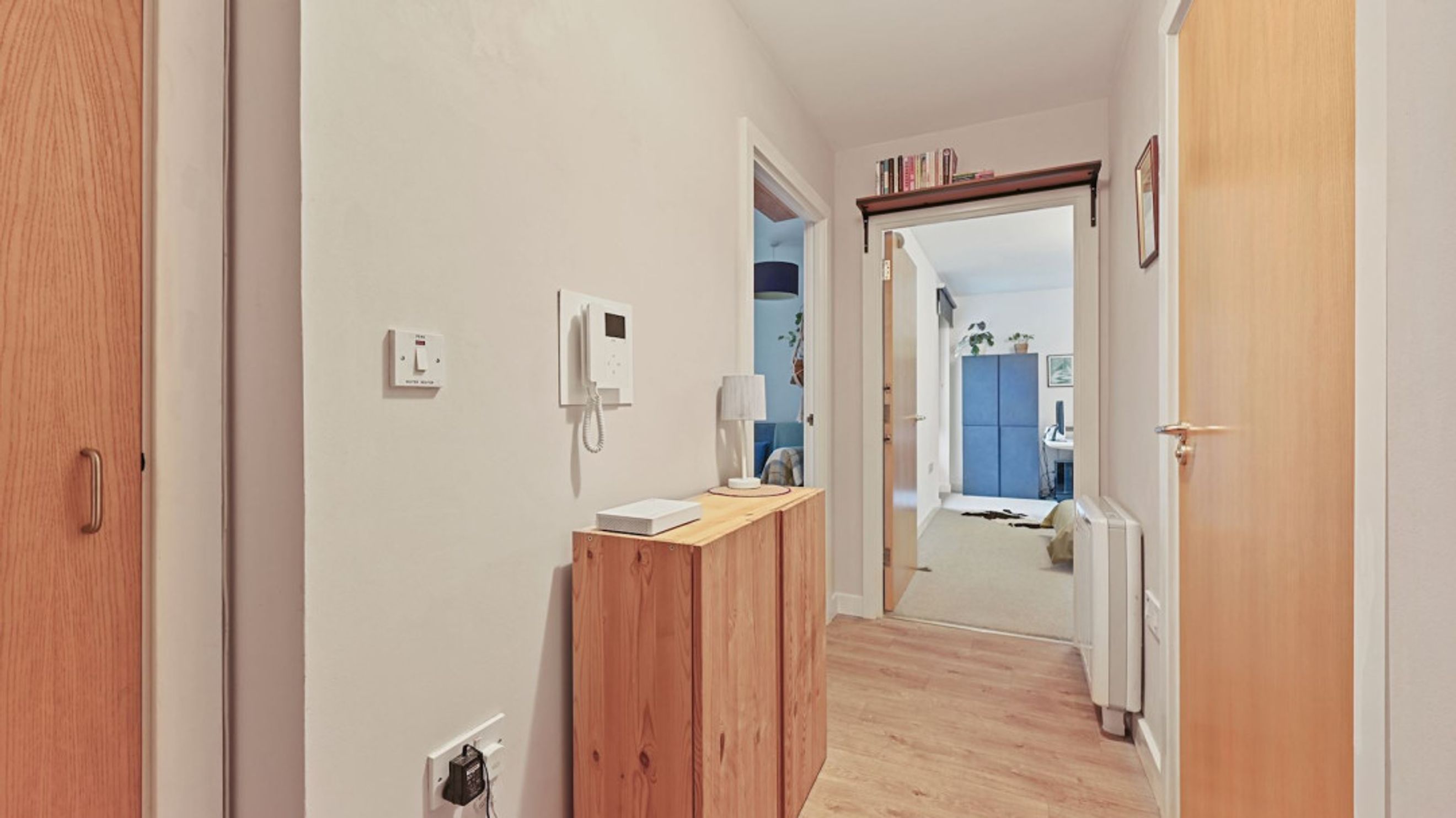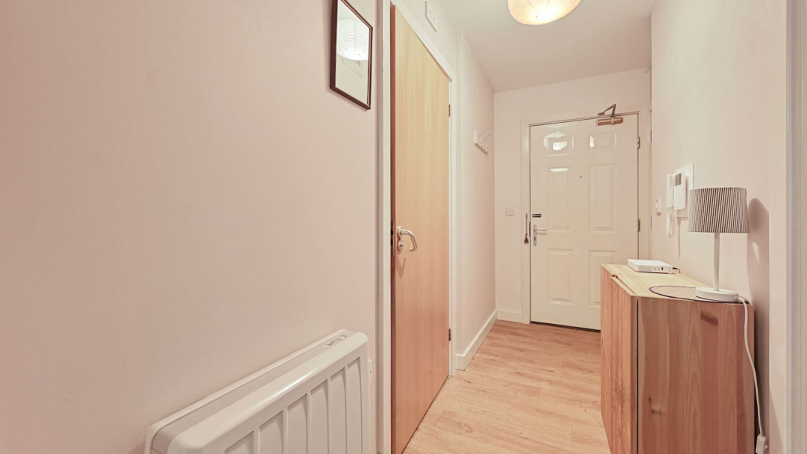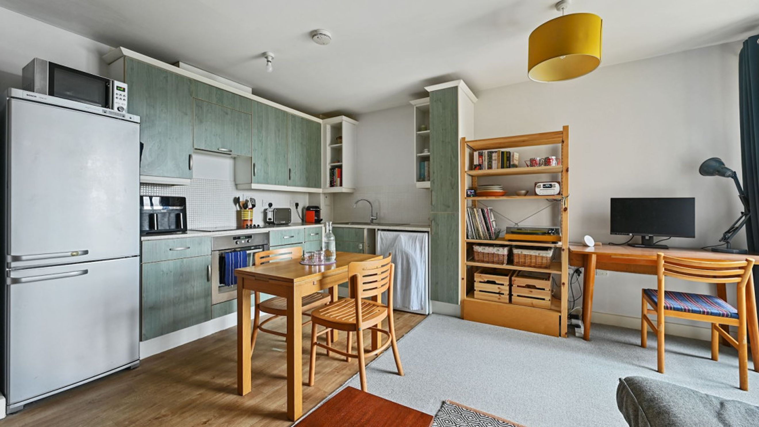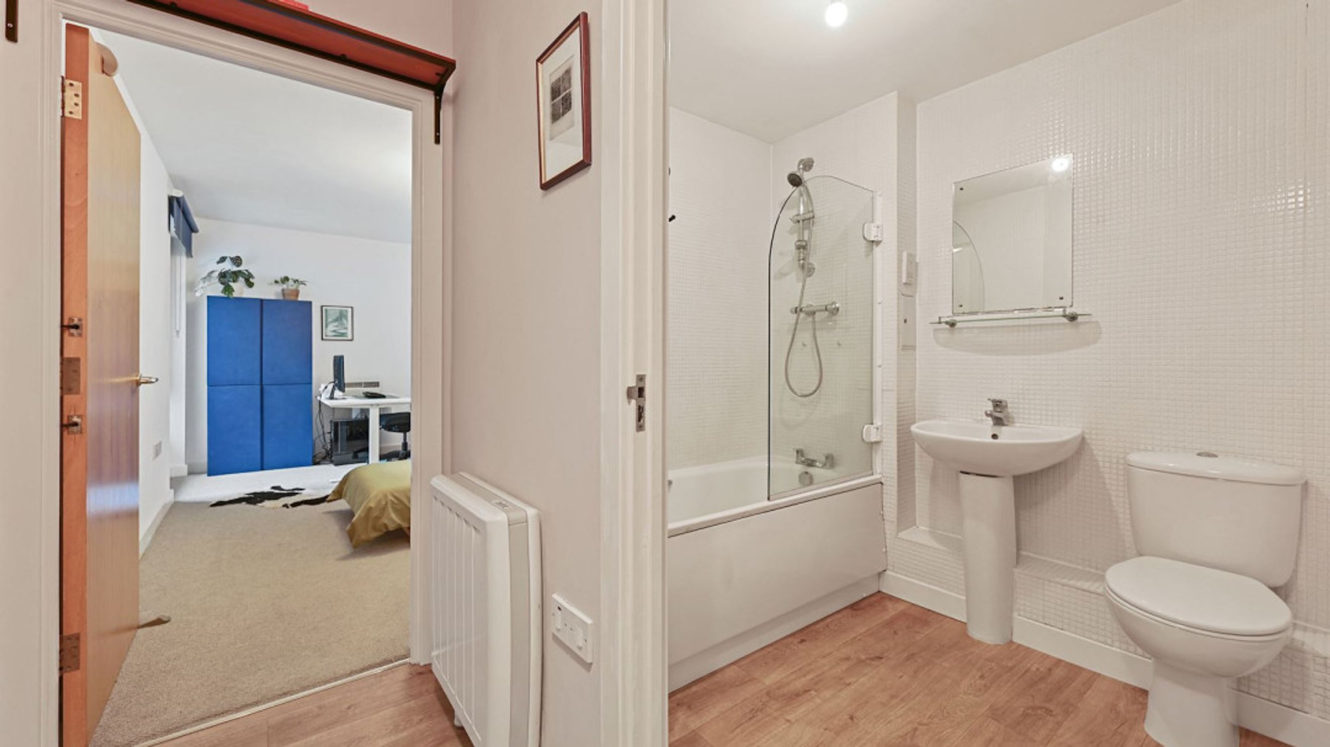 The bedroom is generously proportioned, allowing space for a comfortable home office.