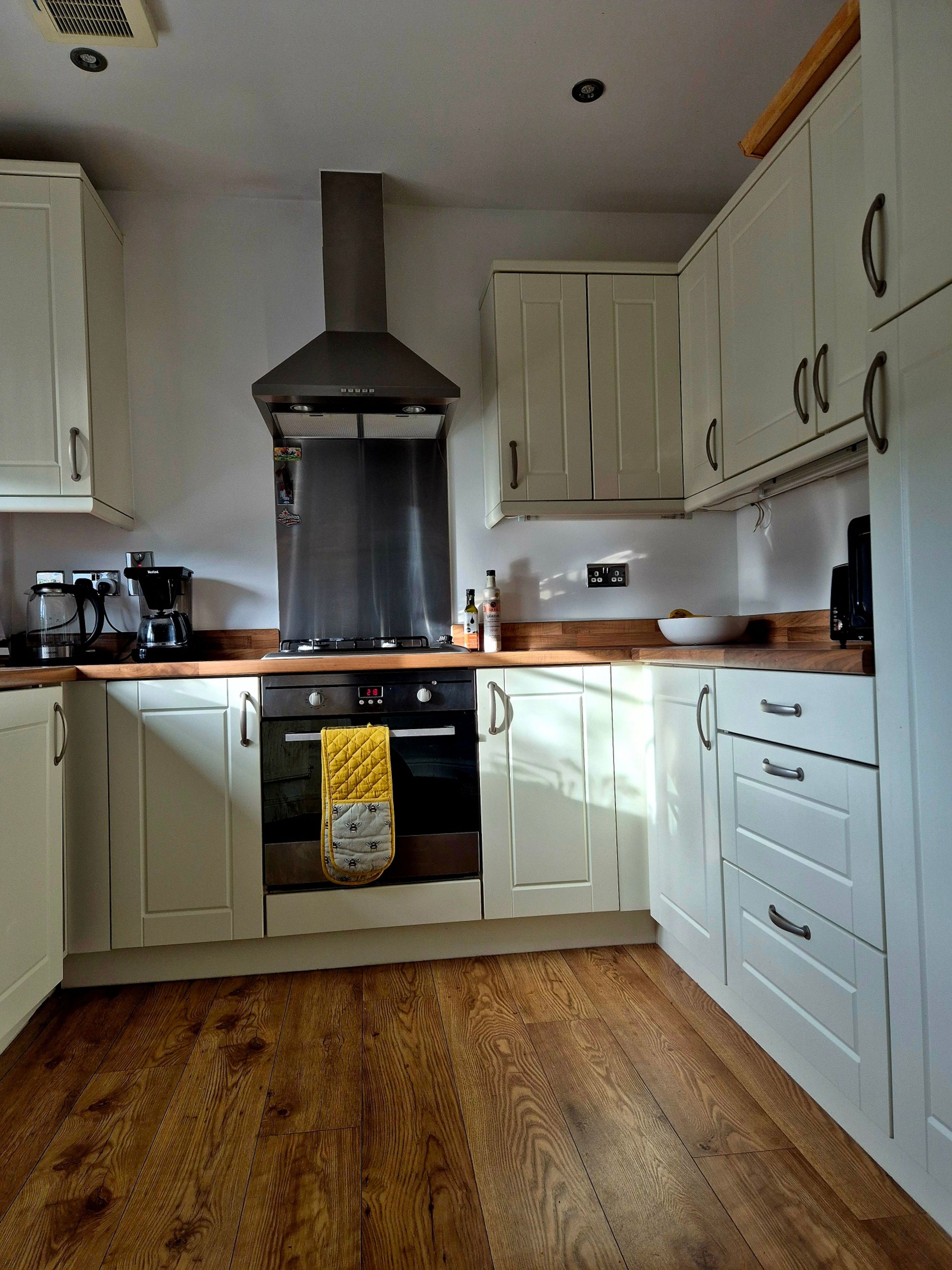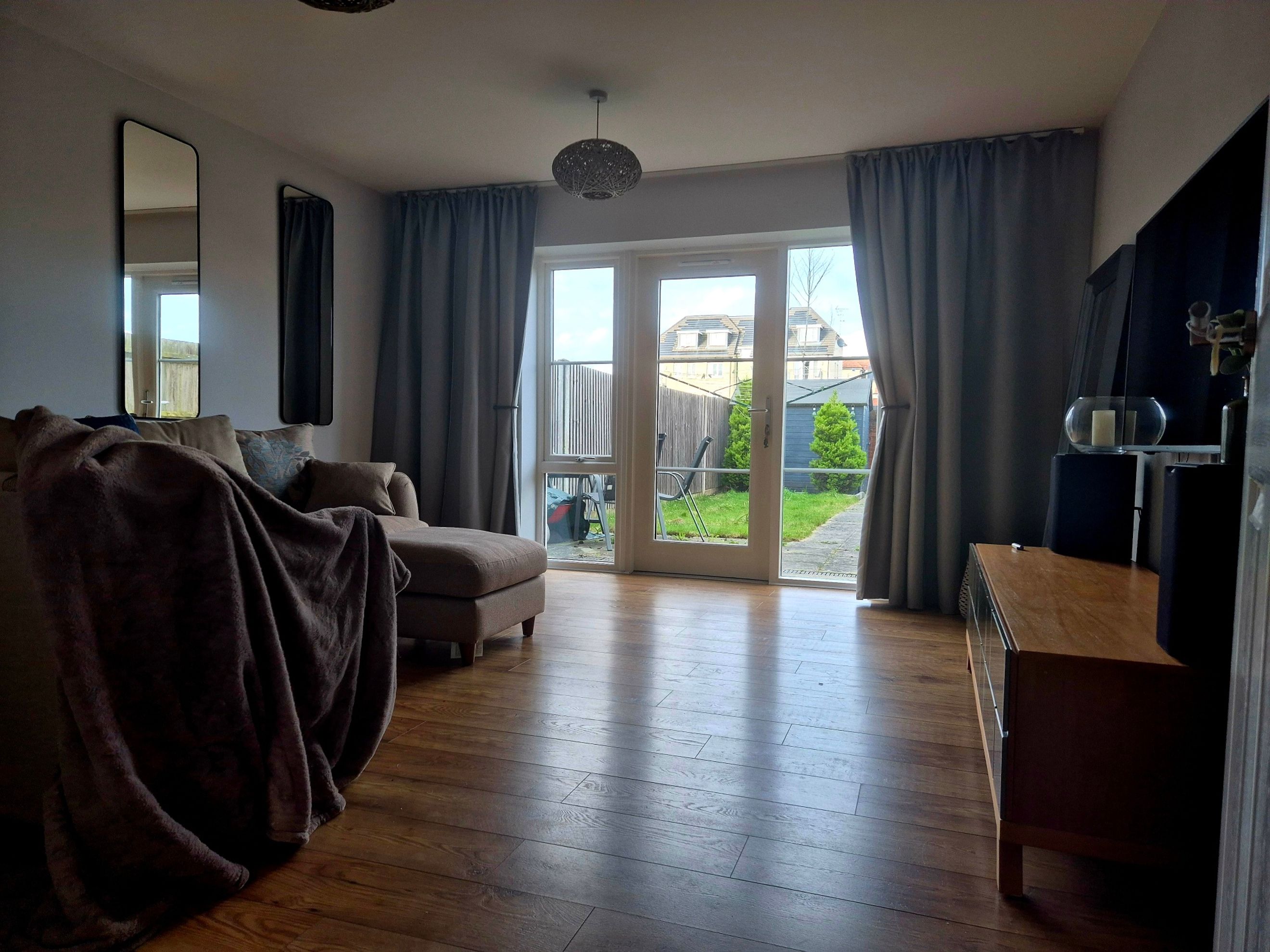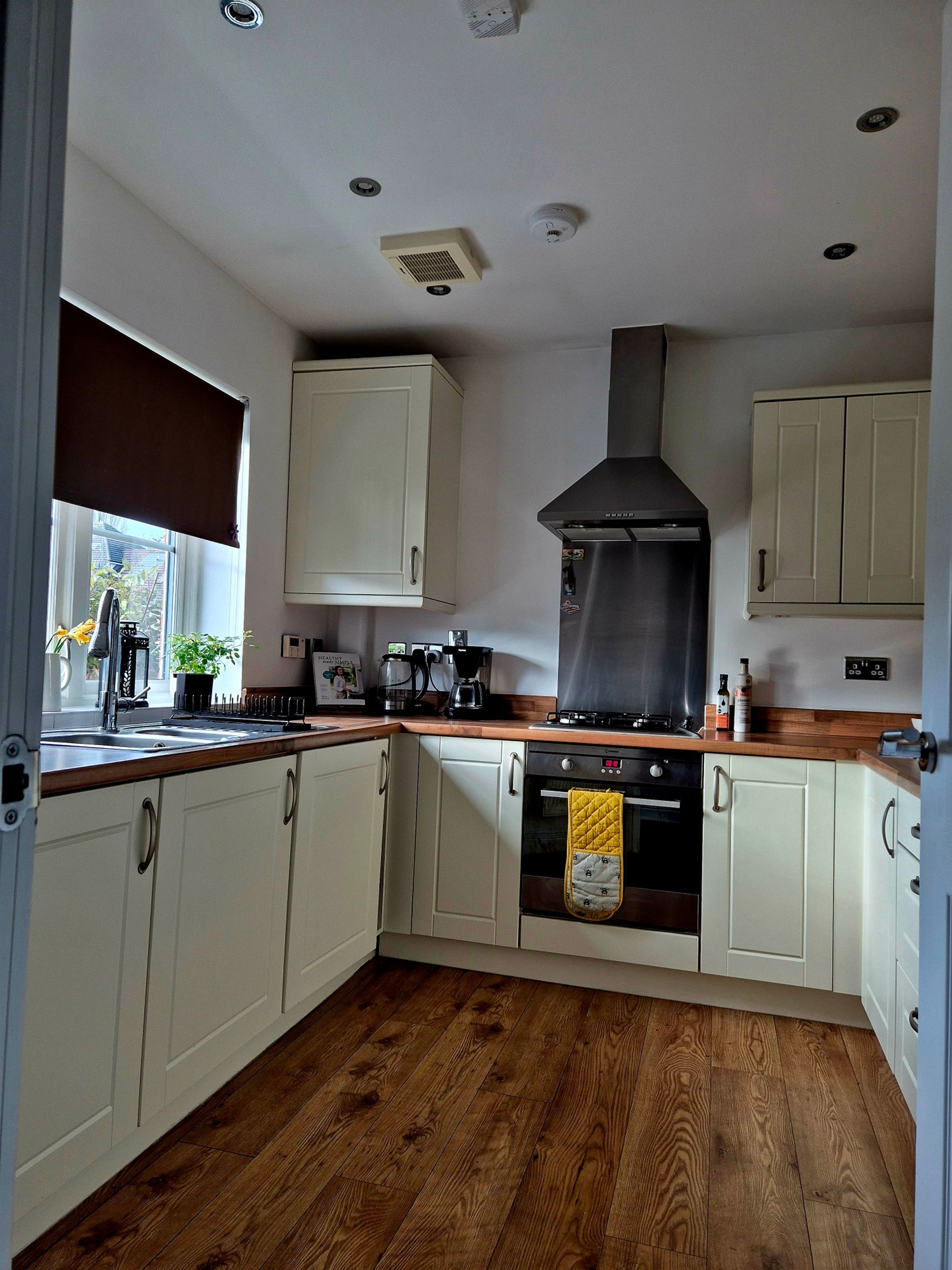 The ground floor includes a spacious lounge/diner with patio doors opening directly onto the rear garden, providing a bright and functional living area. A separate kitchen is fitted with an integrated washing machine, fridge/freezer, oven, hob and extractor fan. A large downstairs WC adds further convenience to the layout.