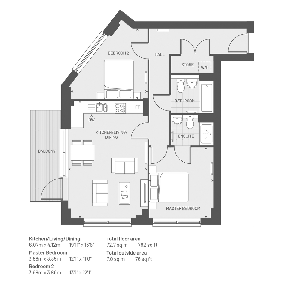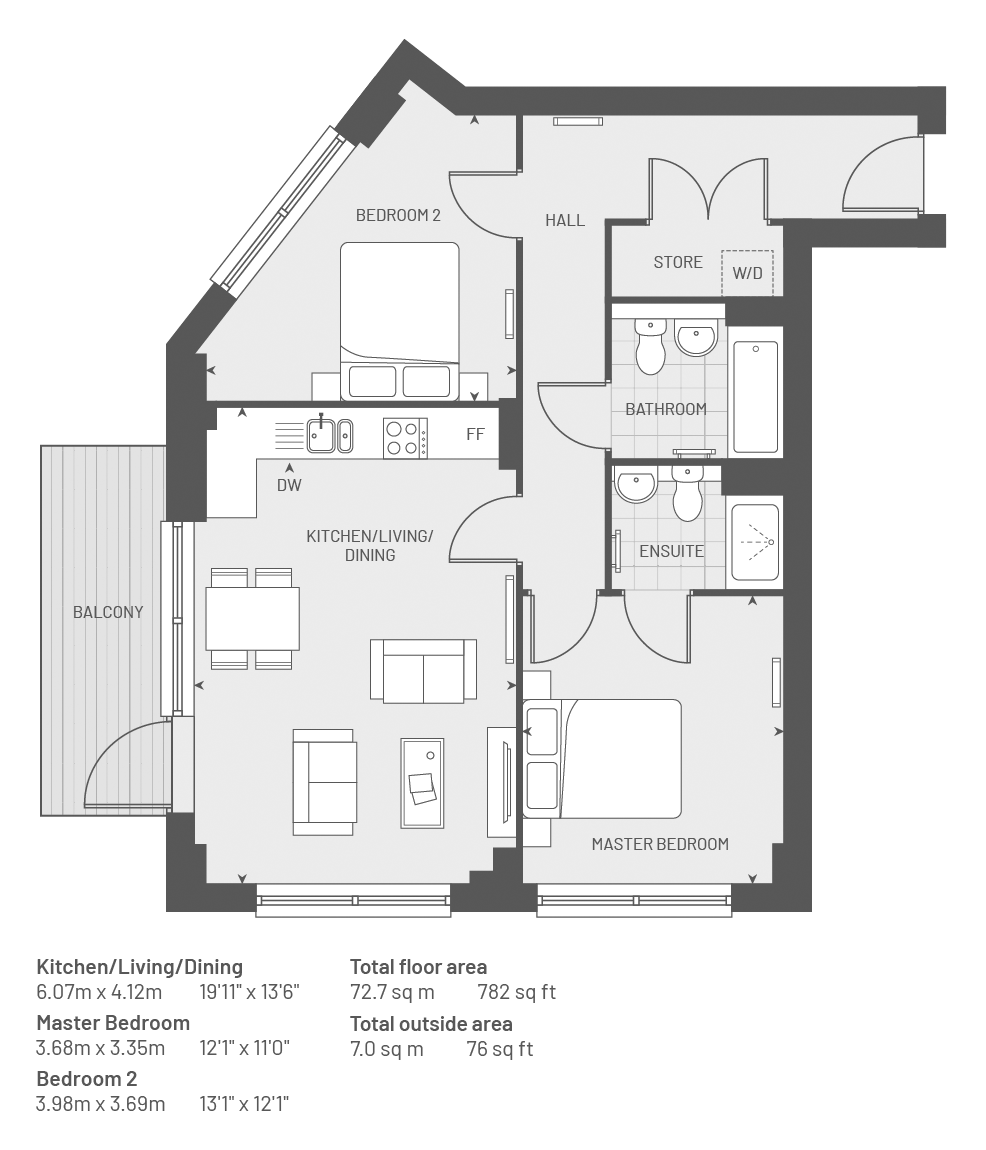 Discover 'The Elder' - A 782 sq ft two-bedroom apartment on the third floor at Southall Grove. It features an open-plan kitchen, living, and dining area with an L-shaped kitchen, Quartz 'Salt & Pepper' worktops, integrated appliances, and modern cabinetry. Amtico Spacia 'Sun Bleached Oak' flooring runs throughout the living space and has lots of natural light.
