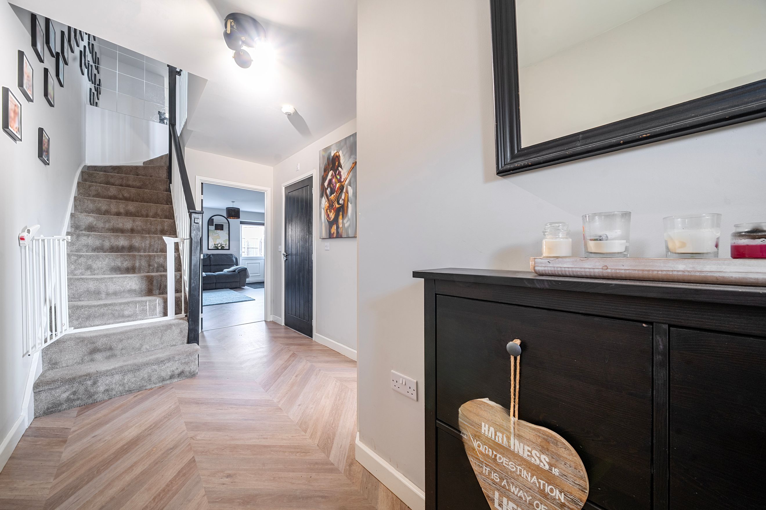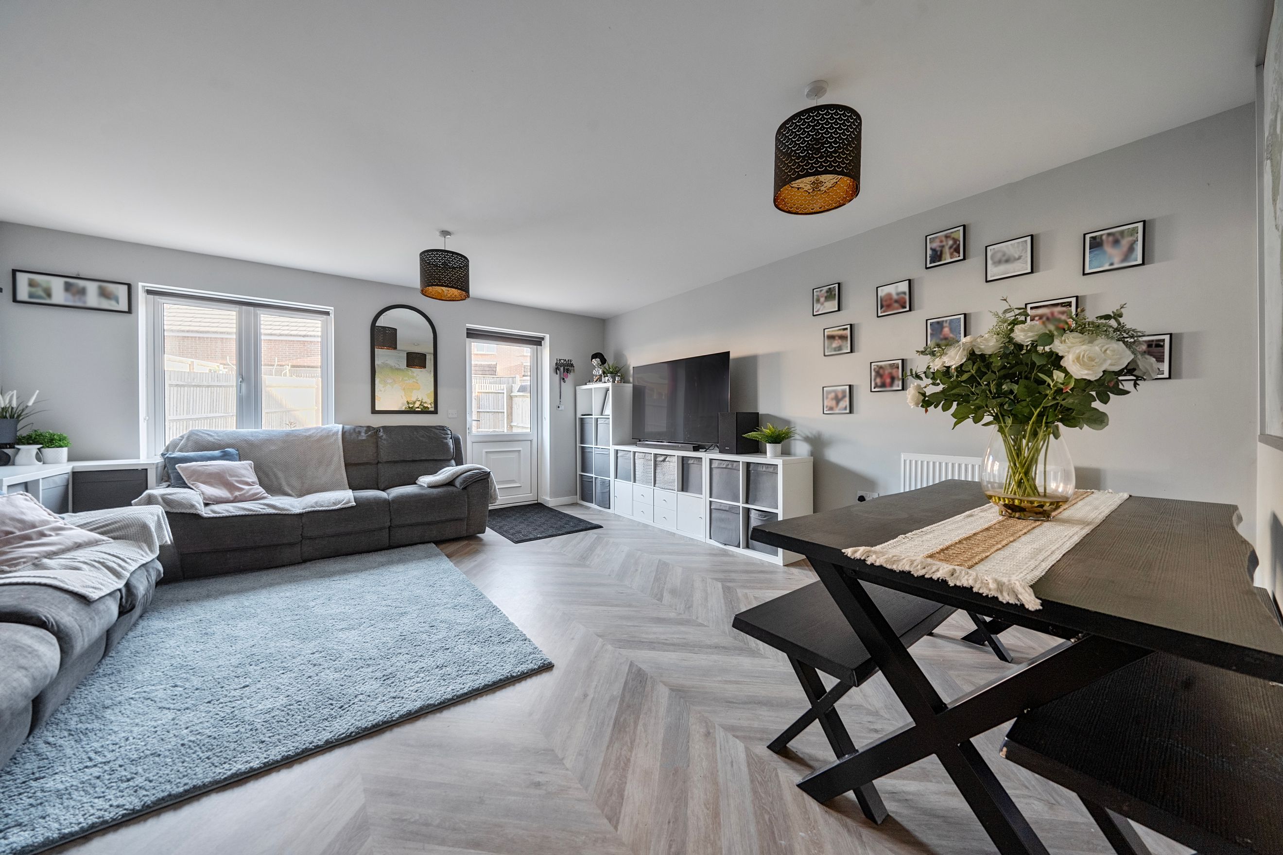 The ground floor features a welcoming entrance hall leading into a bright and spacious living and dining area, perfect for both relaxing and entertaining. The kitchen is thoughtfully arranged with ample storage and workspace, with convenient access to the rest of the home. The overall layout provides a natural flow between rooms, creating a warm and inviting atmosphere.