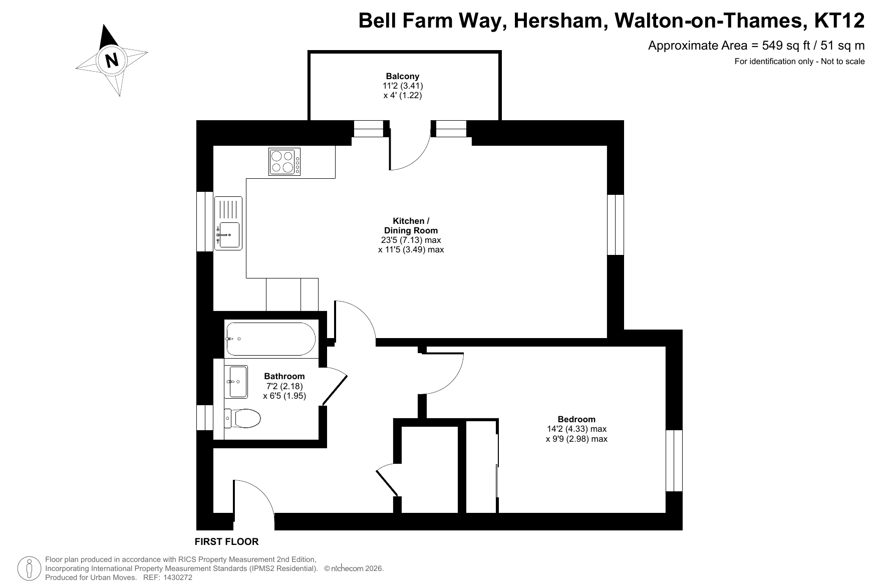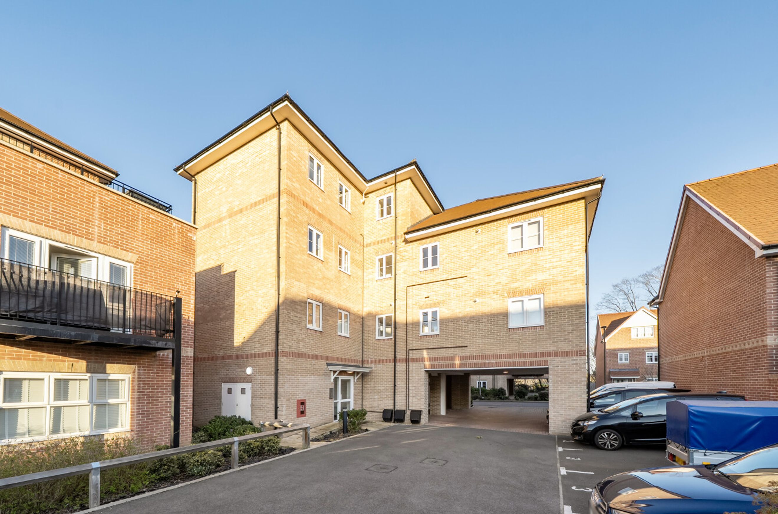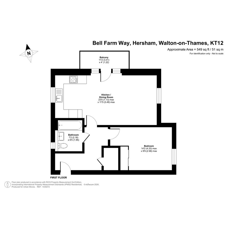 This stylishly-presented flat is on the first floor of a recently-constructed block and has a twenty-three-foot reception room with windows on three sides and a door that leads out onto the balcony. The open-plan kitchen area features smart-looking units and integrated appliances. There is a good-sized bedroom with fitted, mirror-fronted wardrobe; an attractive, naturally-lit bathroom and a large storage/utility cupboard has been provided in the entrance hallway. Well insulated walls, high performance glazing and a modern gas central heating system have resulted in a very good energy-efficiency rating. The flat comes with use of a parking space and is also just a short walk, or even shorter bike ride, from Walton-on-Thames Station which offers rail services to a number of destinations including frequent trains in to London Waterloo.