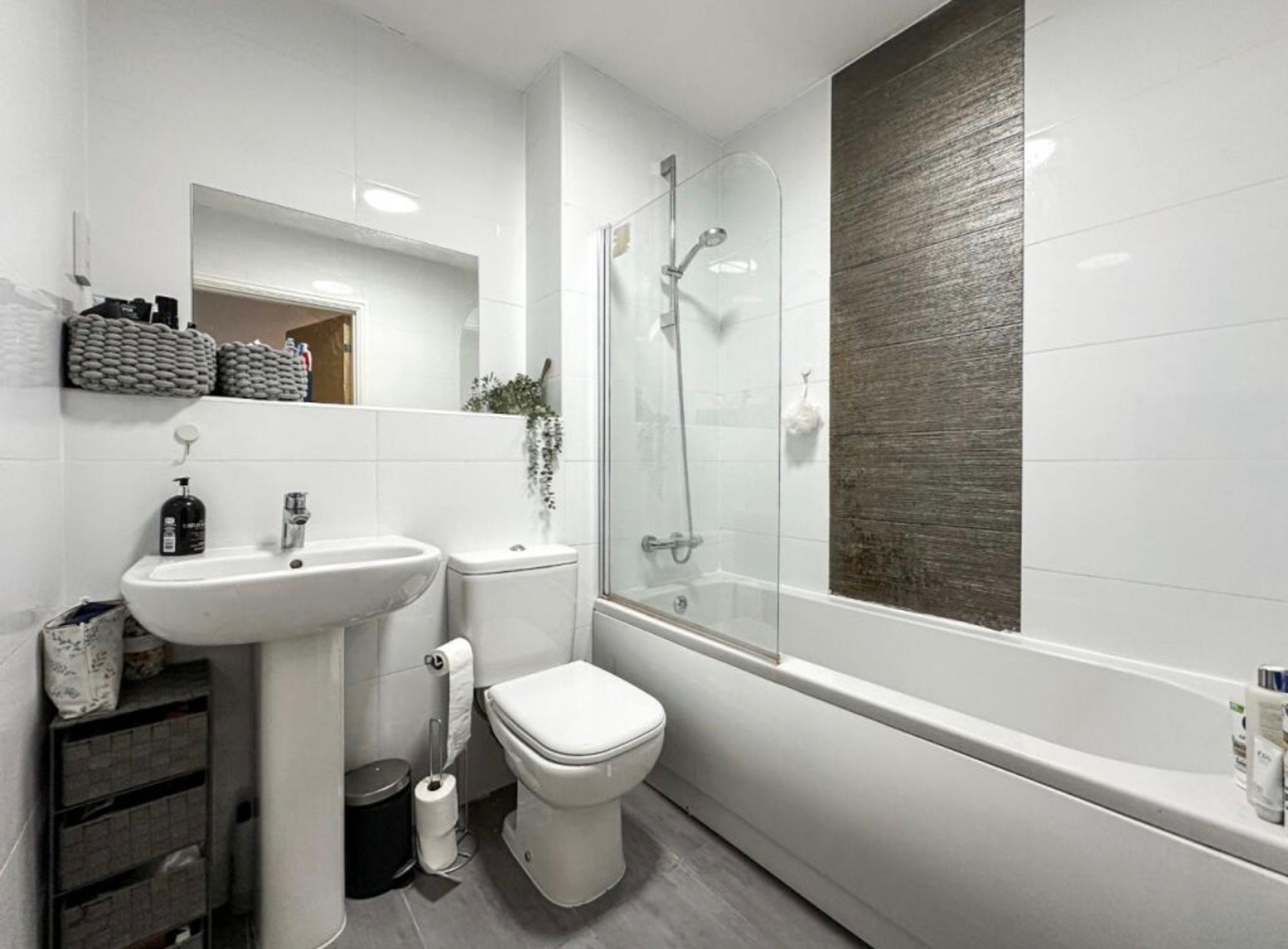Adjacent to the bedroom, the modern bathroom is fitted with high-quality fixtures, including a bath with an overhead shower, a basin, and a WC.