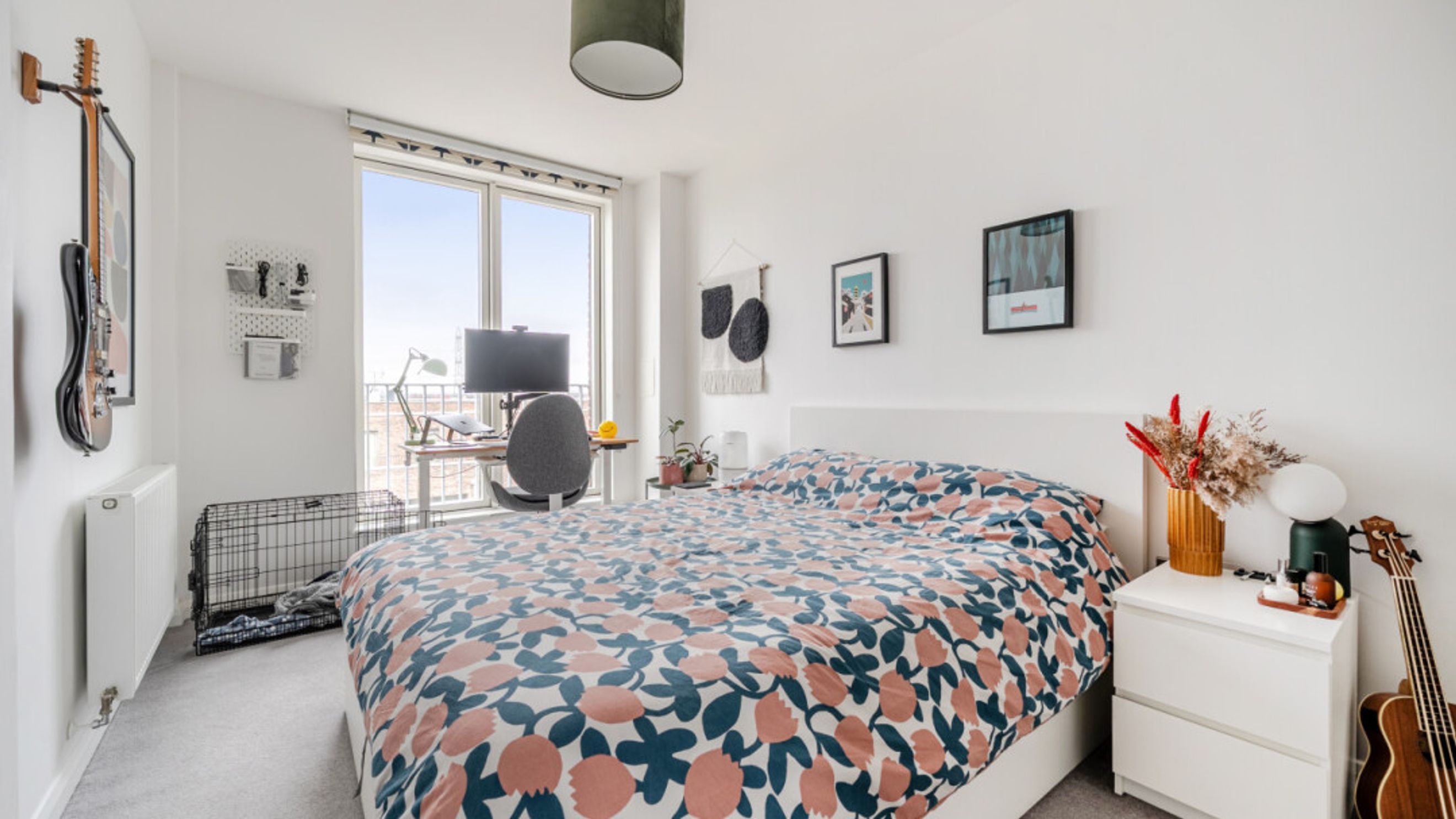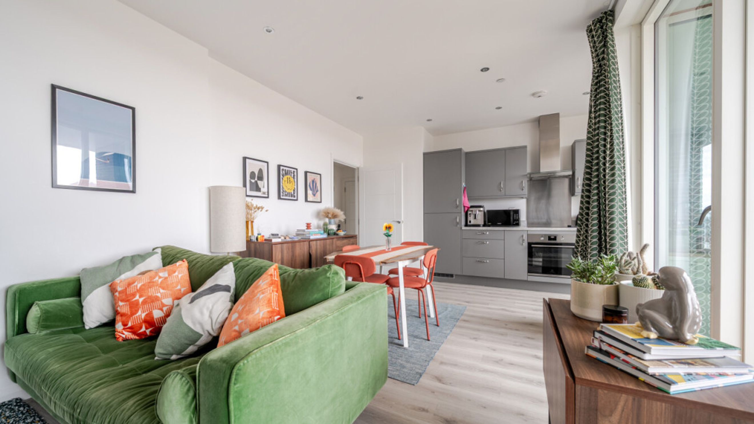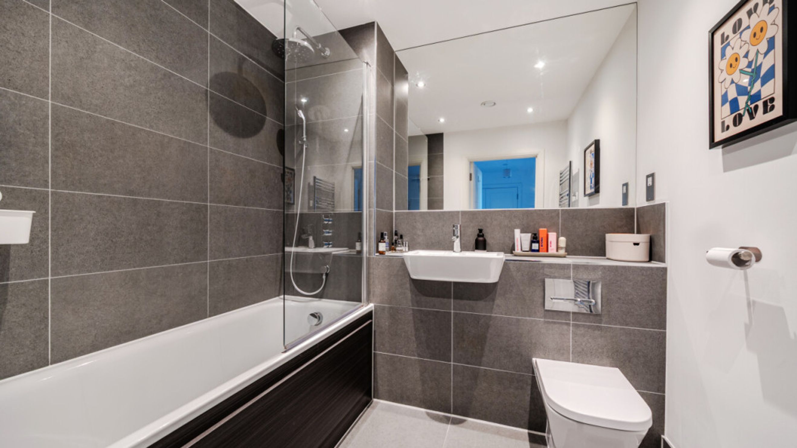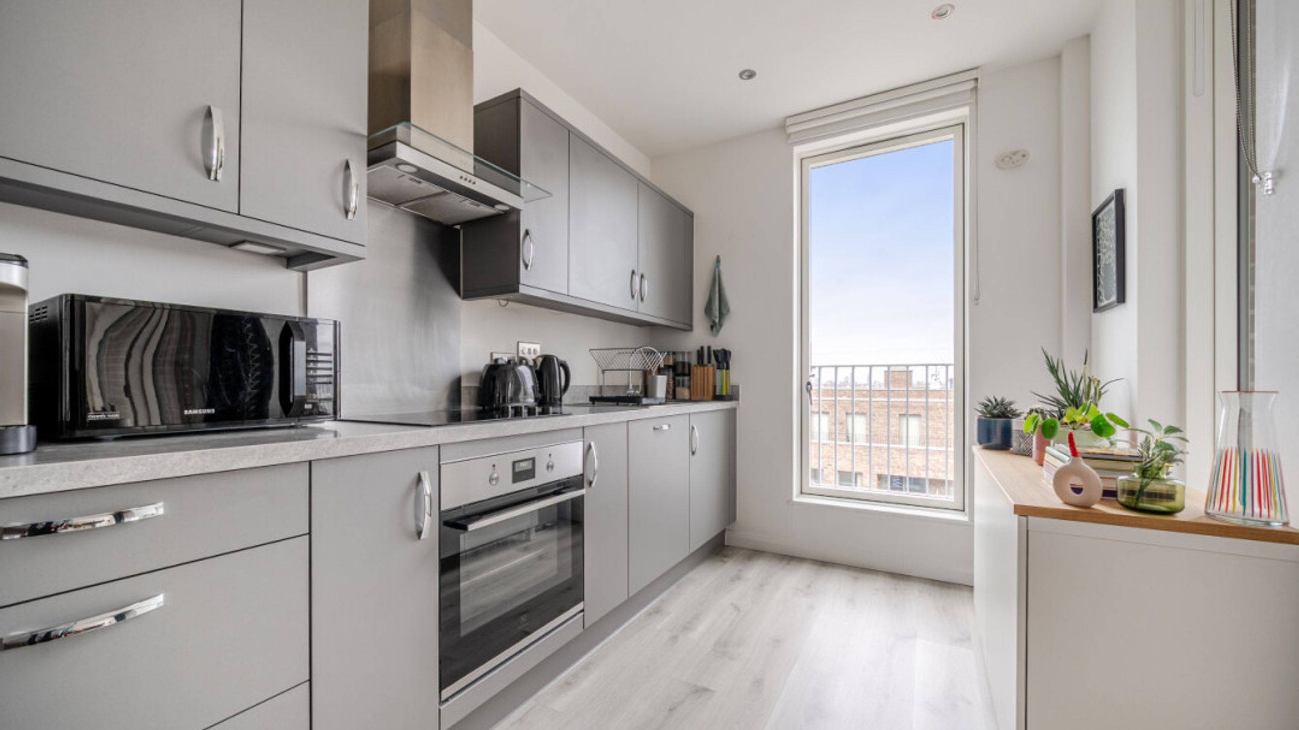 Enter this spacious west facing apartment via a generous hallway with storage. To your left find a well proportioned bedroom with built in storage. To your right, a door takes you into the L-shaped open-plan kitchen and living area, flooded with natural light from wide floor-length windows and a private balcony large enough for a table and chairs and recliners. The kitchen is fitted with matt grey wall and base units, with under-cupboard lighting, and a white stone effect worktop amd also benefits from integrated appliances including a fridge freezer, oven, hob, extractor fan and dishwasher. A contemporary bathroom with a white three-piece suite with a shower over bath and a tile surround completes the accommodation.