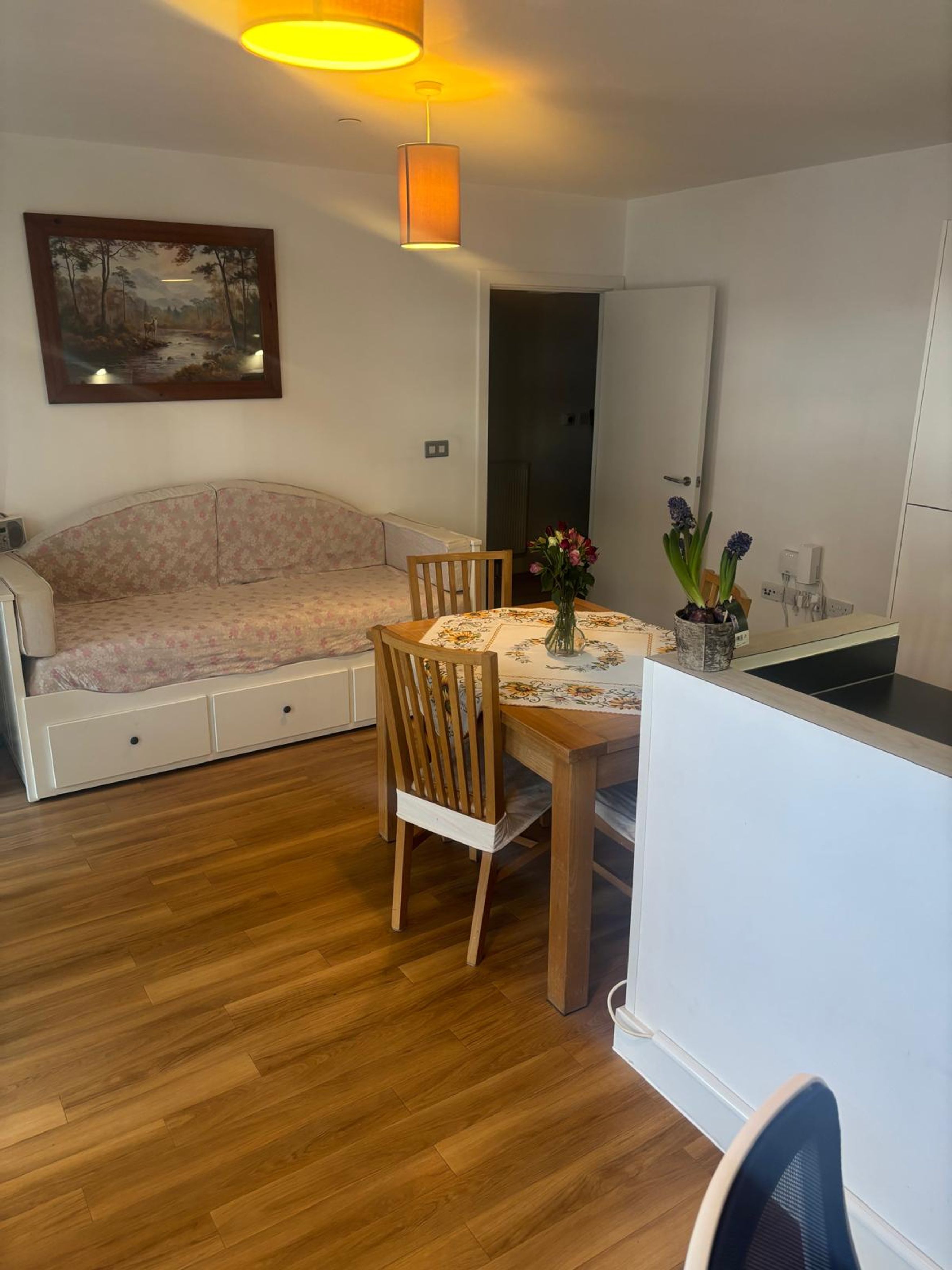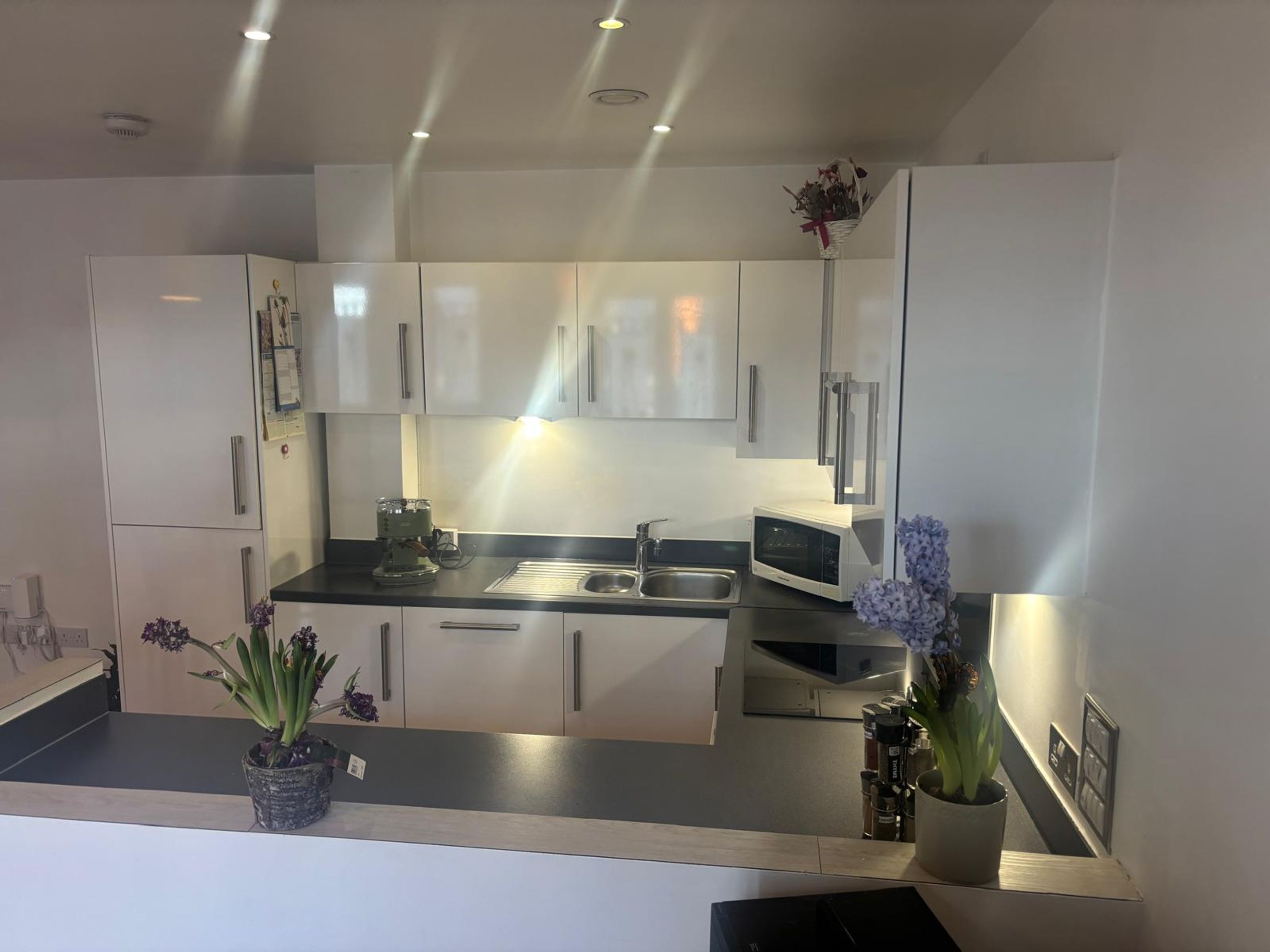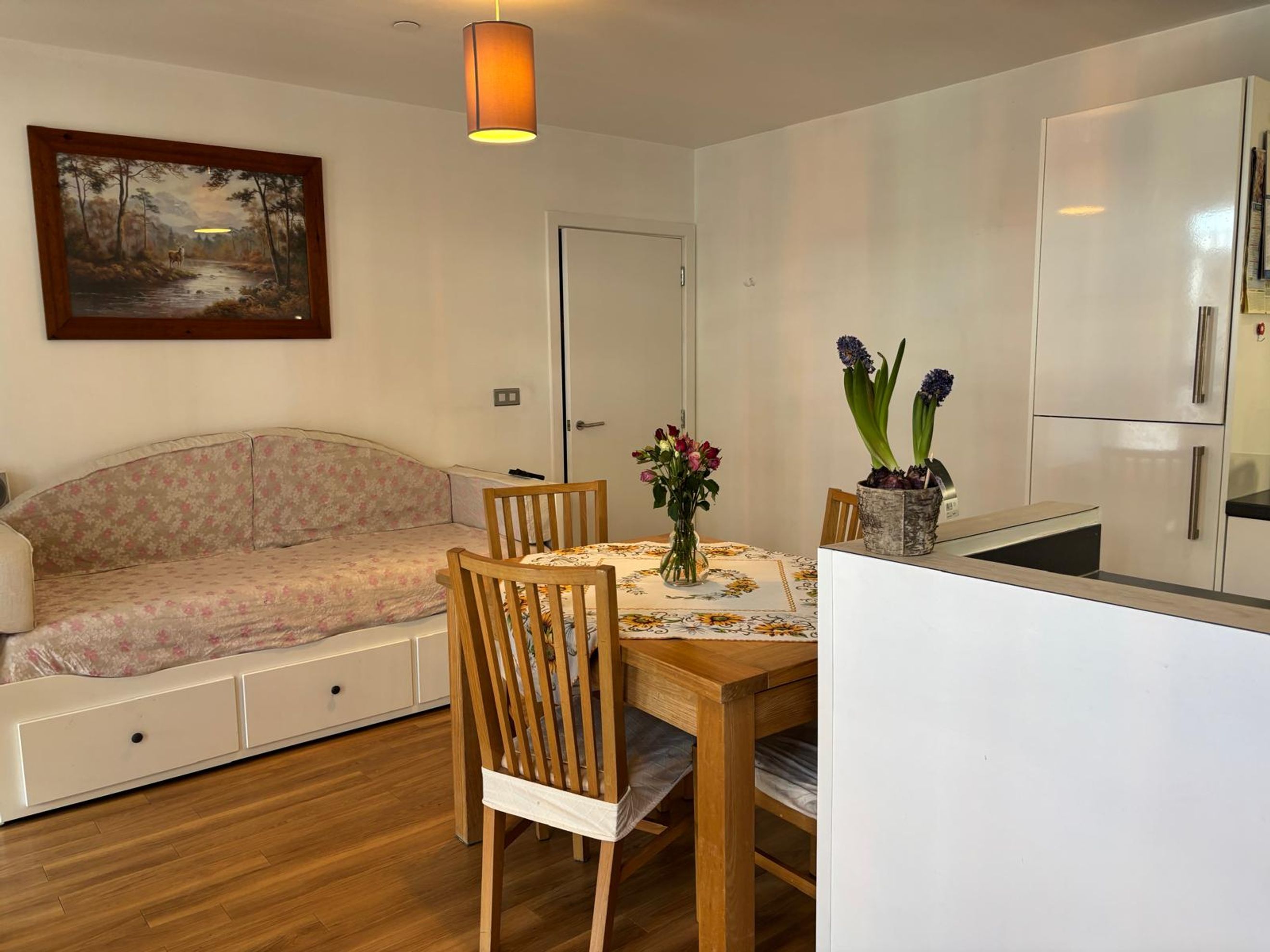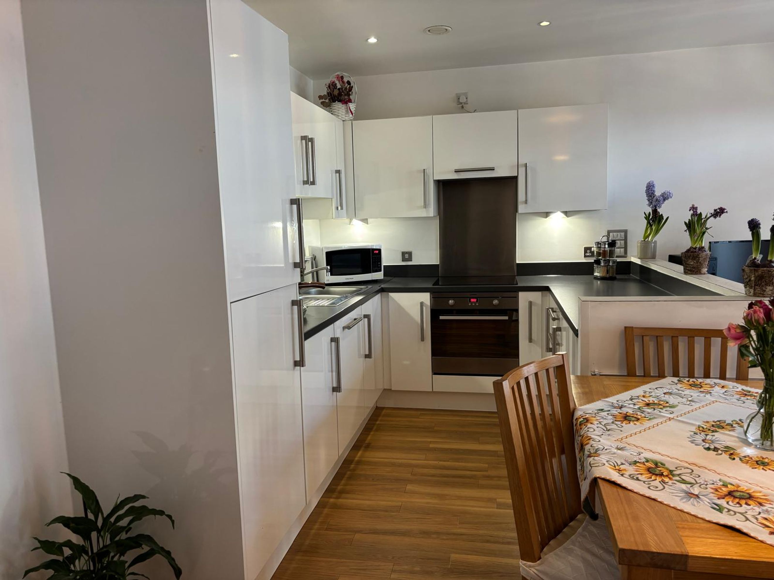 The apartment welcomes you via a private entrance hall, leading into a bright and spacious open-plan kitchen, dining, and living area. The contemporary fitted kitchen is fully integrated, creating a practical yet sociable environment—ideal for both everyday living and entertaining.