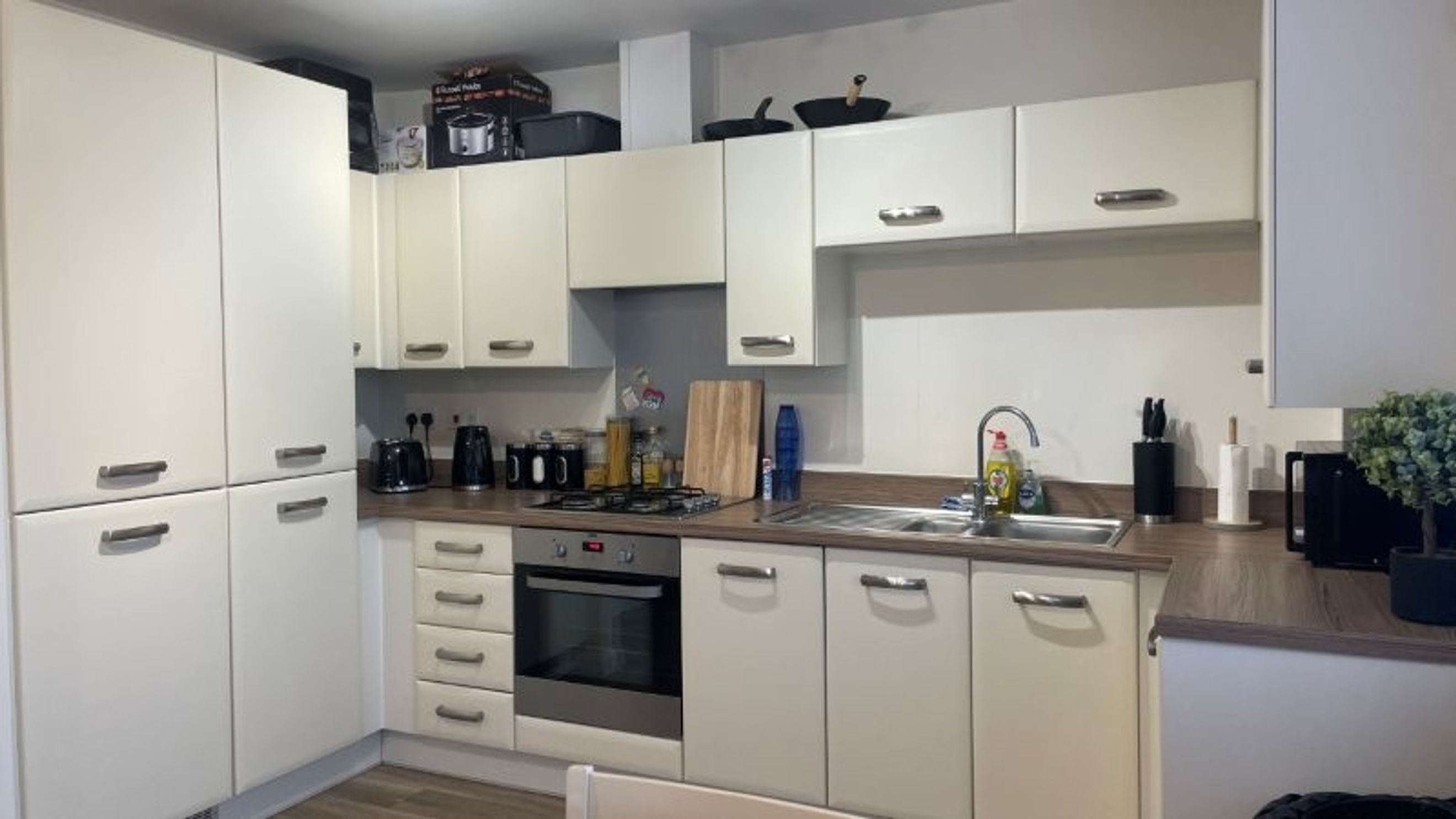 - Fully integrated kitchen with fridge/freezer, gas hob and oven, extractor fan, dishwasher, and washer/dryer