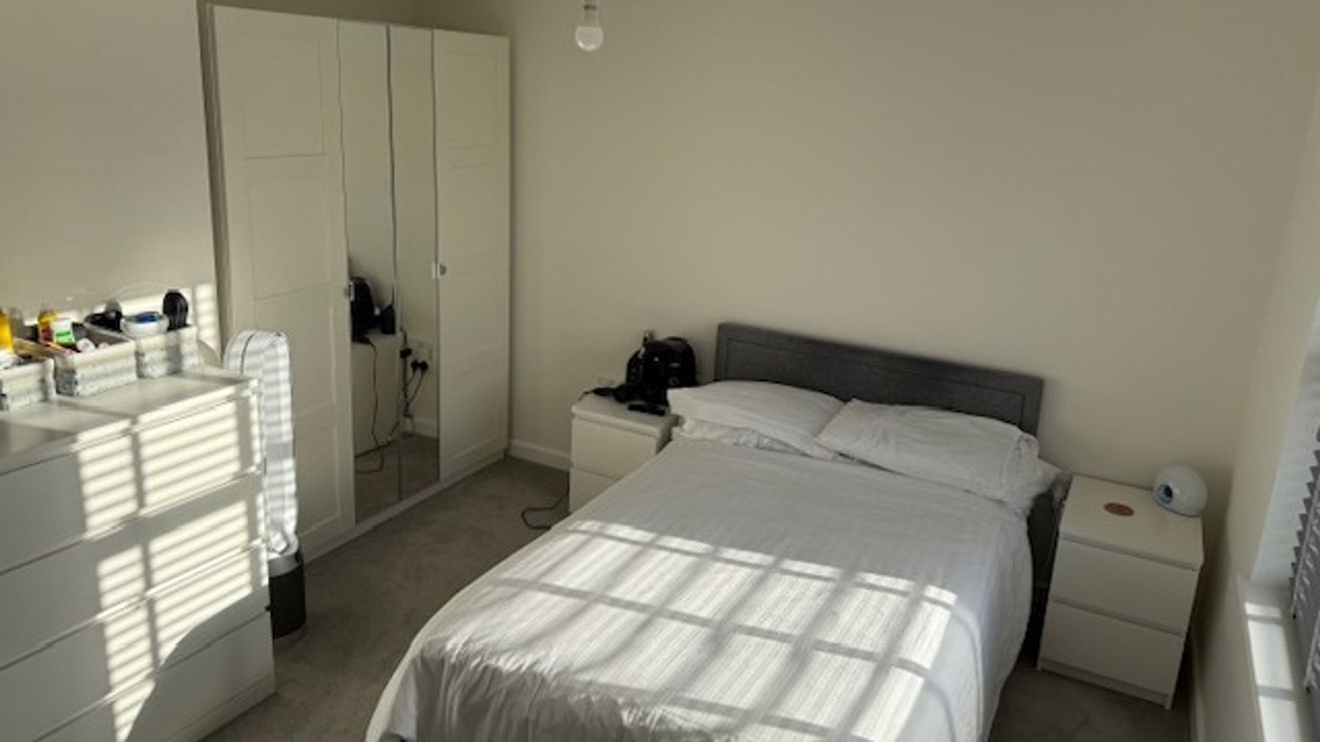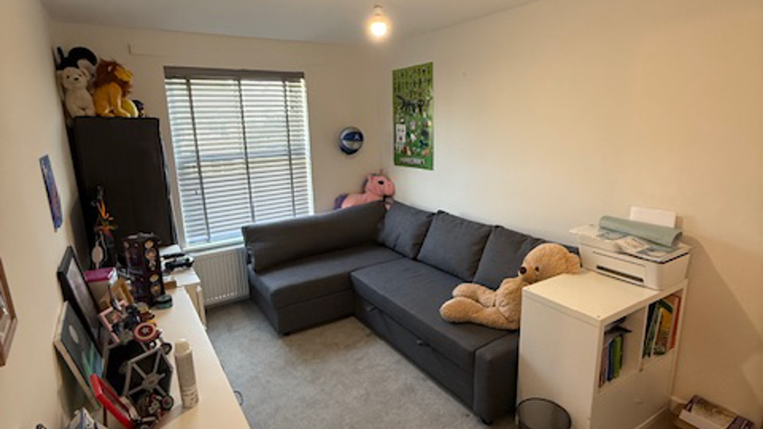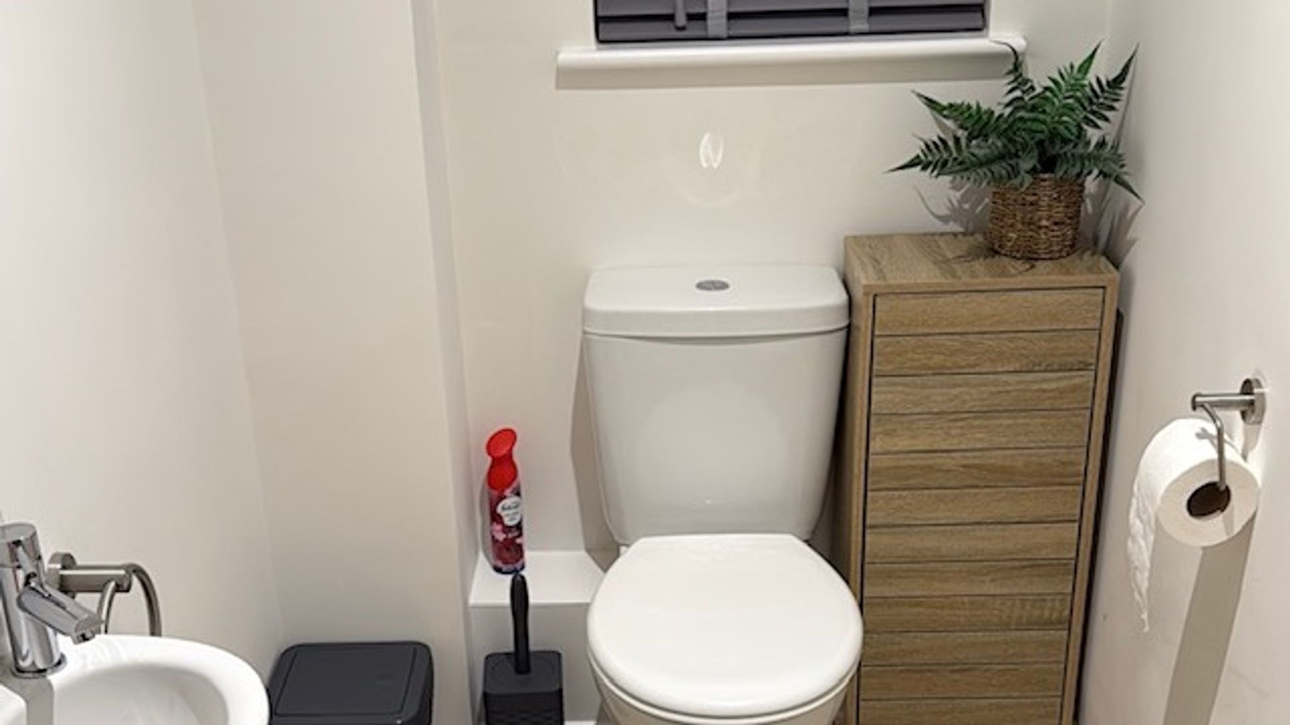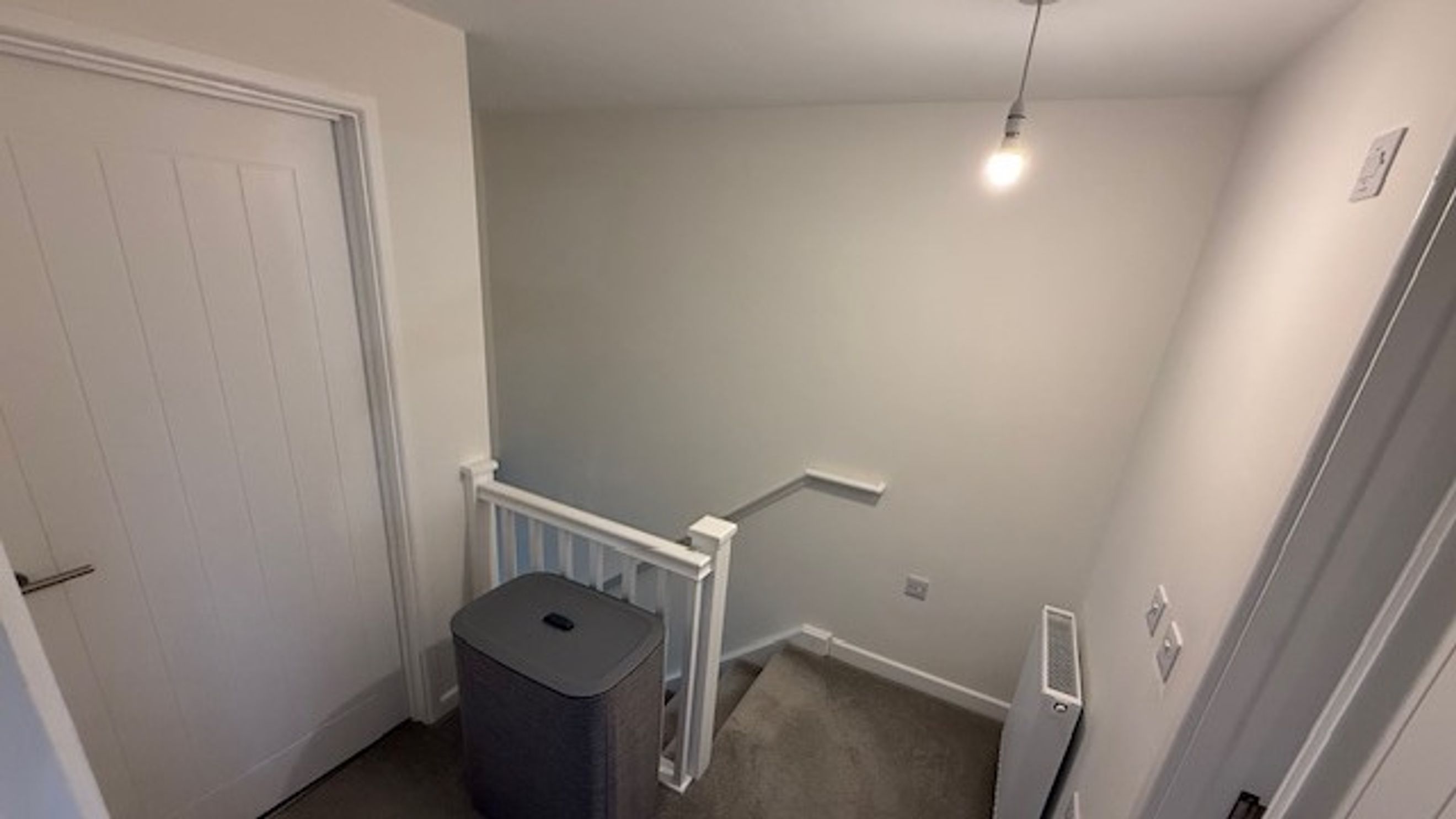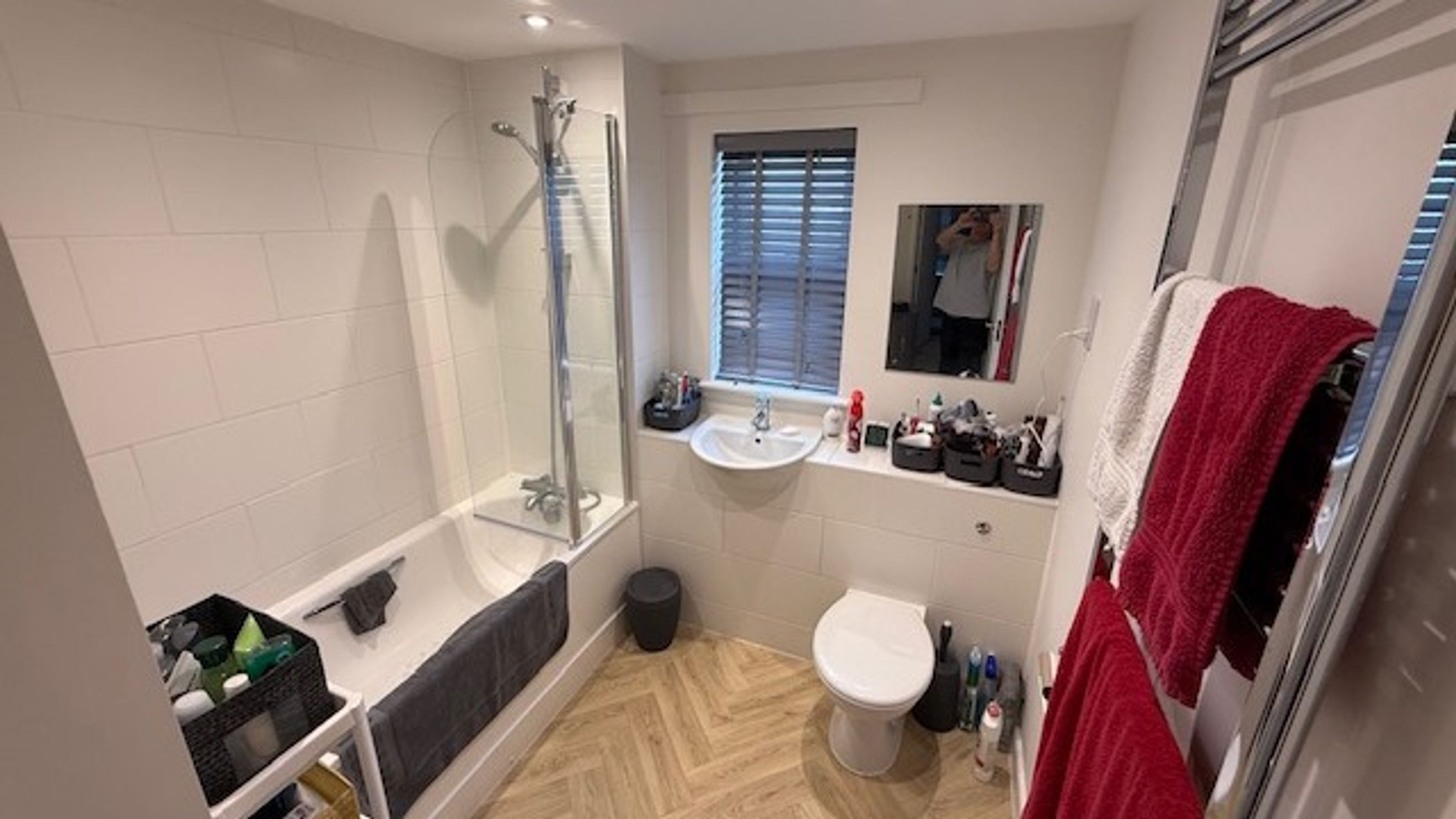 Upstairs, there are two double bedrooms. The family bathroom features a classic white suite with a shower over the bath, a glass shower screen, a hidden‑tank low‑level WC and a wash hand basin. It includes a heated towel rail with a chrome finish. The bathroom is tiled with large white tiles and completed with oak herringbone‑effect vinyl flooring. The home comes with an air source heat pump heating system and underfloor heating downstairs. The home is also provided with two parking spaces.