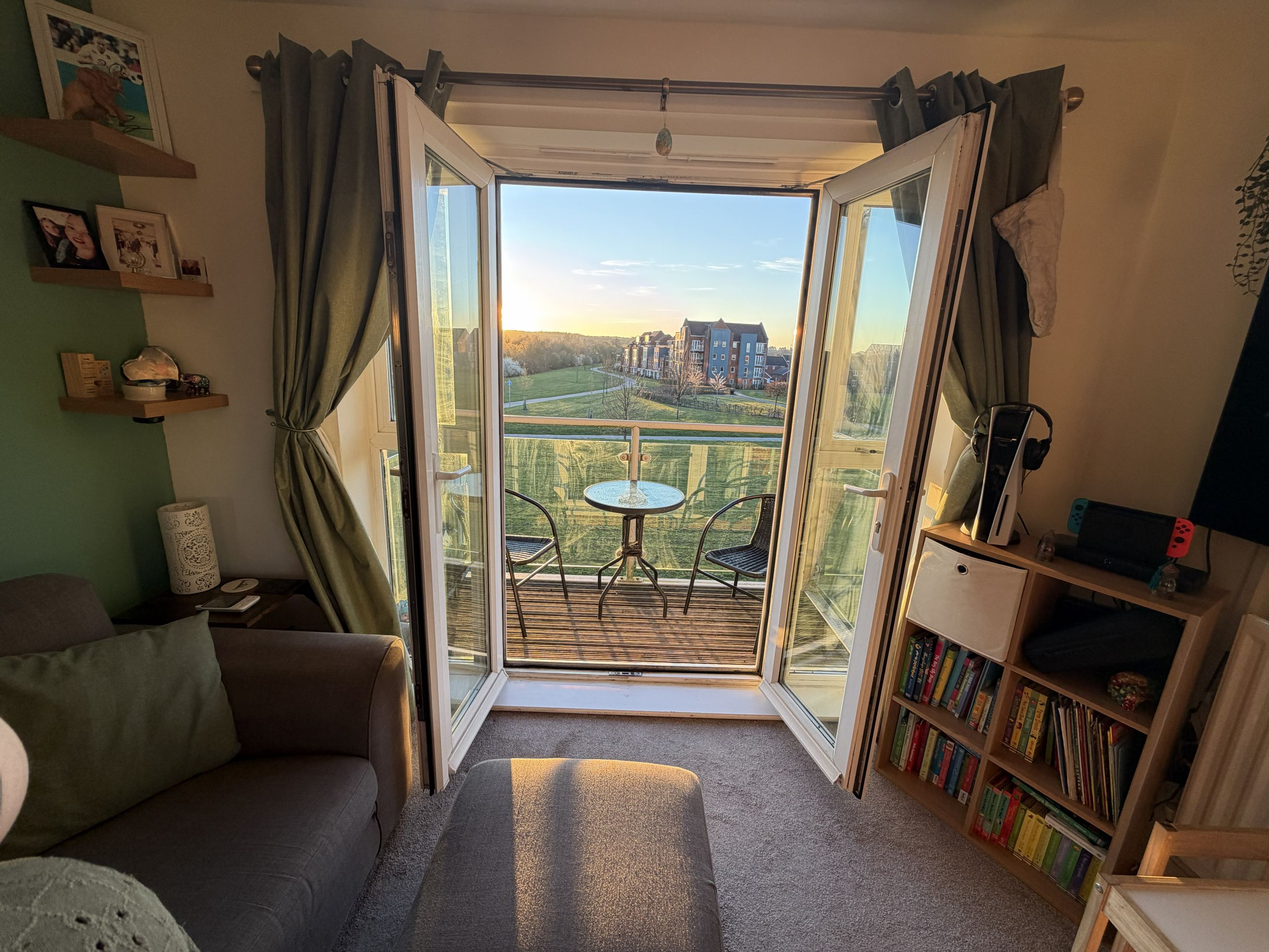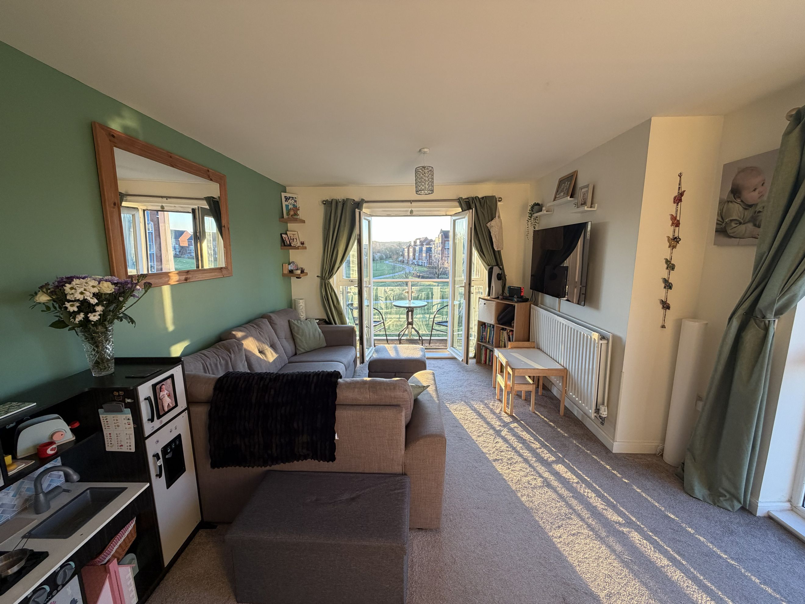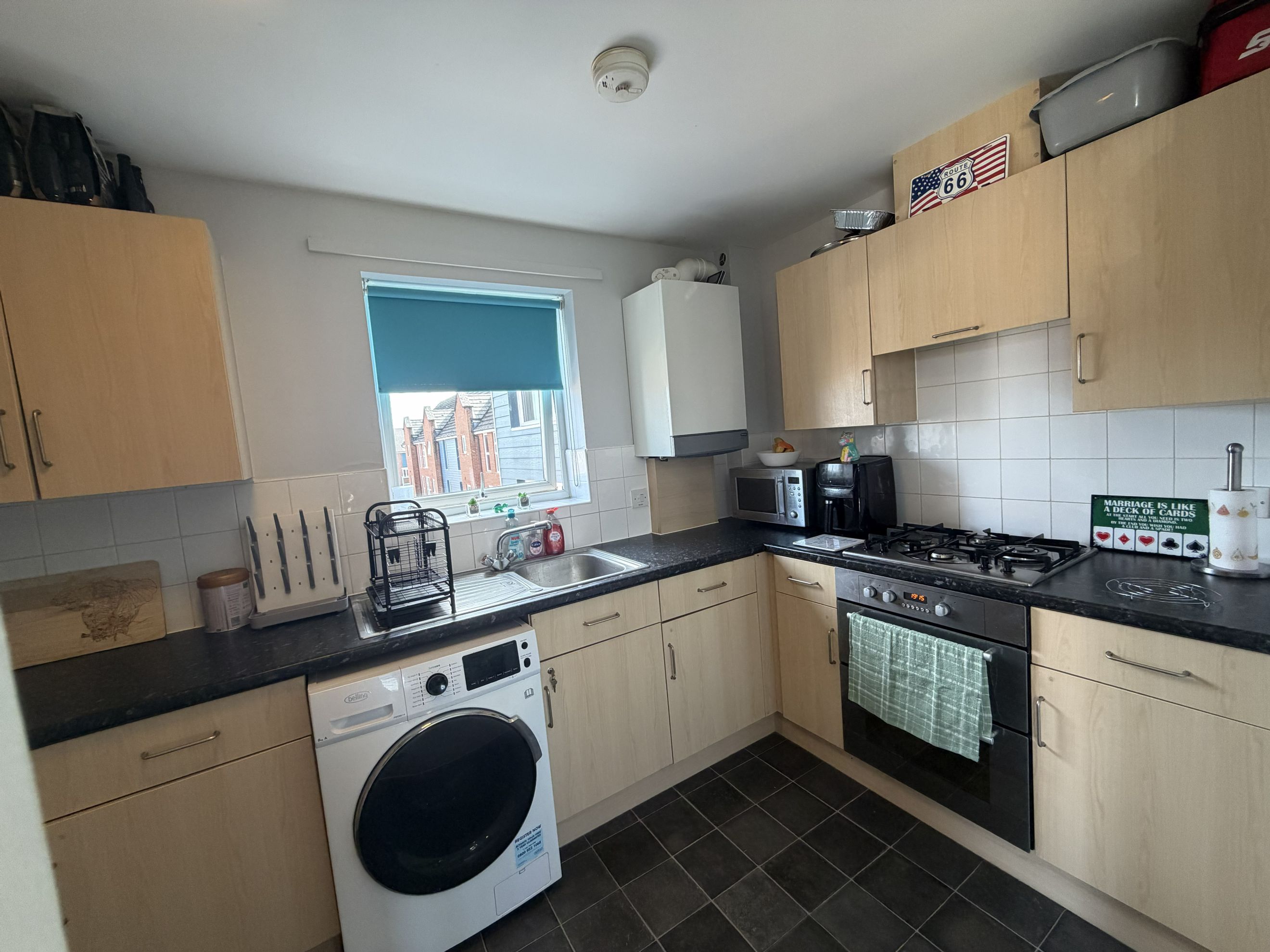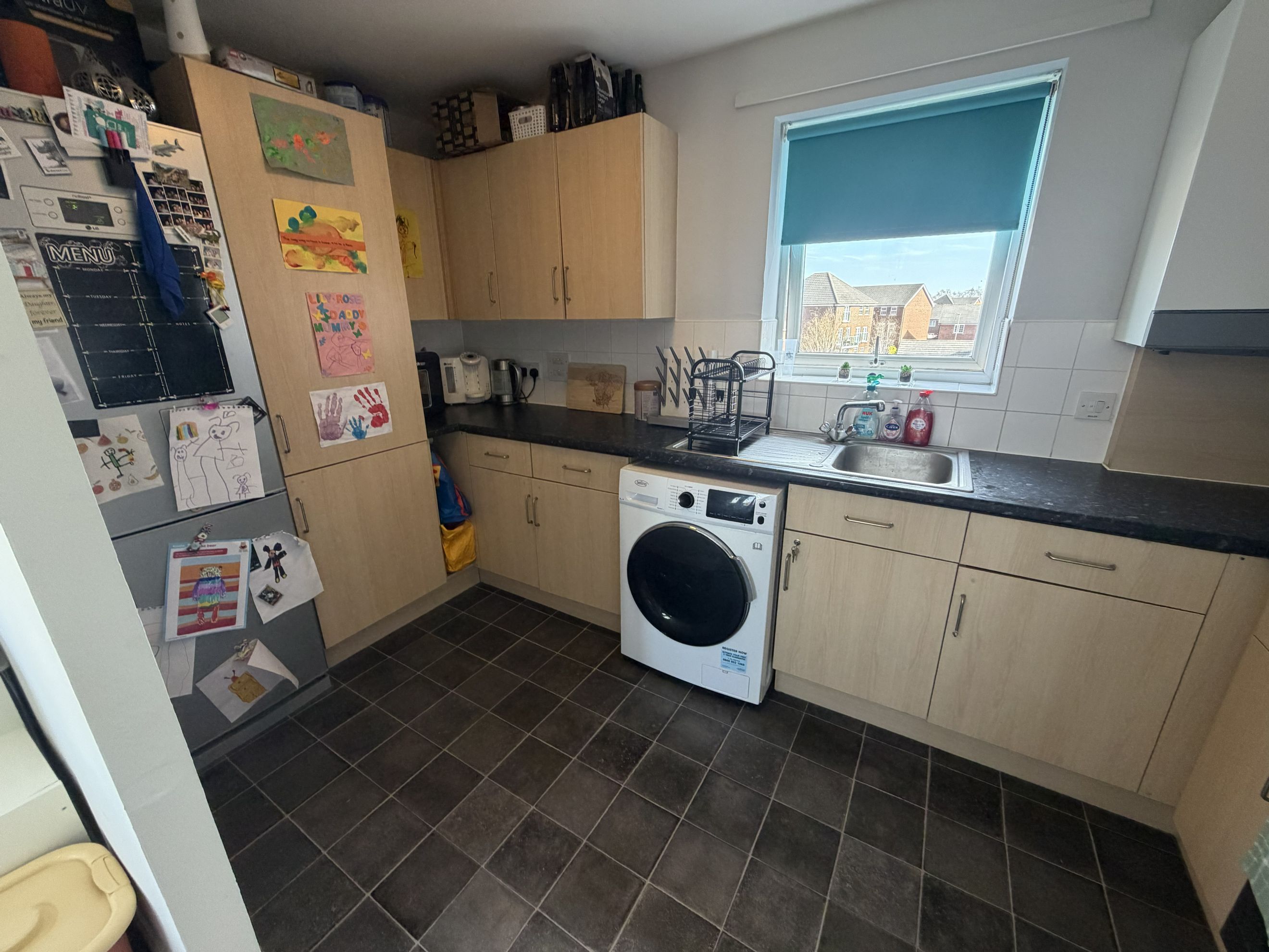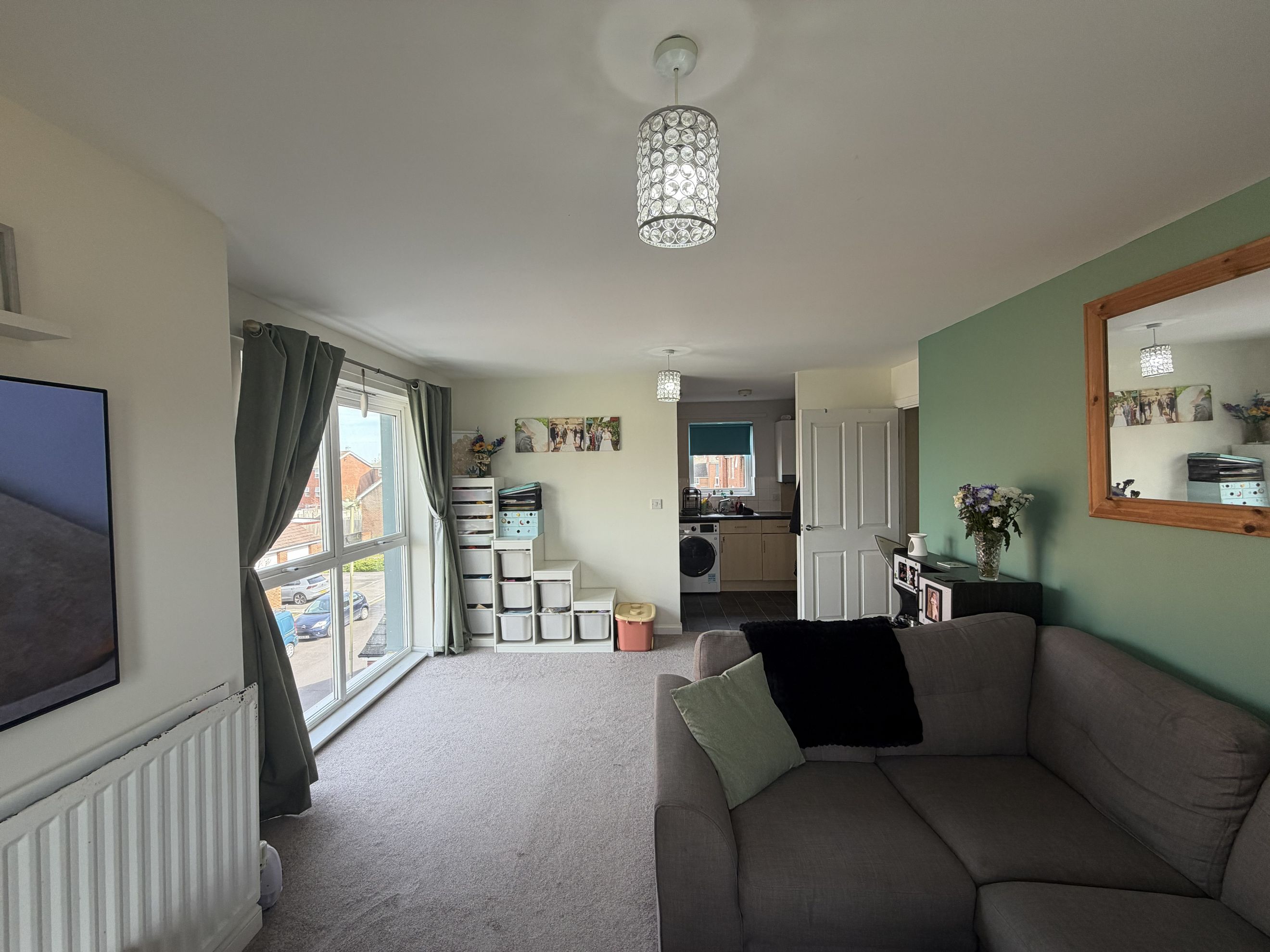 A spacious entrance hallway welcomes you into the home, complete with two generous storage cupboards for added practicality. The heart of the property is the open‑plan living, dining and kitchen area, designed for comfortable everyday living and entertaining. The contemporary kitchen provides ample cupboard space, an oven, hob and extractor, plus dedicated space for your own washing machine and fridge freezer. From the living area, step out onto your private balcony.