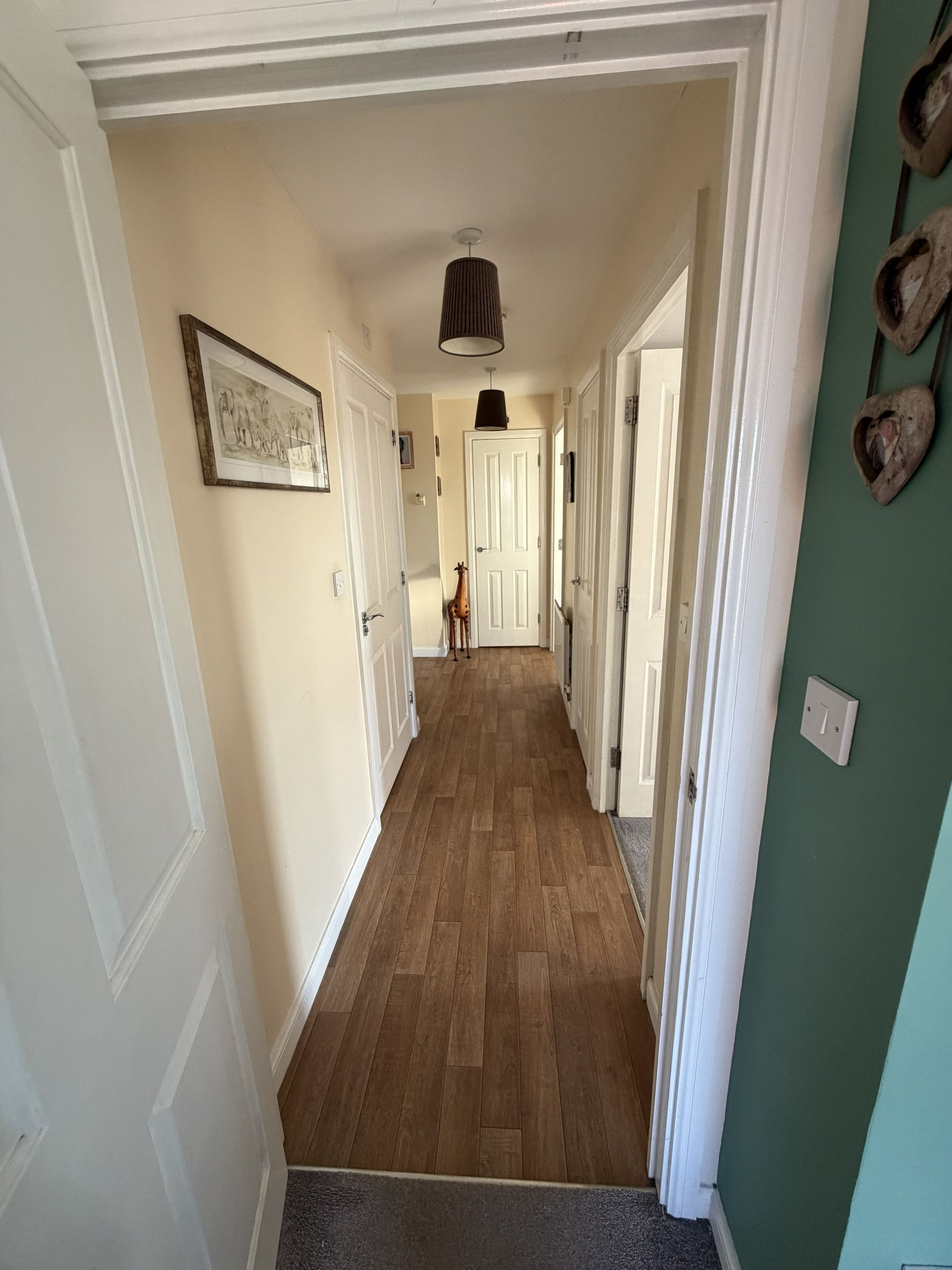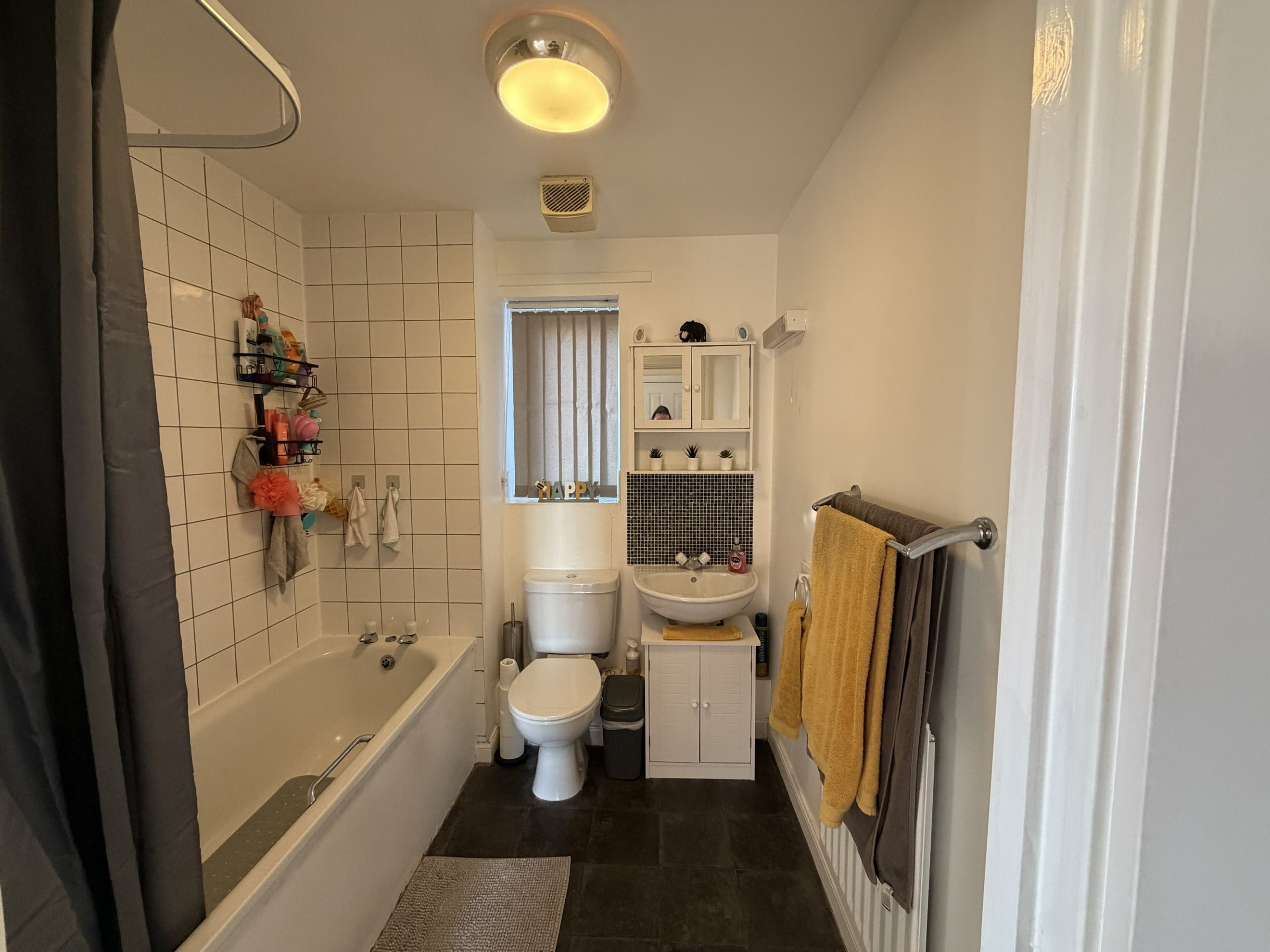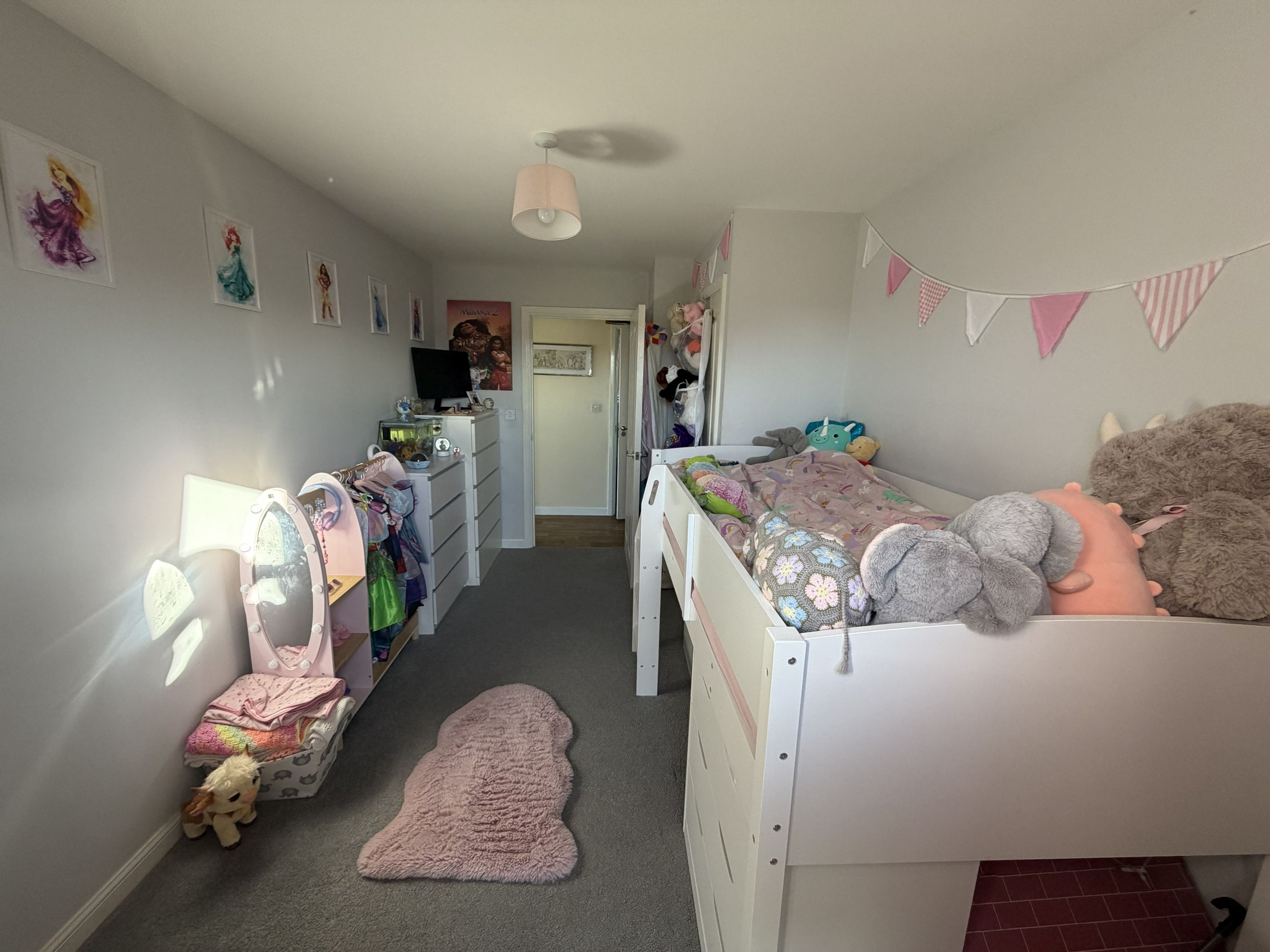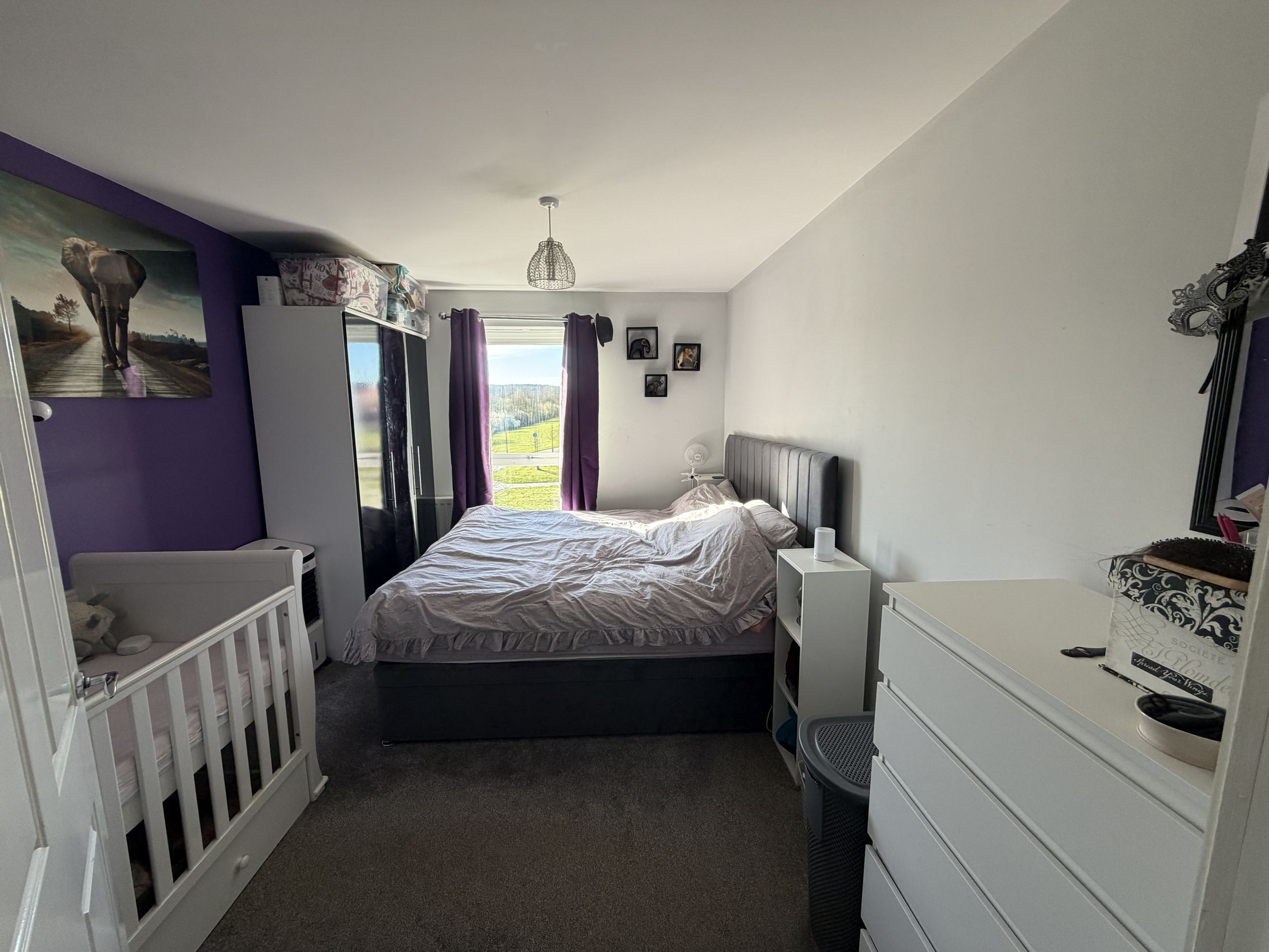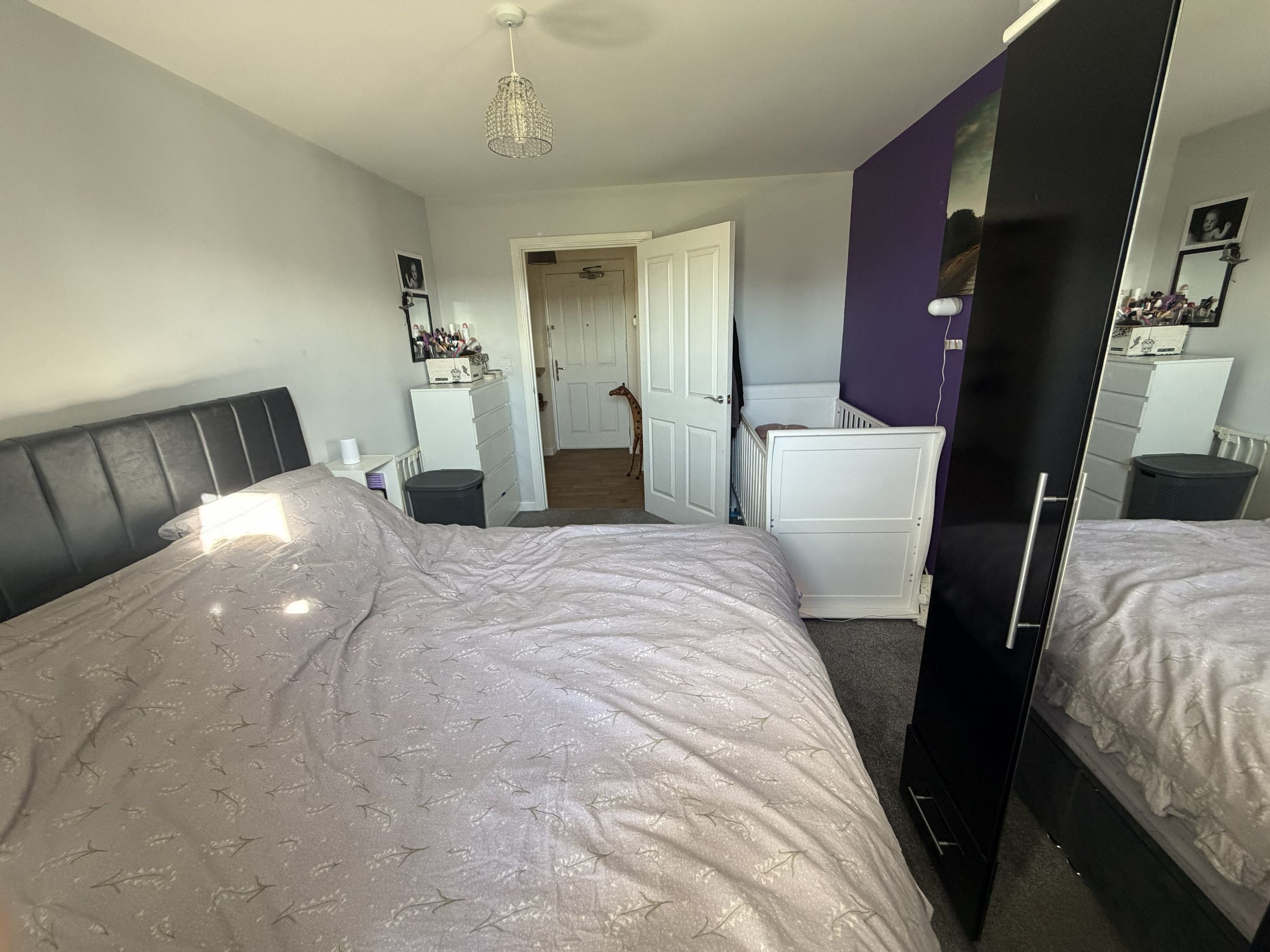 There are two double bedrooms, with the main bedroom benefiting from a built‑in wardrobe. The family bathroom features a modern three‑piece suite with a shower over the bath.