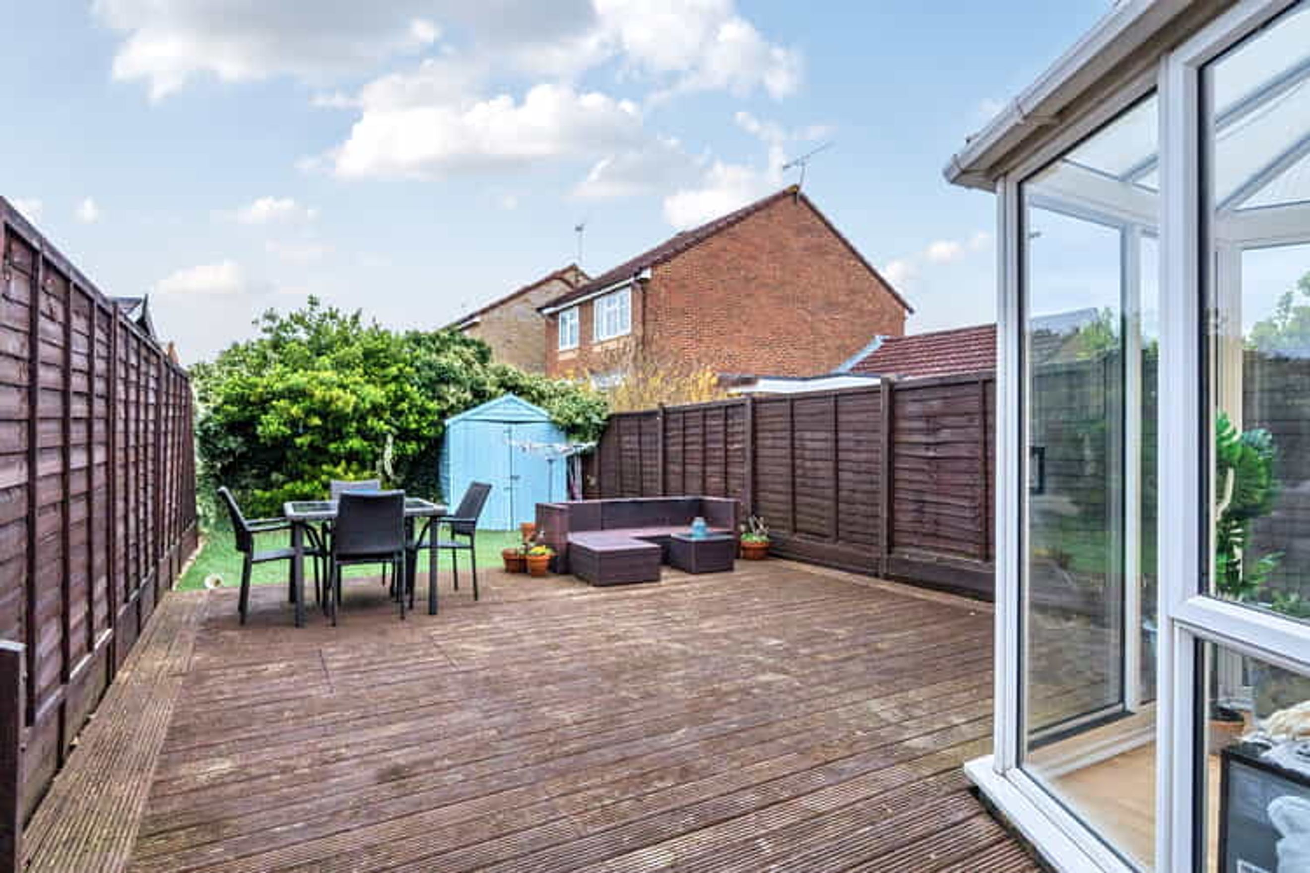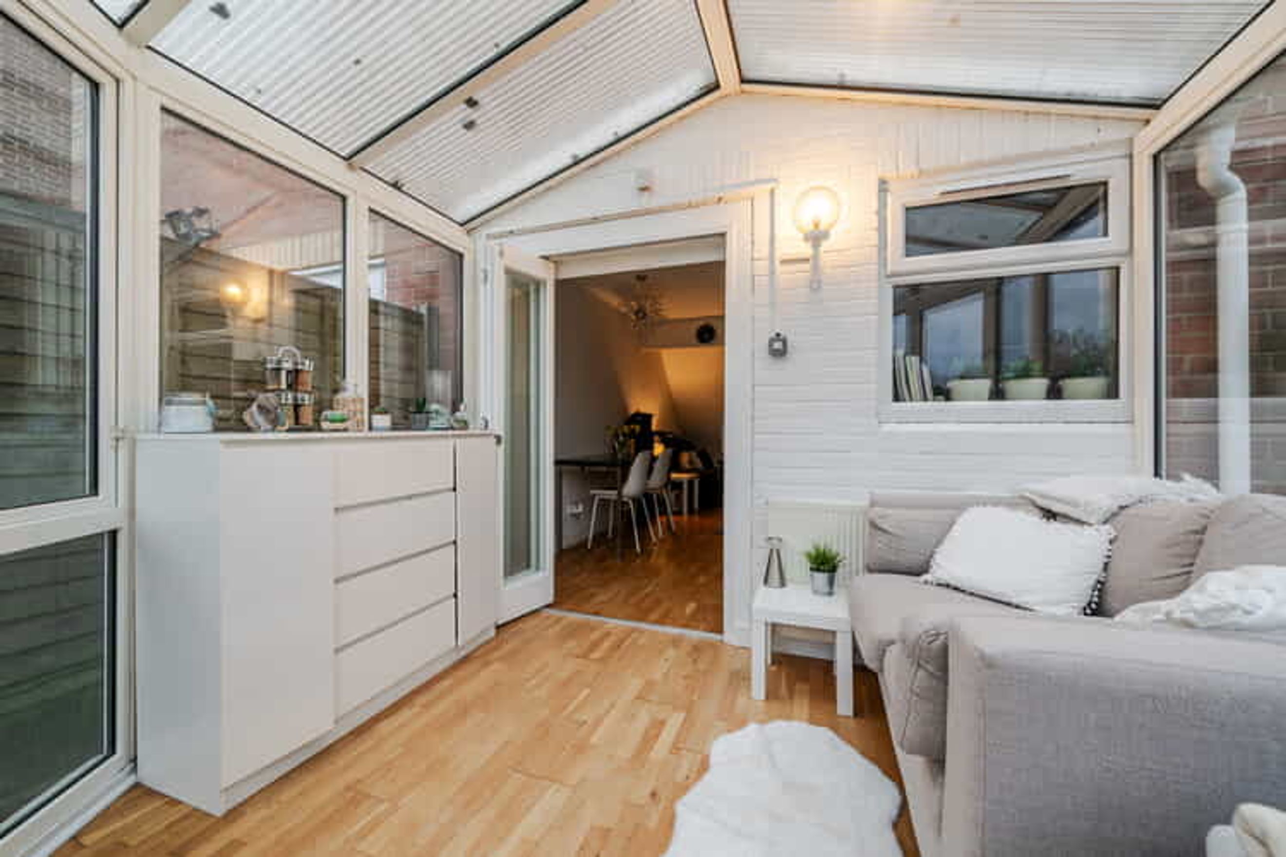 On the ground floor, there is a spacious living room, a modern kitchen, and a conservatory. On the first floor, there are two bedrooms and a bathroom.