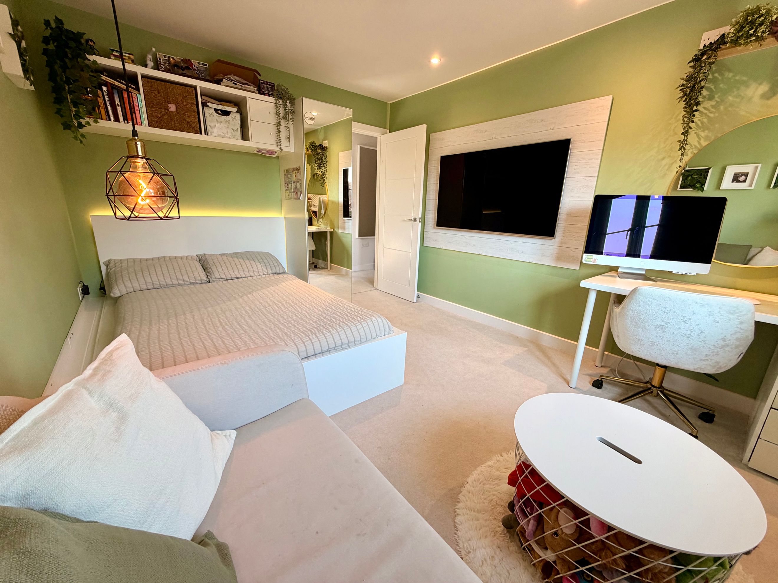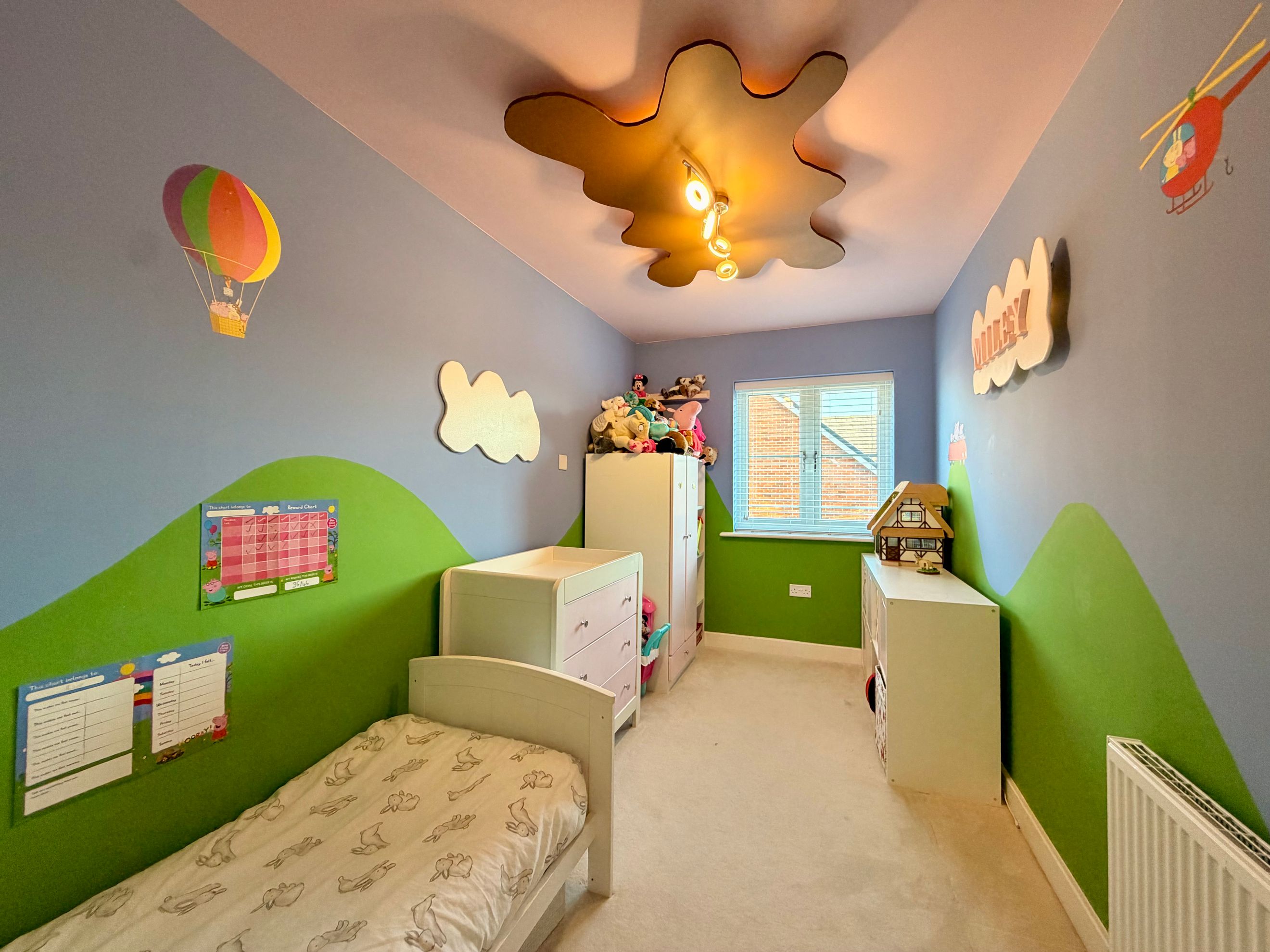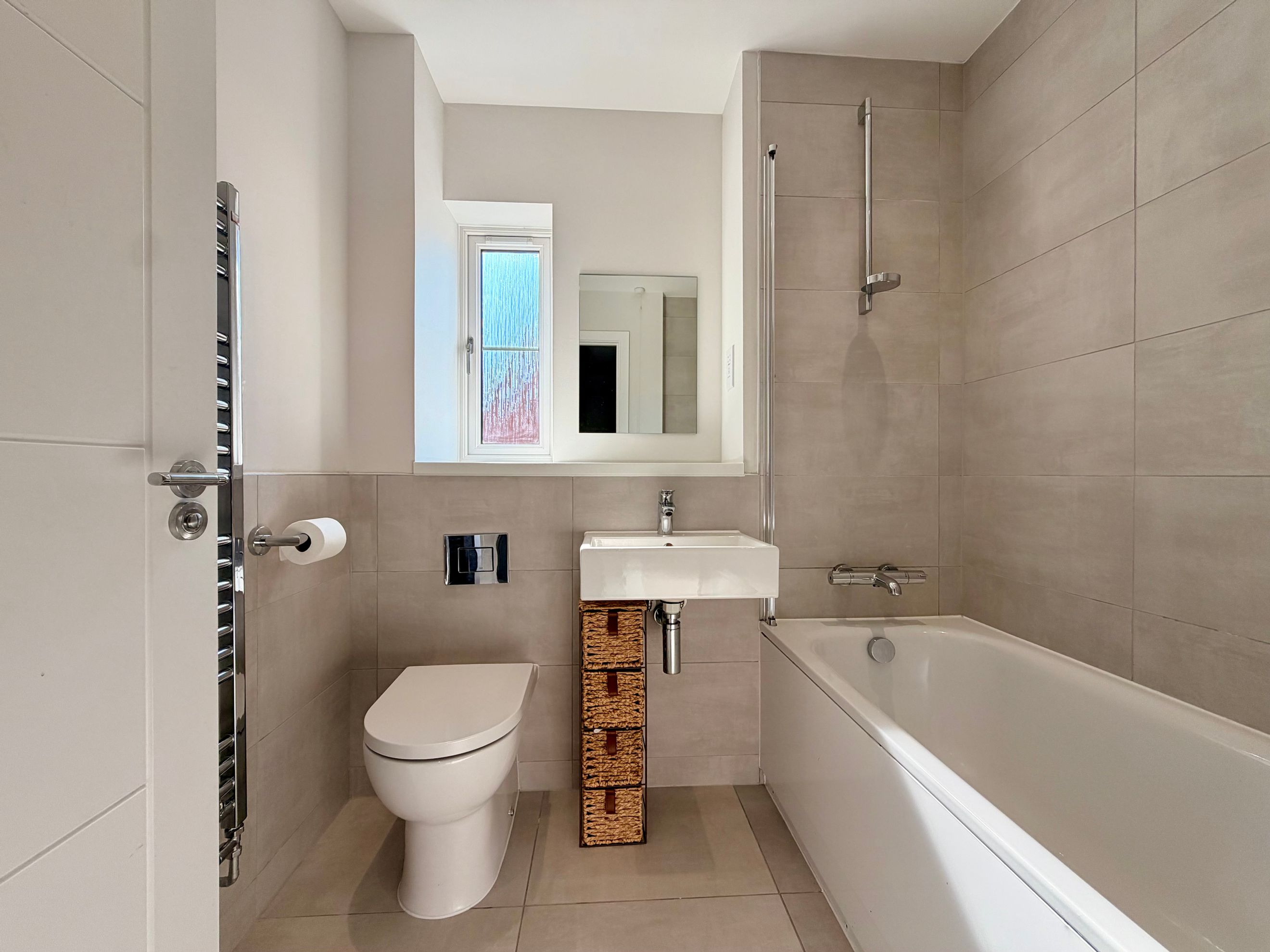 Upstairs, the property offers three bedrooms—two comfortable doubles and one single. The master bedroom benefits from a built‑in wardrobe and a private ensuite shower room. The family bathroom includes a modern three‑piece suite with a shower over the bath and a window for natural ventilation.