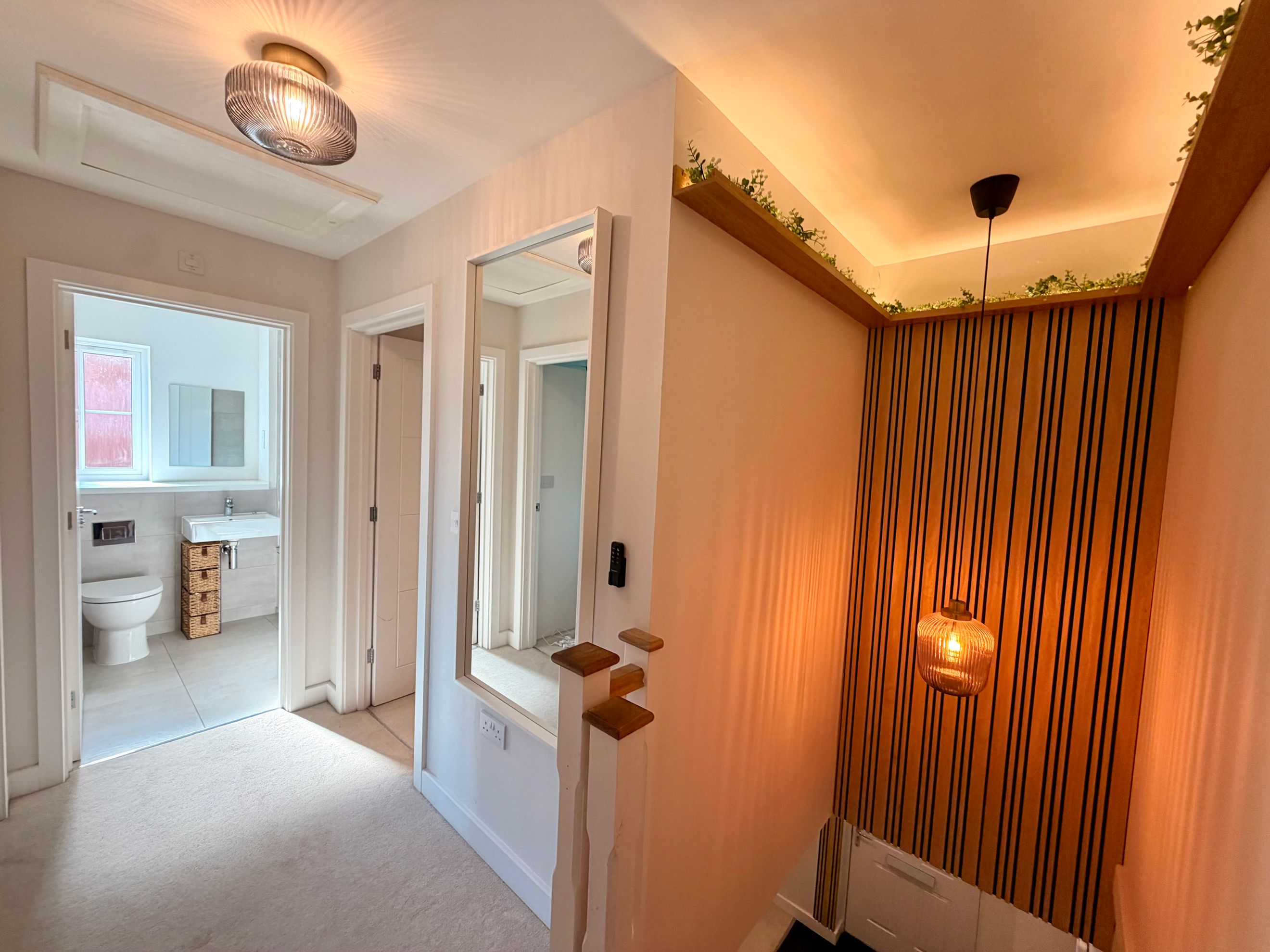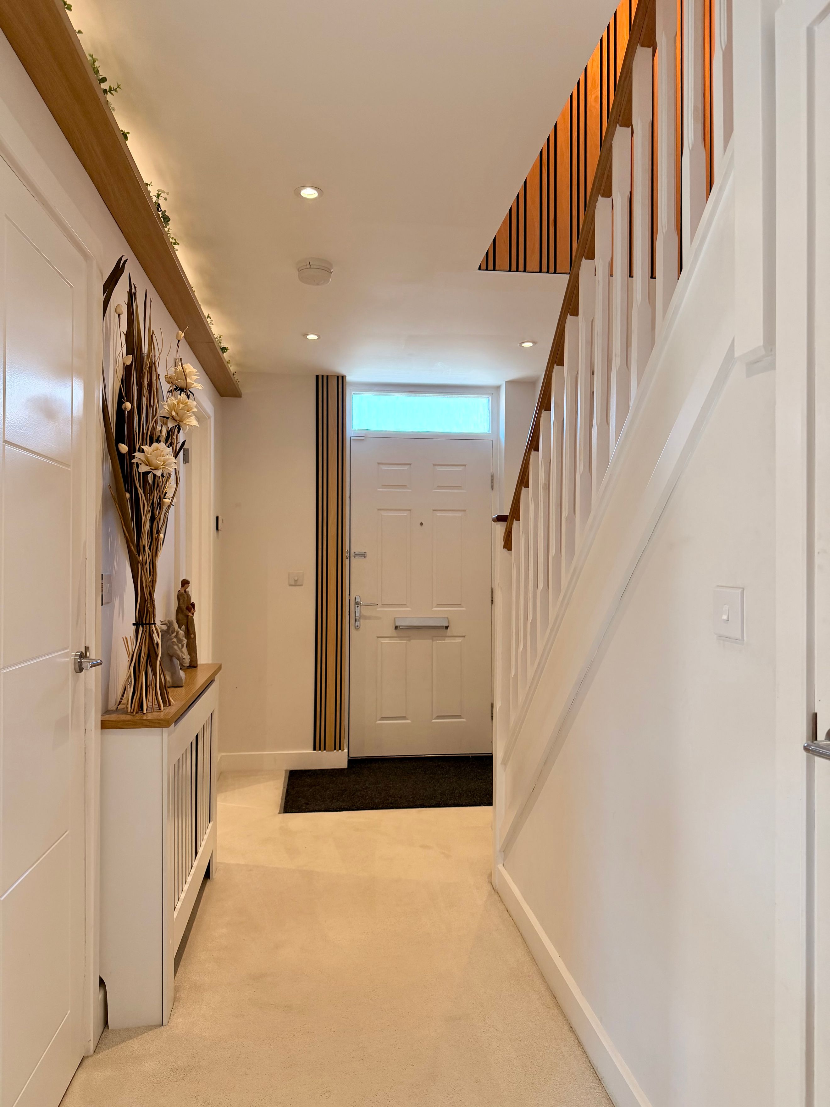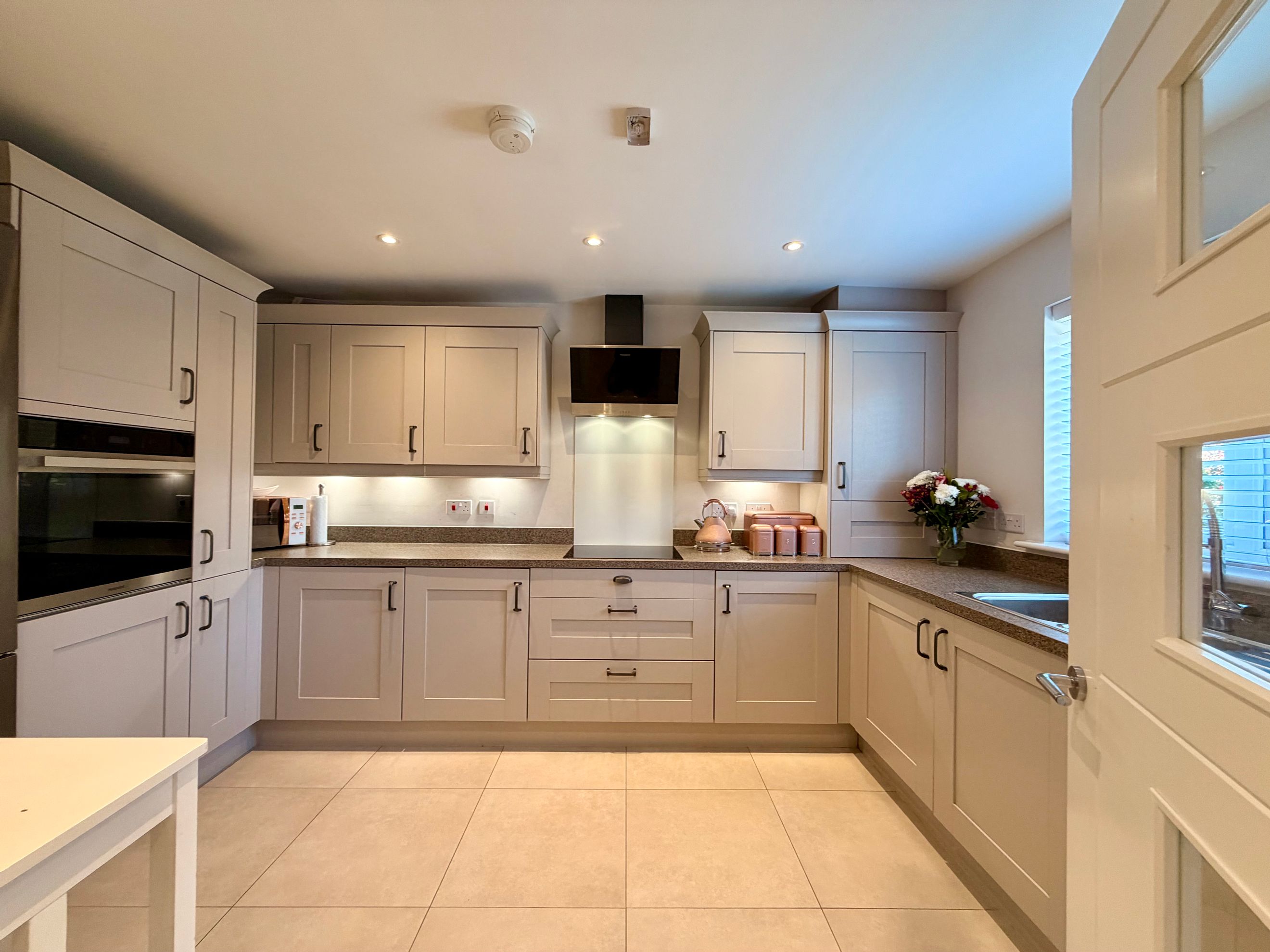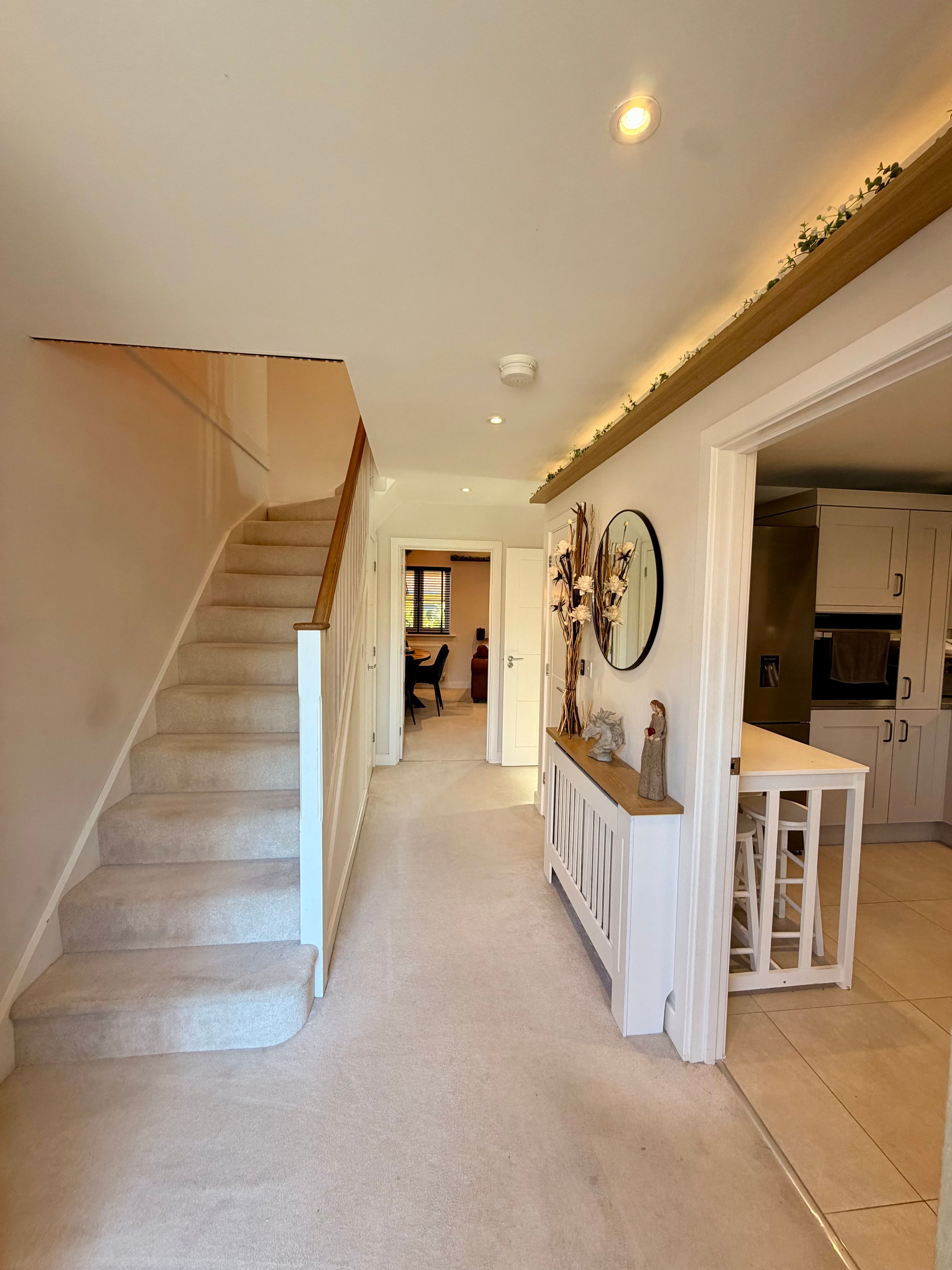 A welcoming entrance hallway sets the tone, complete with two useful storage cupboards for everyday practicality. The modern kitchen provides ample cupboard space, an oven, hob and extractor, plus dedicated space for your own washing machine and fridge freezer.