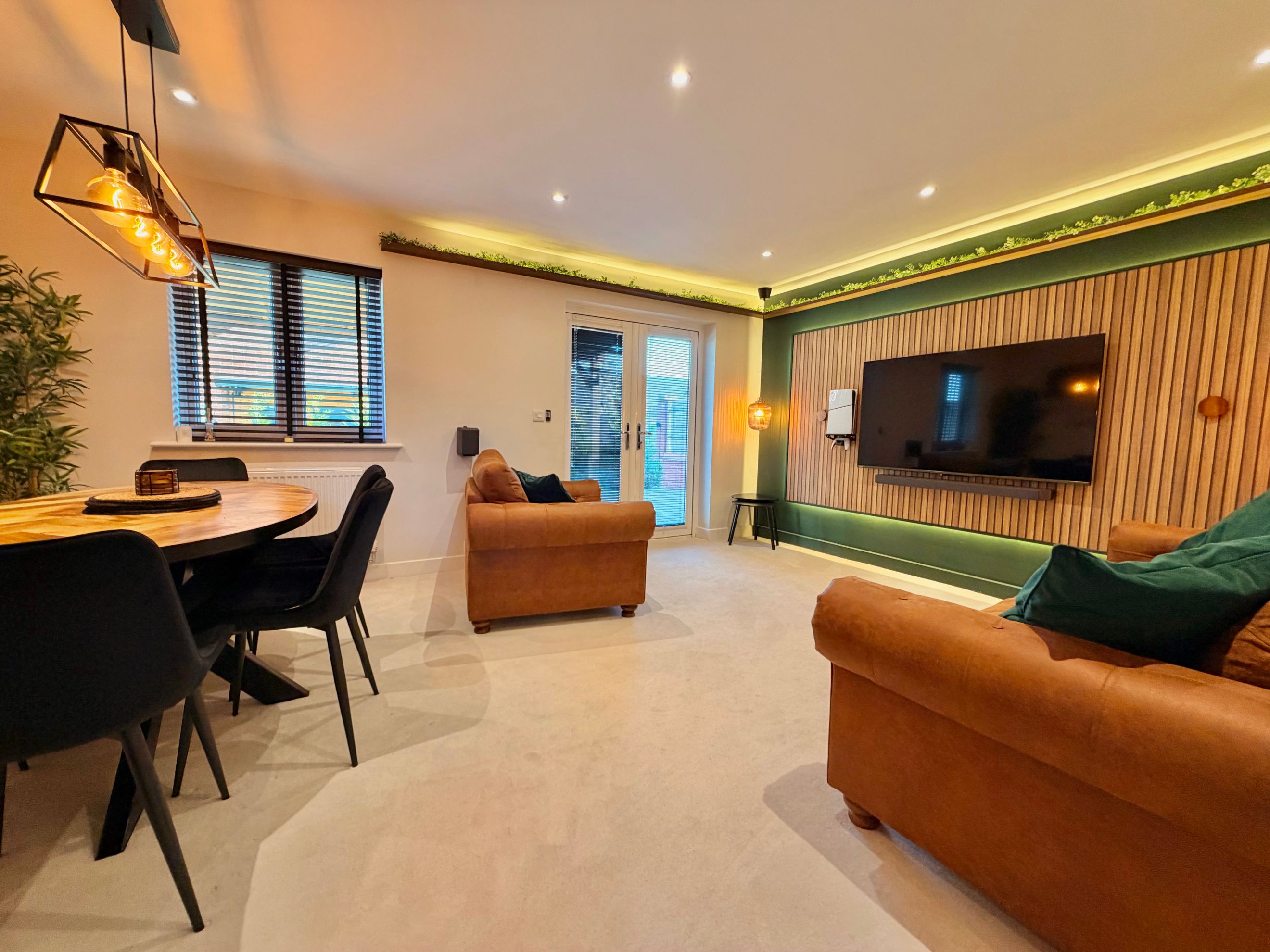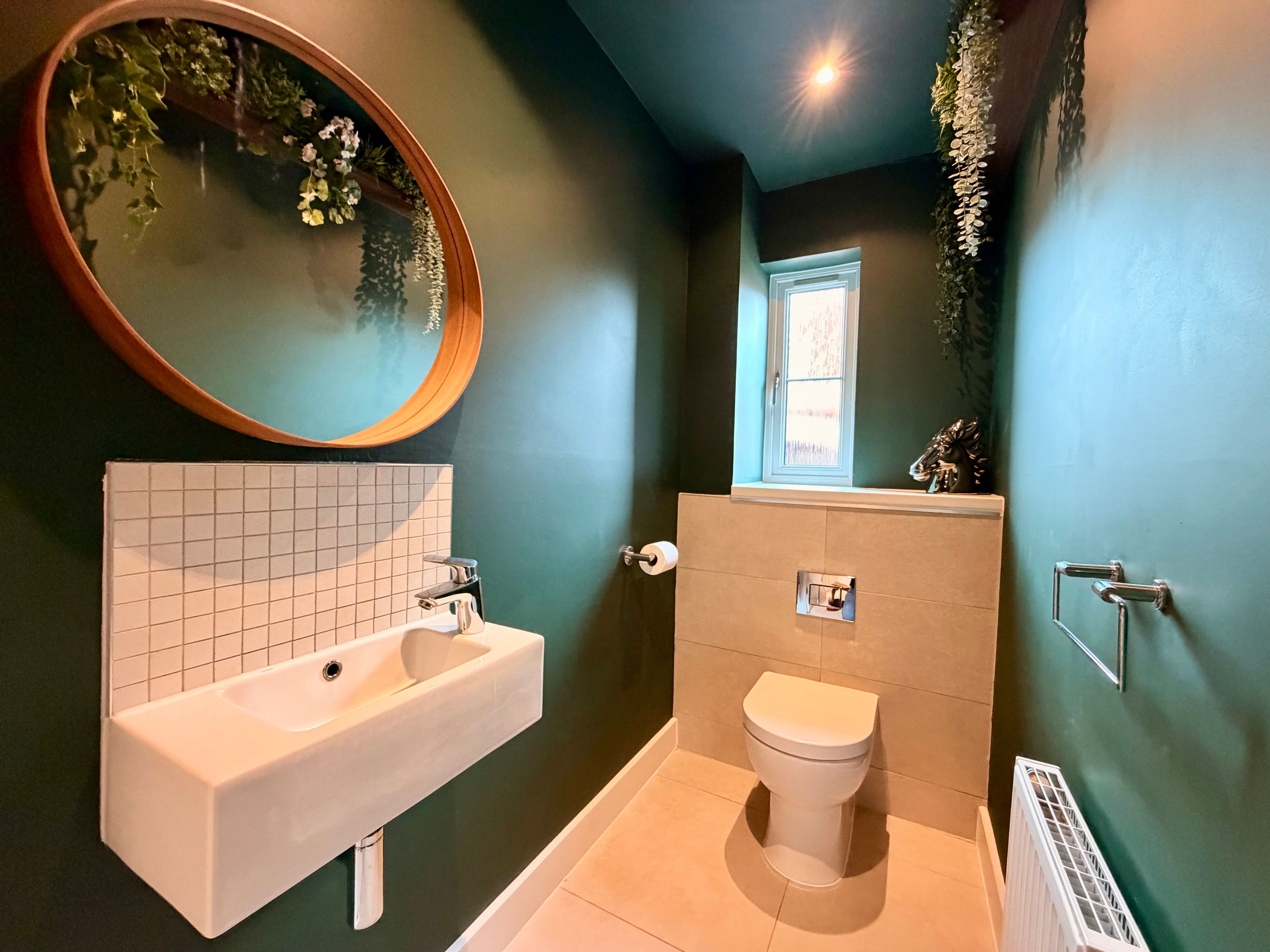The separate living/dining room is bright and spacious, featuring double doors opening onto the private rear garden, creating a seamless indoor–outdoor flow. A convenient downstairs cloakroom completes the ground floor.
