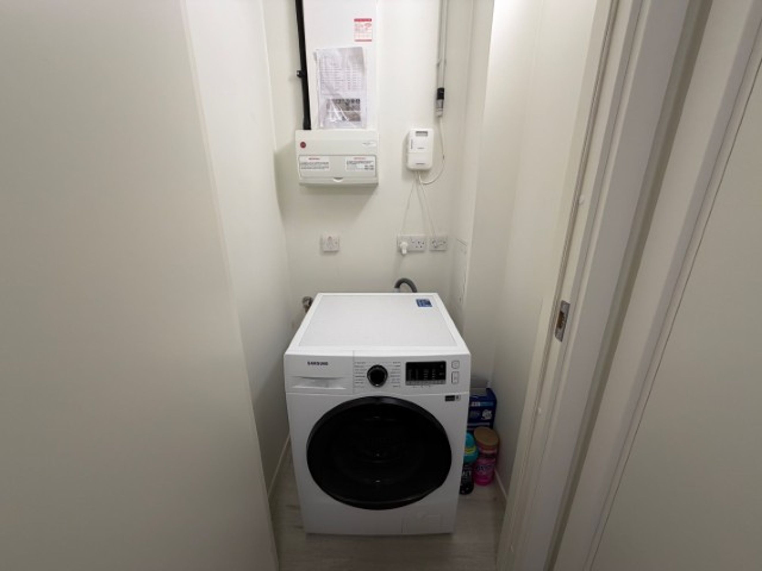 Integrated Hoover Appliances in the kitchen and Samsung washer/dryer in utility cupboard.