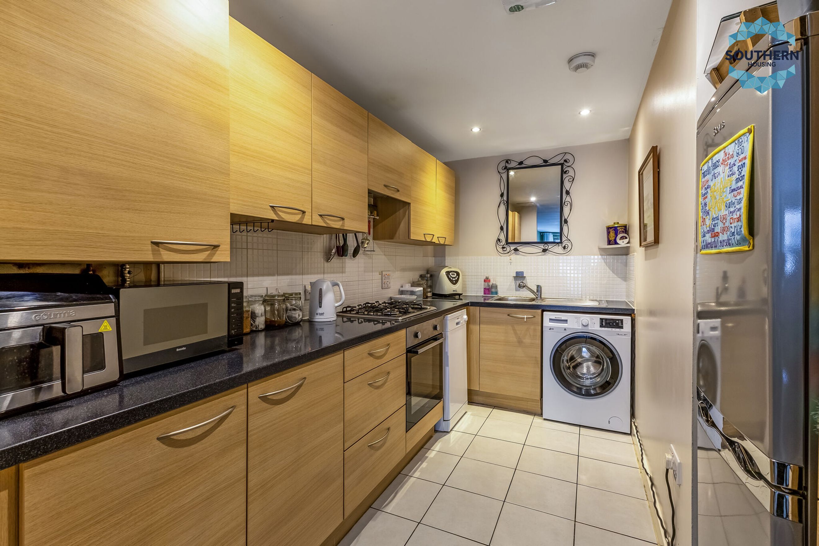 The accommodation comprises a spacious entrance hall leading to a bright open-plan reception room with a modern fitted kitchen, creating a practical and sociable living area. The apartment further benefits from a generously sized double bedroom and a contemporary bathroom, completing the internal layout.