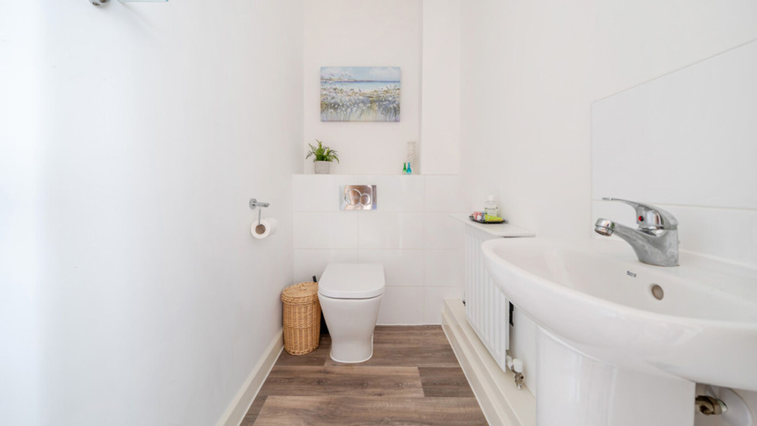 The ground floor comprises a bright and spacious living room, perfect for both relaxing and entertaining, alongside a contemporary kitchen/dining room fitted with appliances including a fridge/freezer, washing machine, hob and oven. French doors open onto the private rear garden, creating a lovely space for indoor-outdoor living.