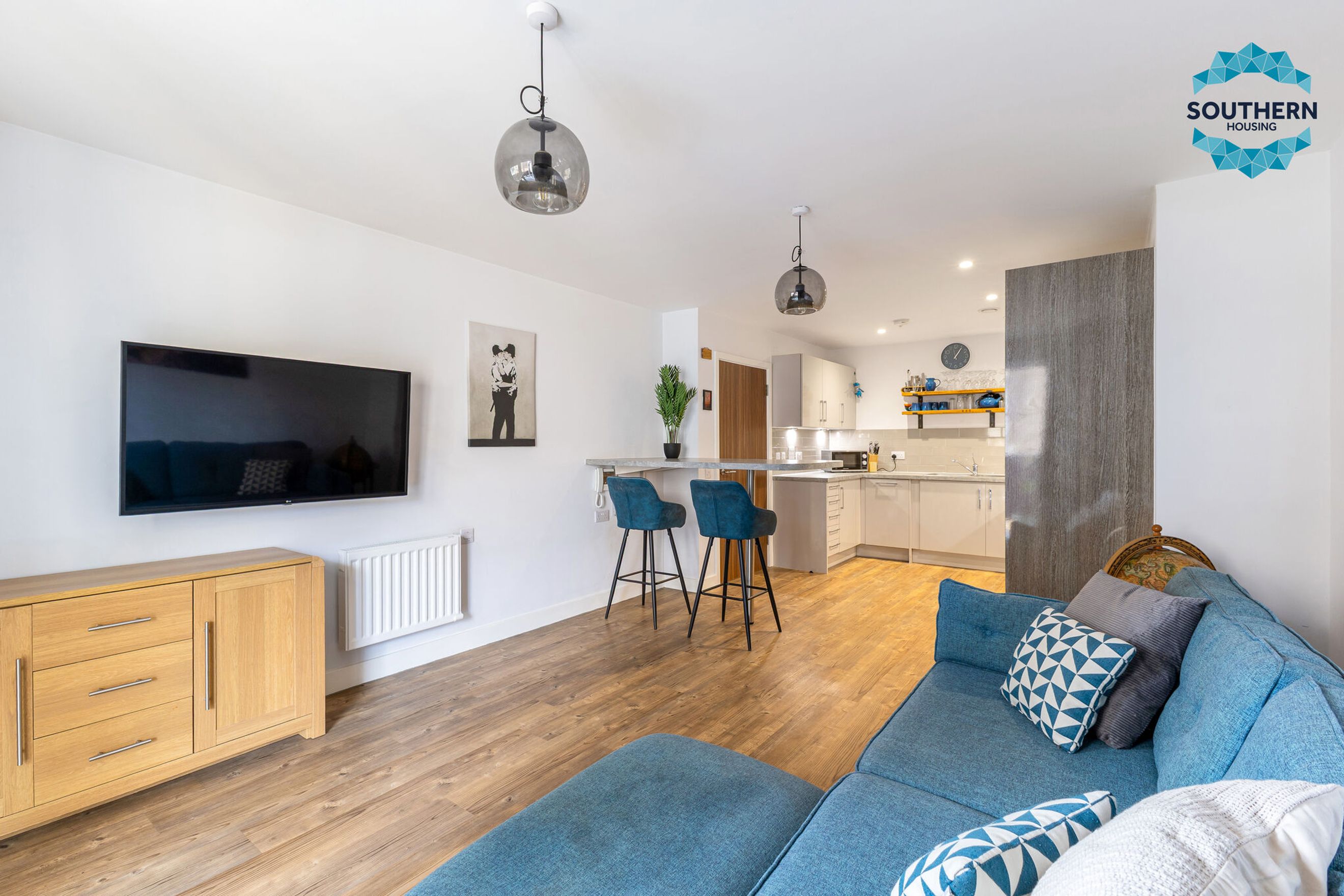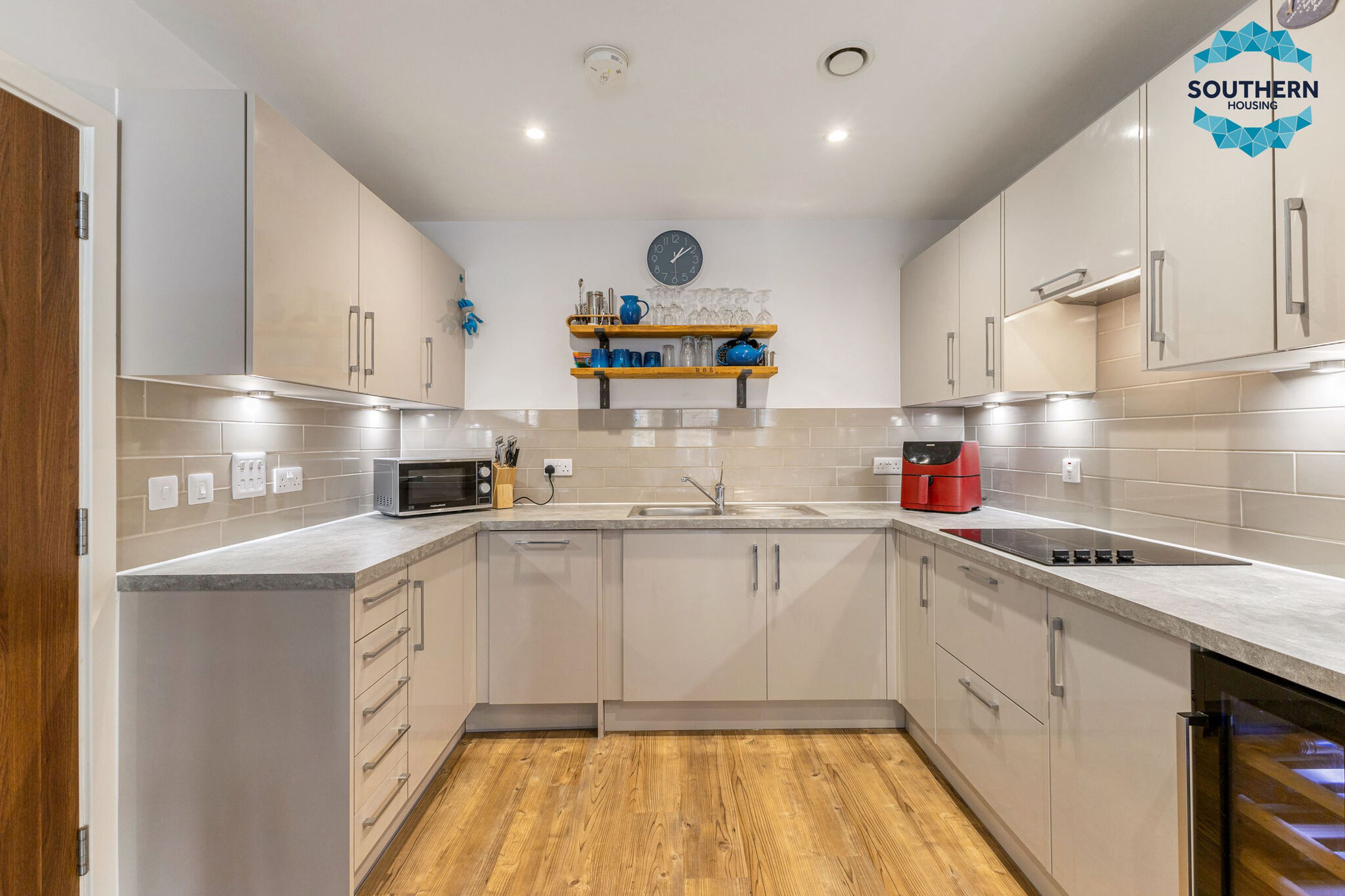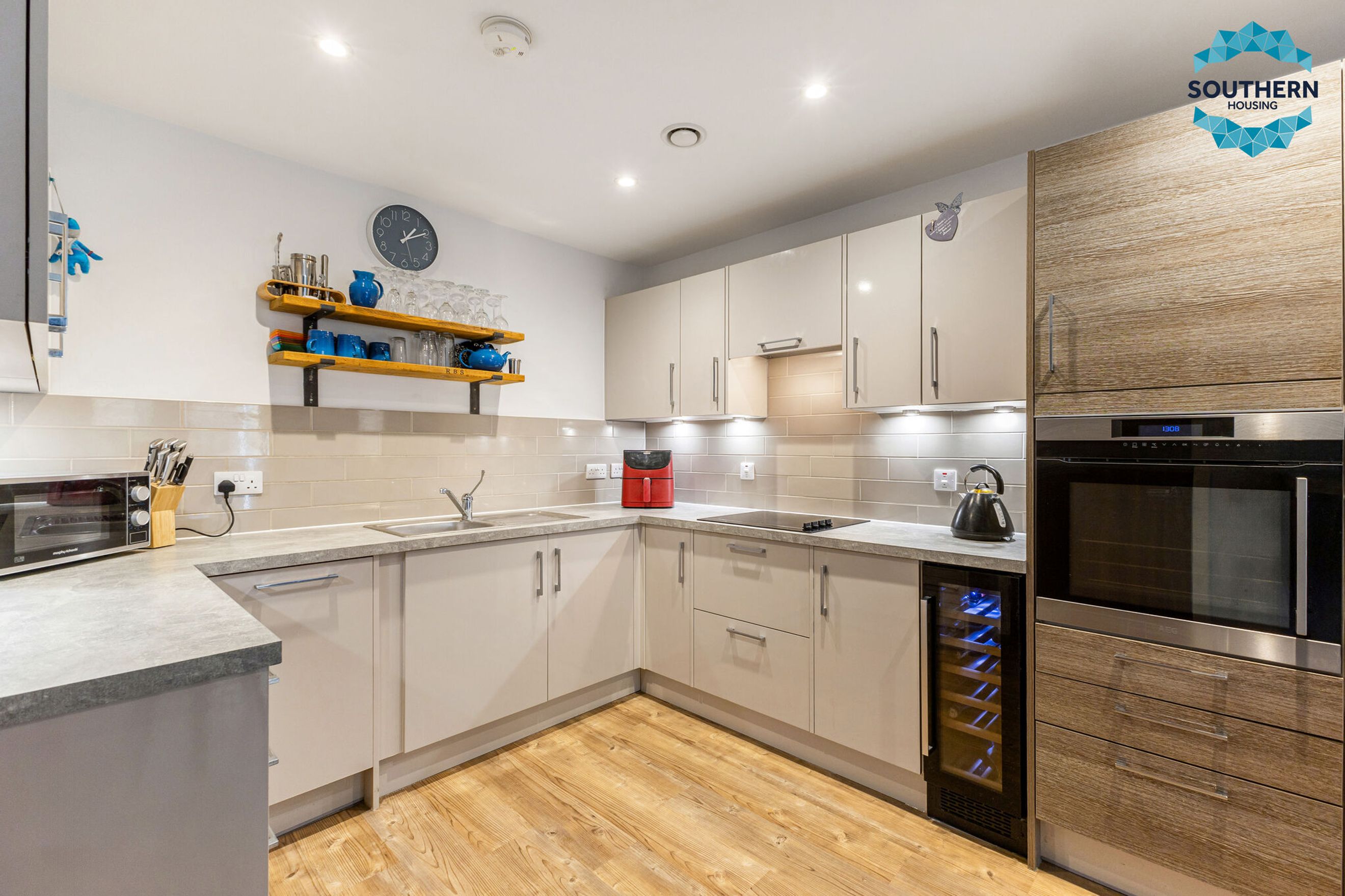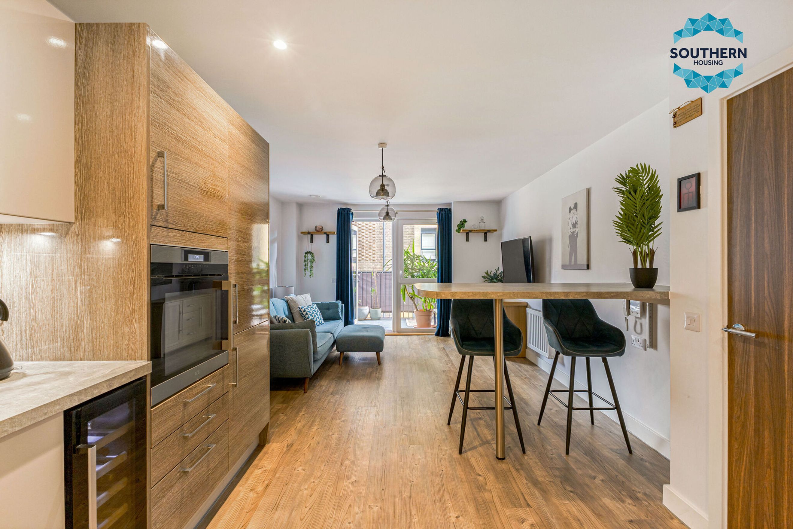 The sleek, modern kitchen is fully equipped with integrated appliances, including an oven, hob, extractor fan, dishwasher and fridge/freezer. The generously sized bedroom features a fitted wardrobe, while the bathroom boasts a modern wet room-style shower and elegant floor-to-ceiling tiling.