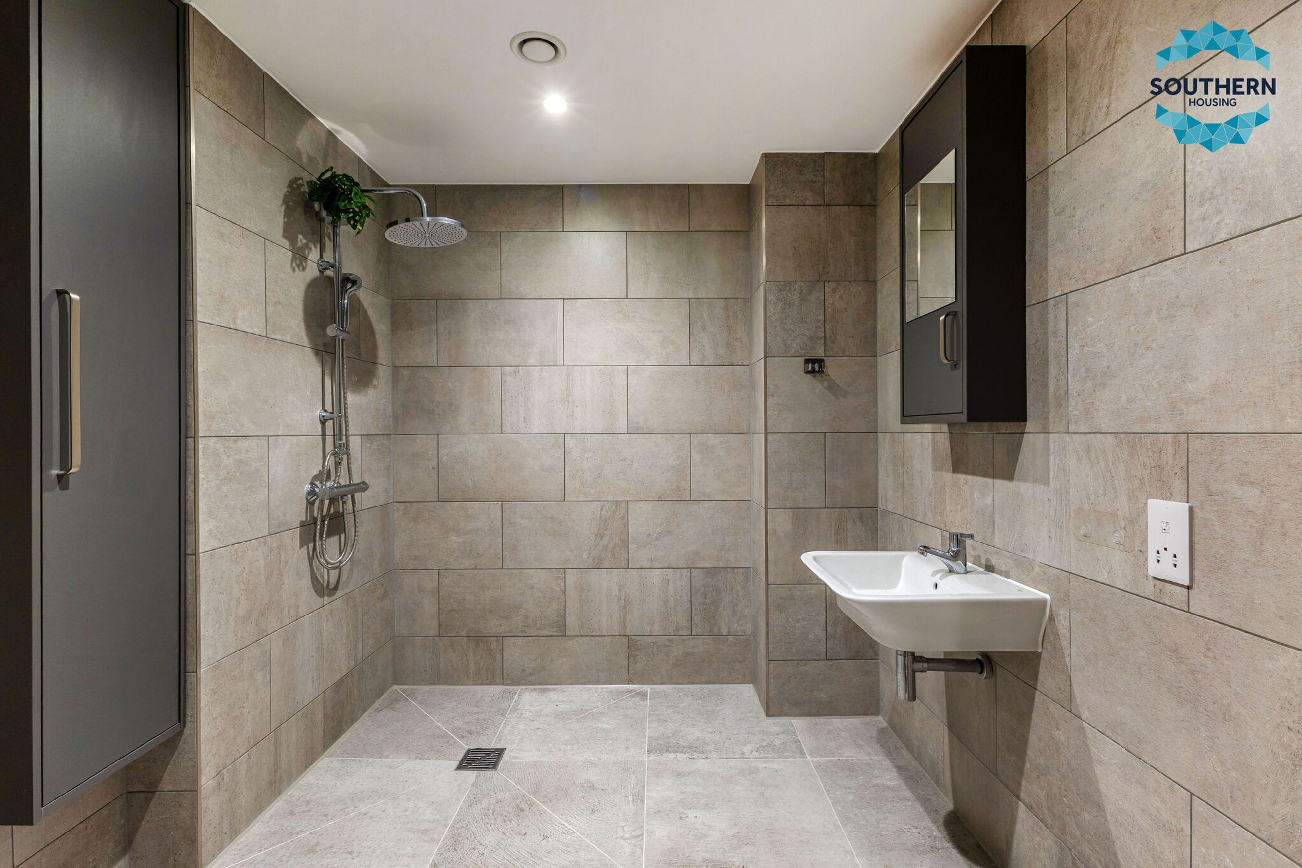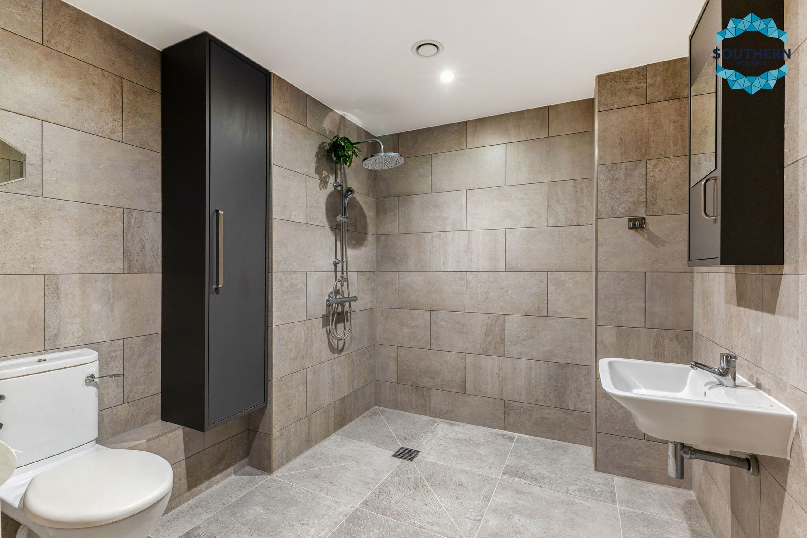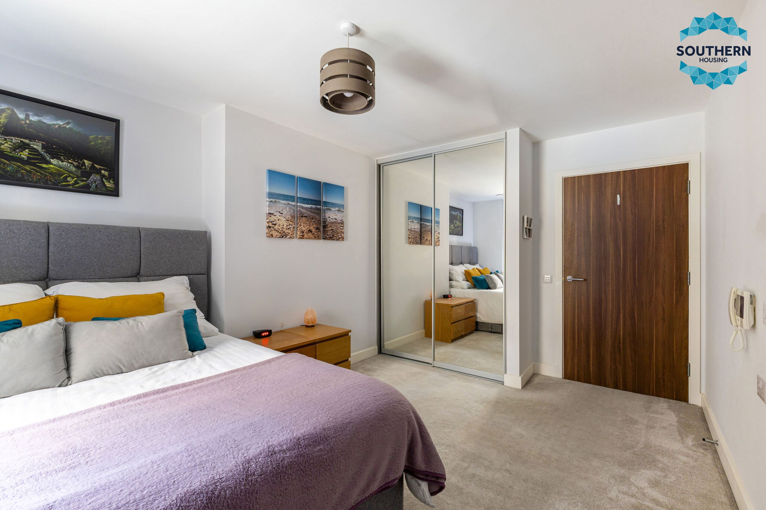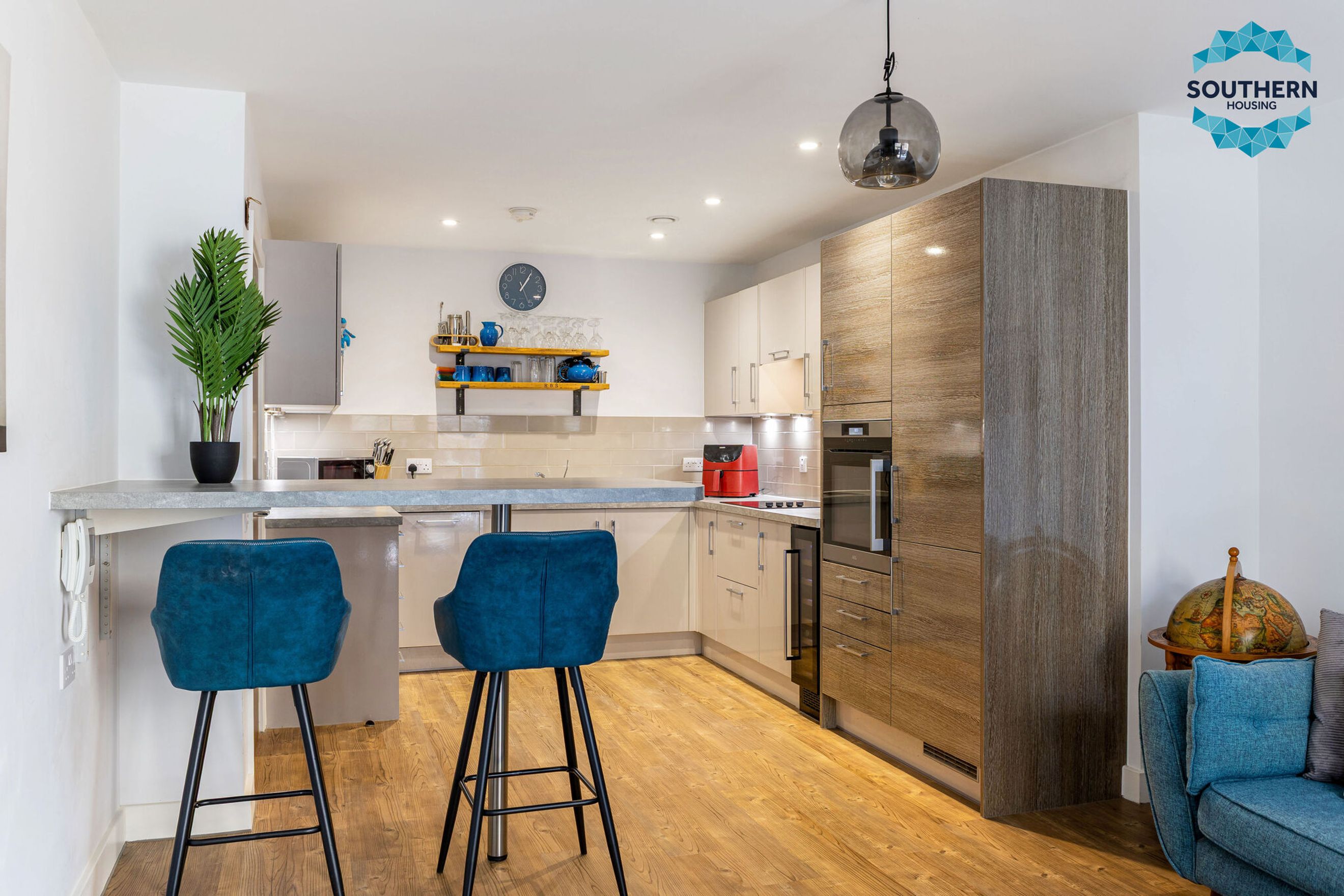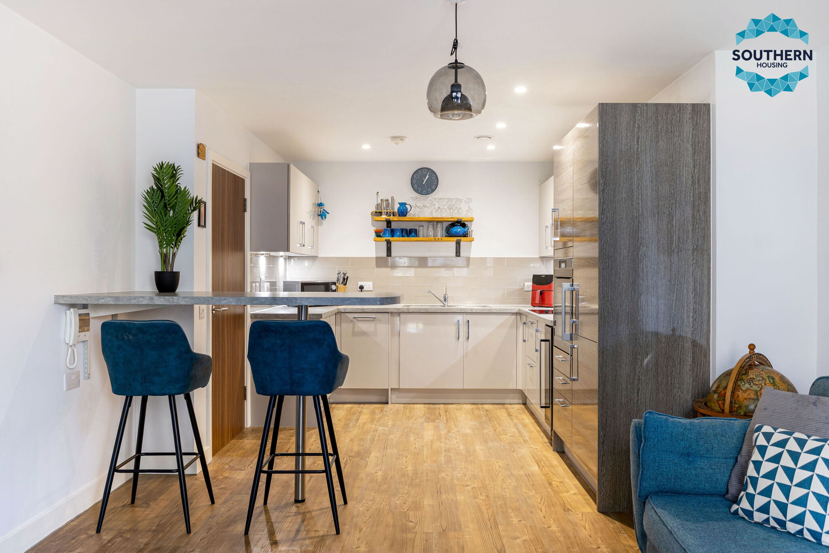 The sleek, modern kitchen is fully equipped with integrated appliances, including an oven, hob, extractor fan, dishwasher and fridge/freezer. The generously sized bedroom features a fitted wardrobe, while the bathroom boasts a modern wet room-style shower and elegant floor-to-ceiling tiling.