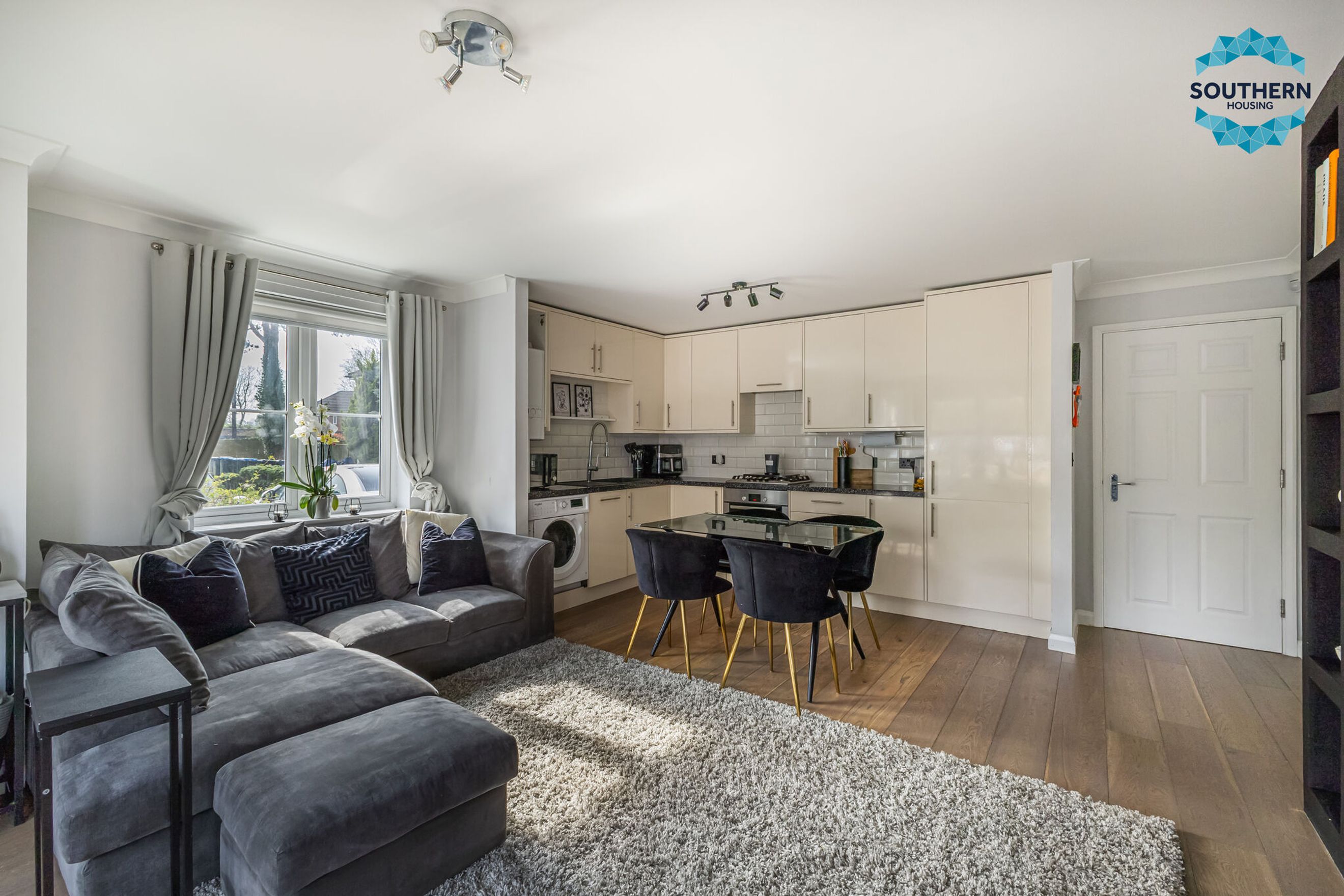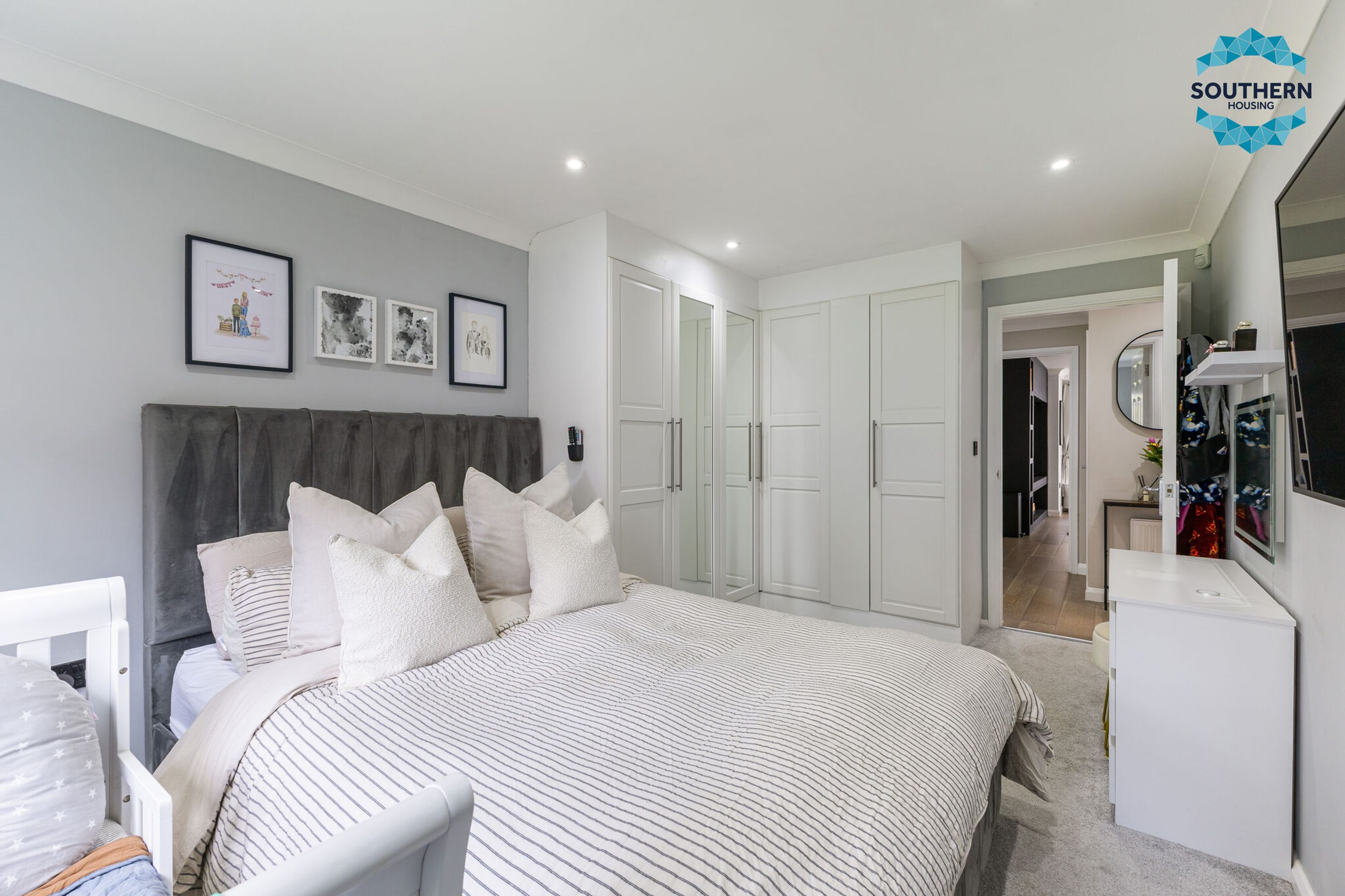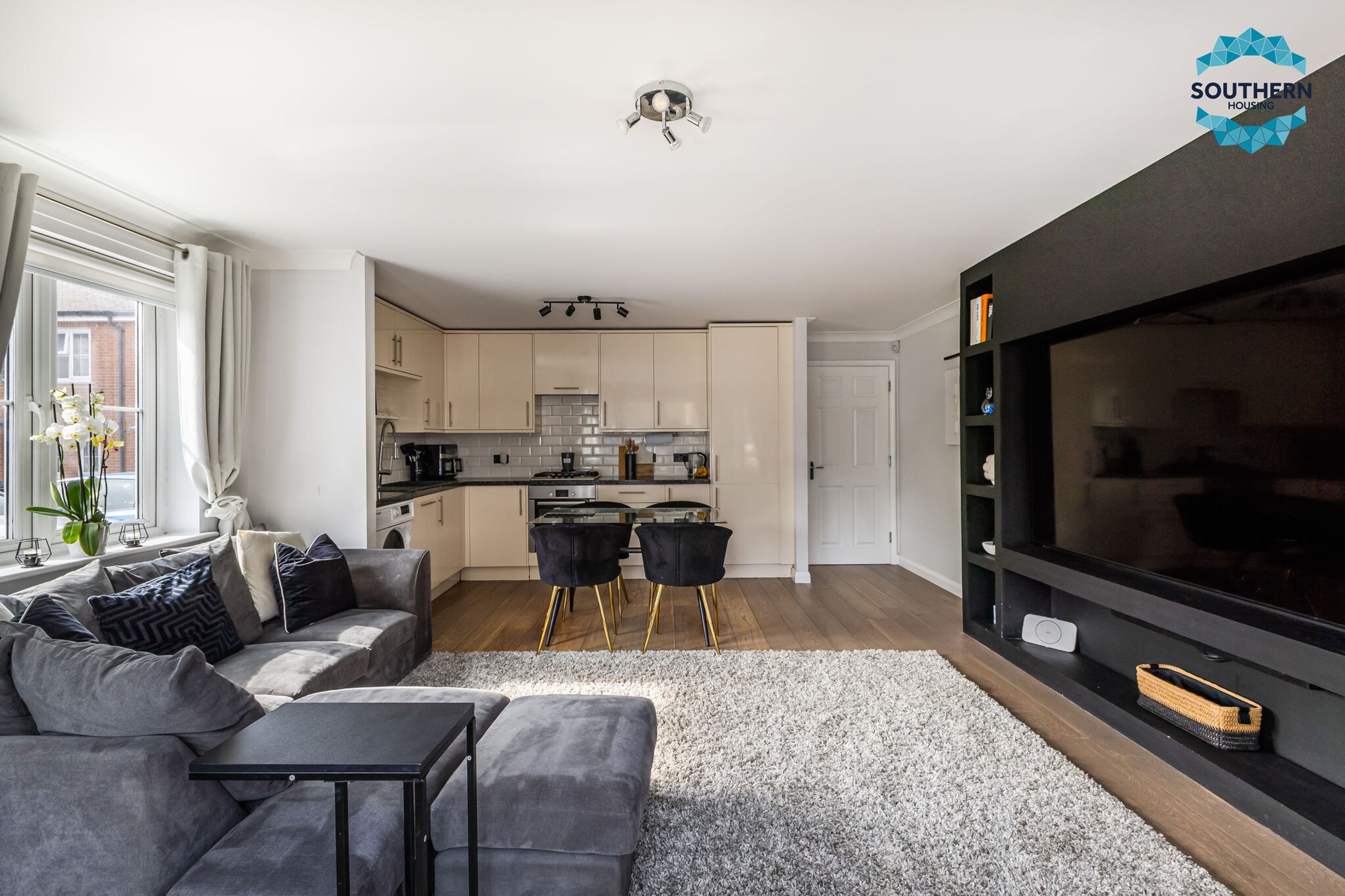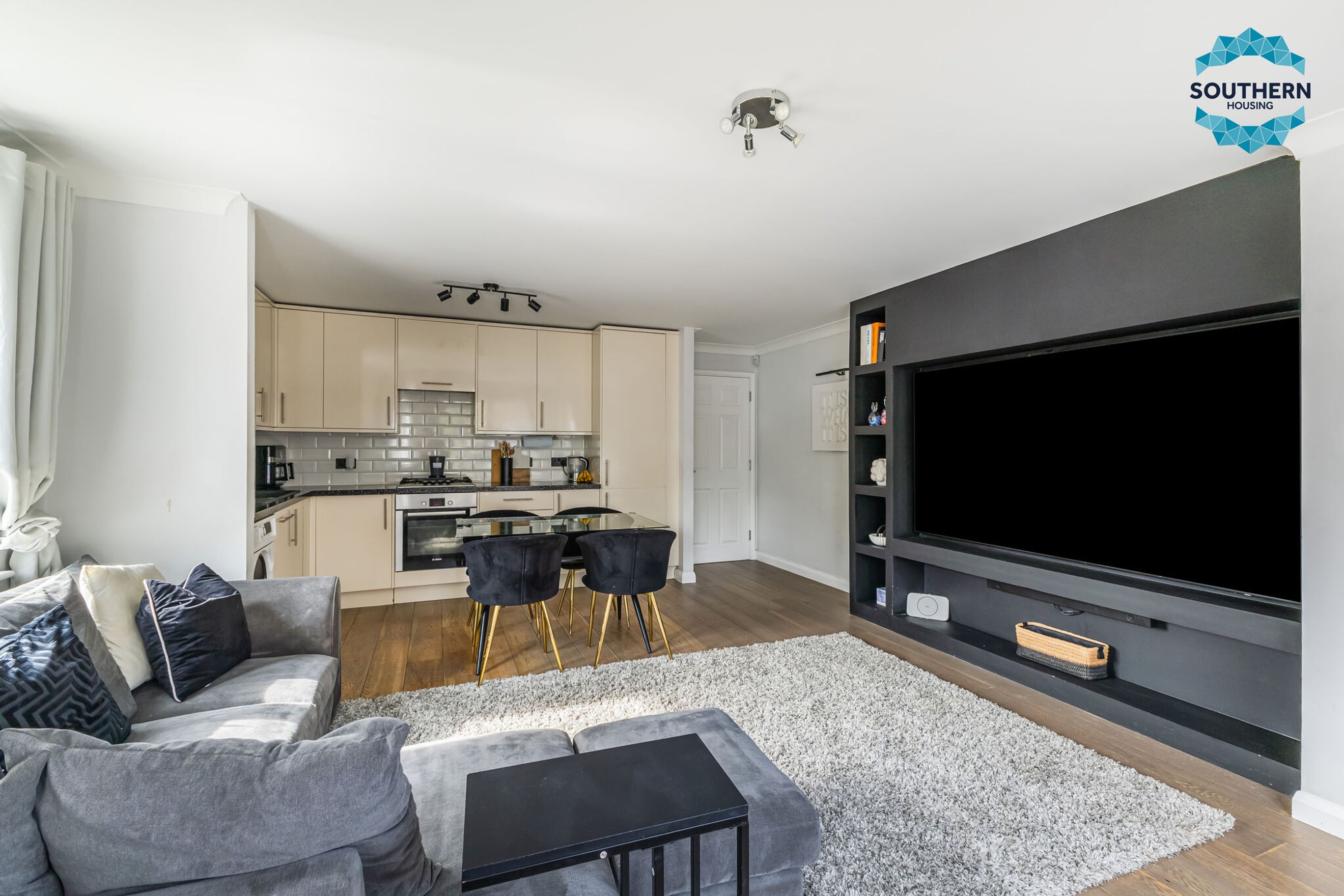 The open-plan living room and kitchen create a spacious and versatile area, perfect for both relaxing and entertaining. The living space is bright and airy, with the benefit of a modern media wall. The modern kitchen features ample storage and counter space, and comes equipped with a hob, extractor fan, oven, and fridge freezer.