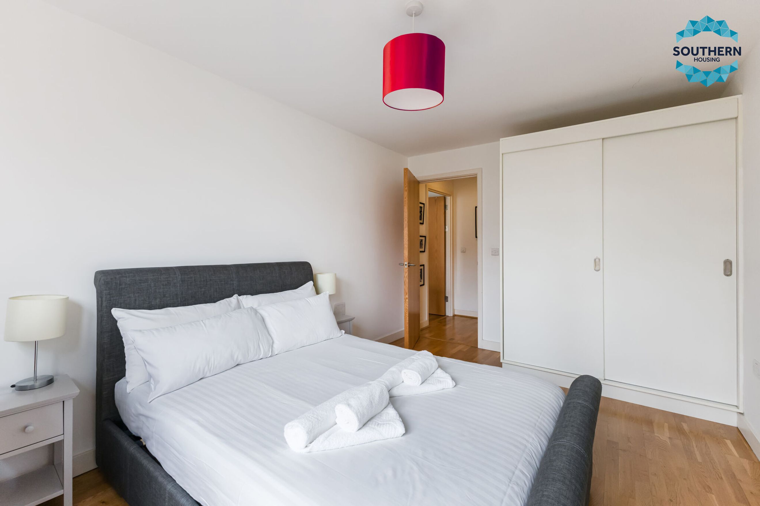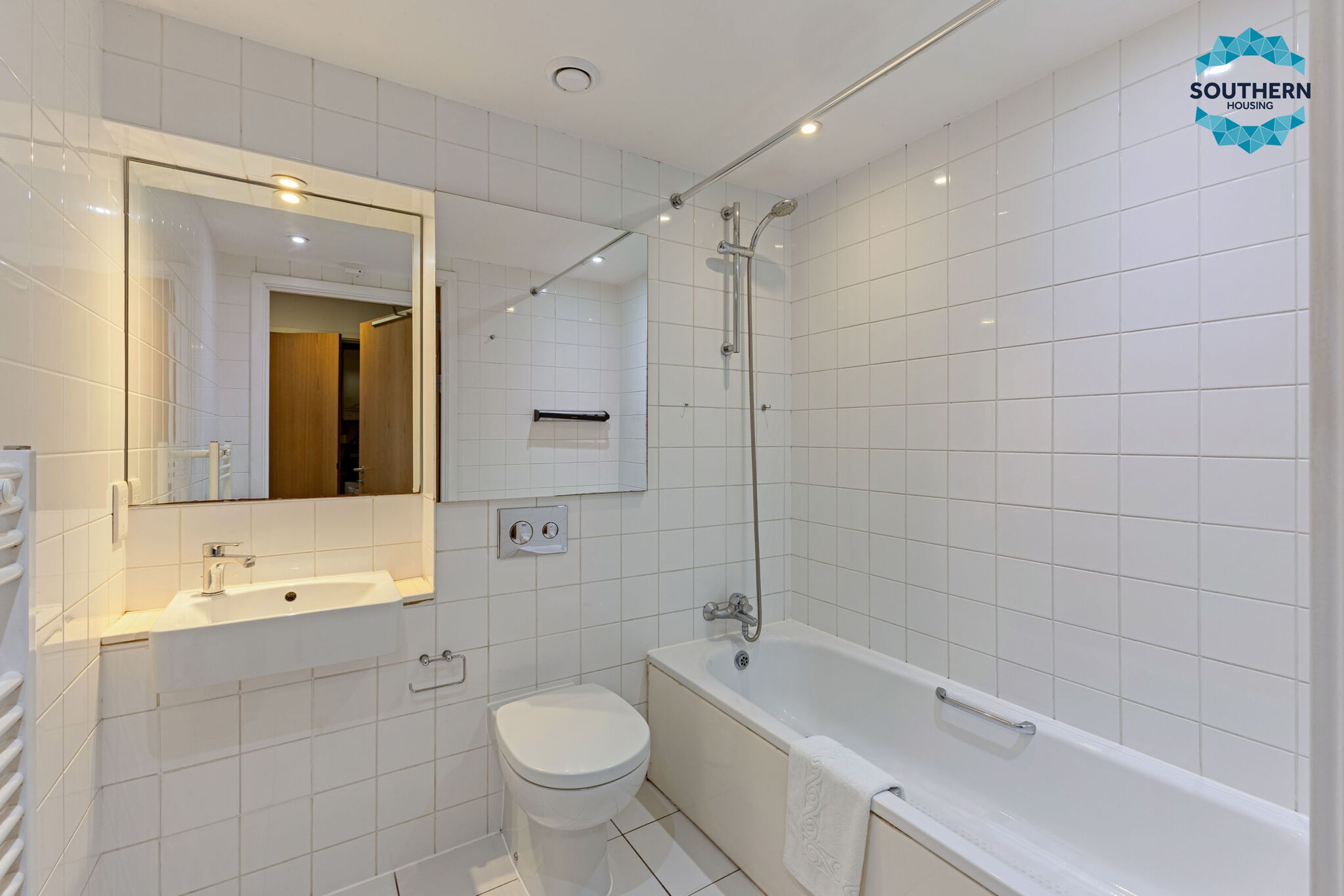 The modern bathroom is well-proportioned and includes both a bath and shower, complemented by an integrated heated towel rail for added comfort.