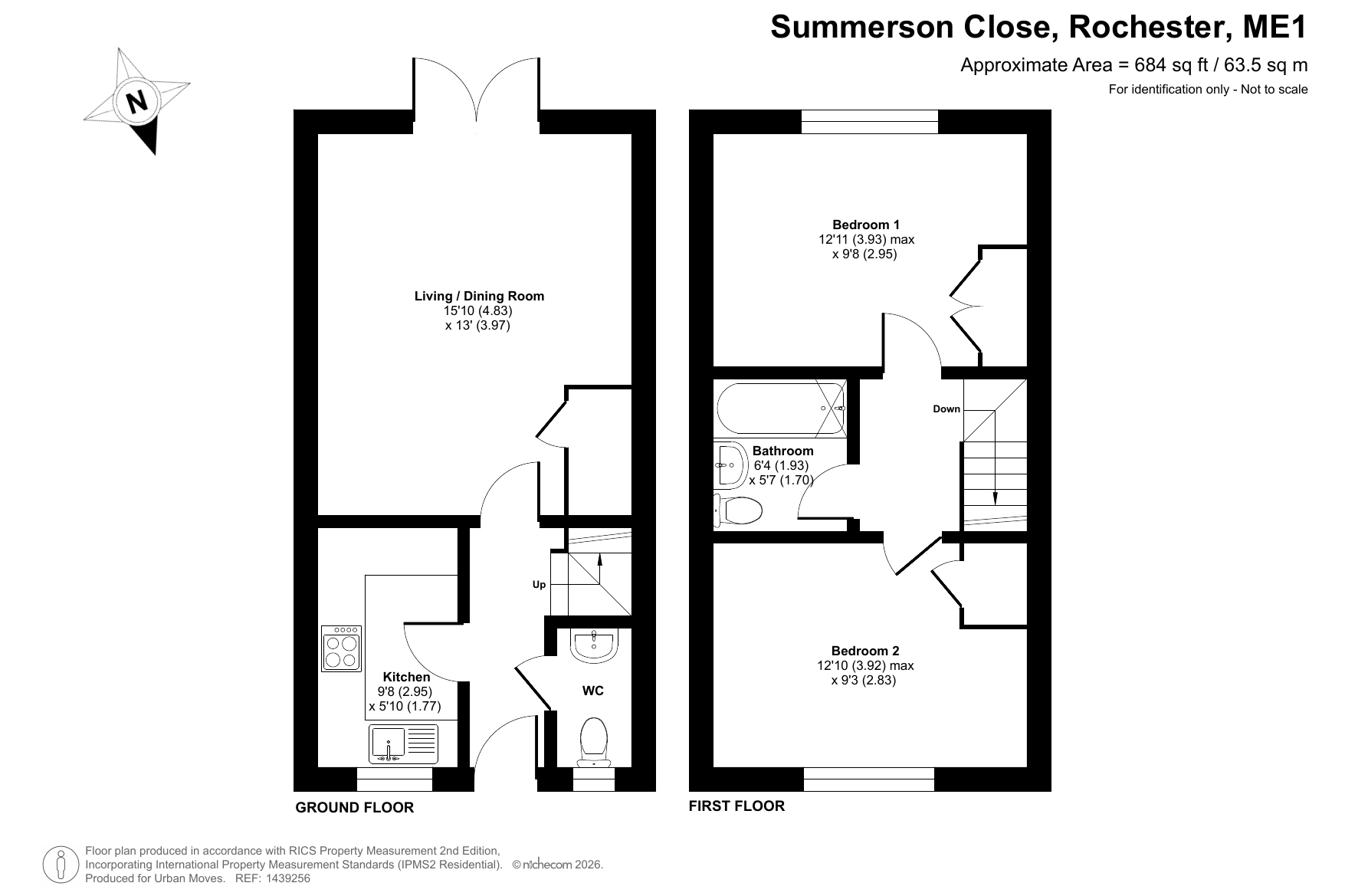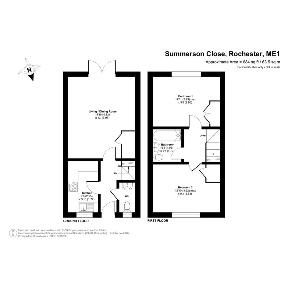 This well-presented. mid-terrace property has a conventional layout with the kitchen and a ground-floor cloakroom/WC at the front while at the rear is a spacious reception room. Patio doors open onto a south/south-west-facing rear garden with raised seating area. On the first floor of the house is a sleek bathroom and two similar-sized double bedrooms. Modern insulation standards, double glazing and gas central heating make for a good energy-efficiency rating. The property comes with an allocated, off-street parking space and the Rochester and Chatham town centres, for their railway stations, shopping facilities and other amenities, can also be reached by bus or bike. Ofsted list several highly-rated schools in the local area. Nearby areas such as Nashenden Down and Capstone Farm Country Park offer hundreds of acres of beautiful, outside space to explore.