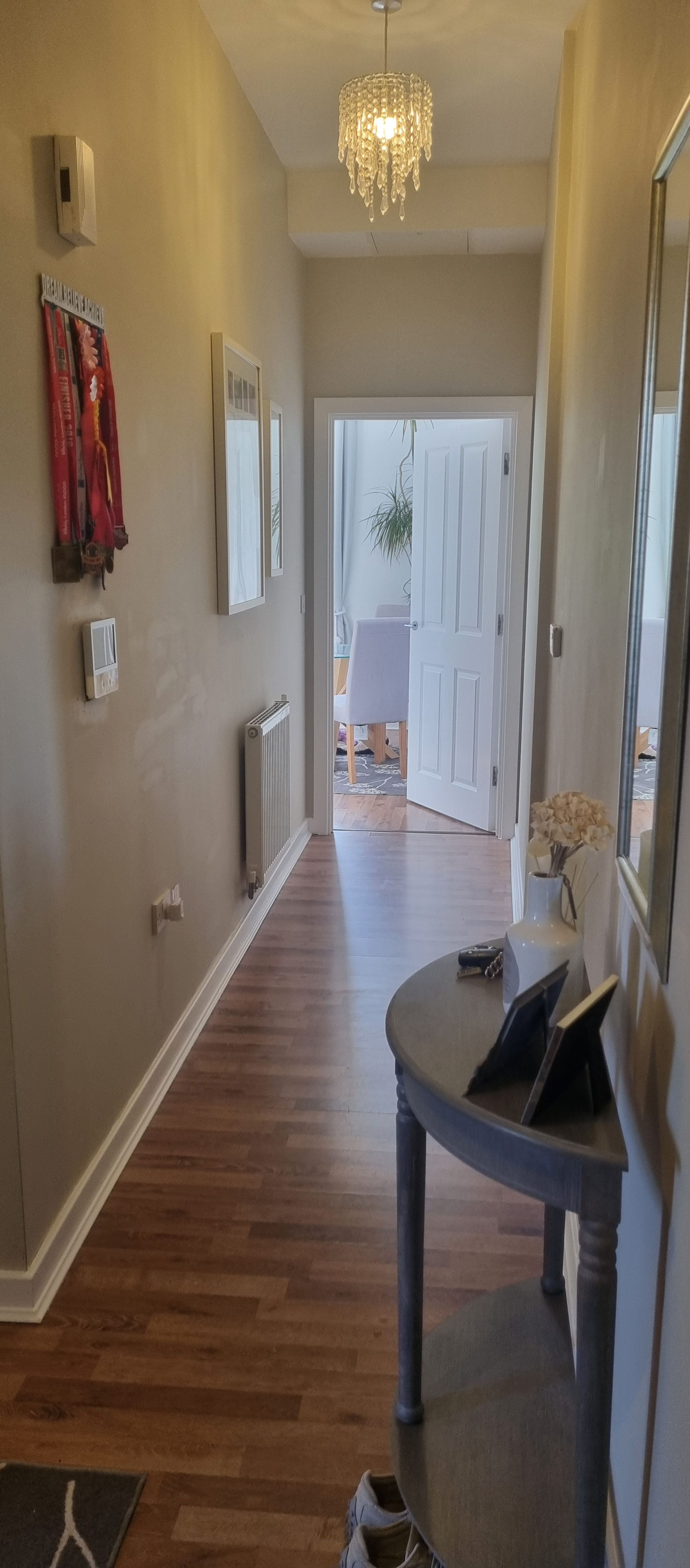 Ground Floor: Communal entrance door, entrance door to the subject flat, lounge/kitchen, two bedrooms, bathroom with WC.