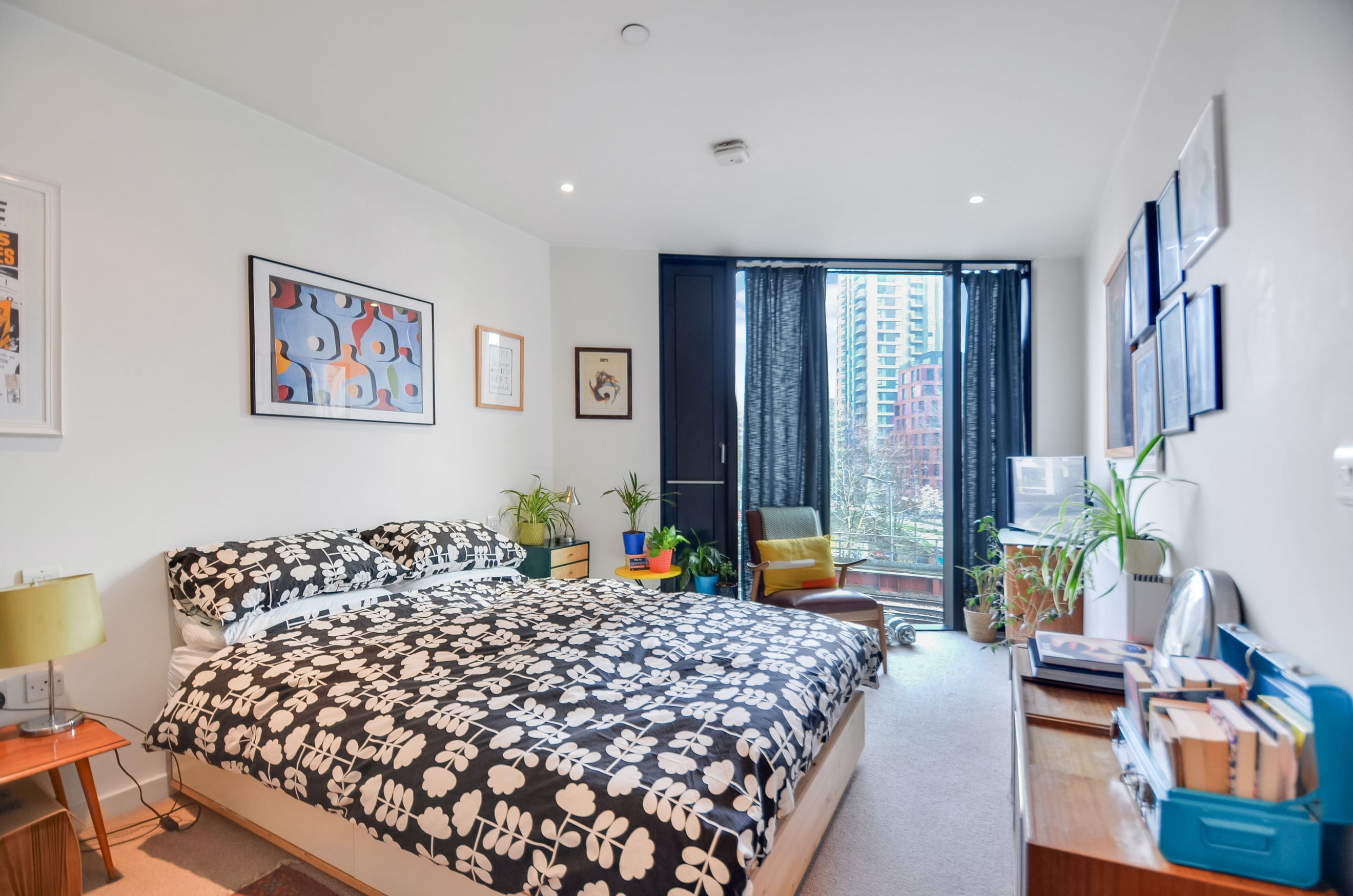 -Light‑filled bedroom with floor‑to‑ceiling window