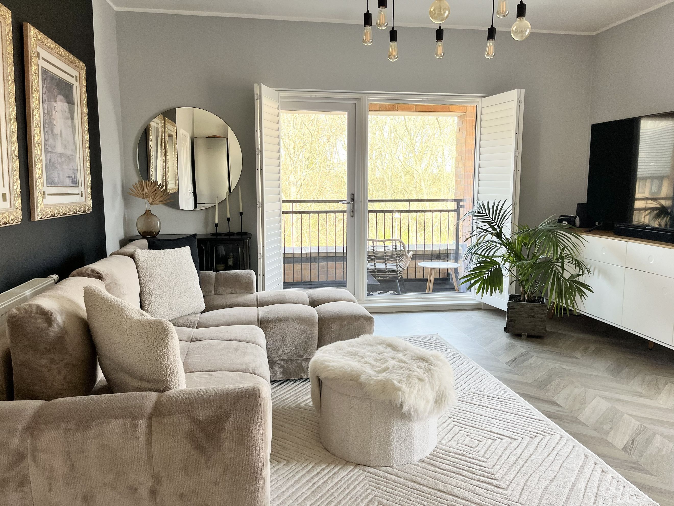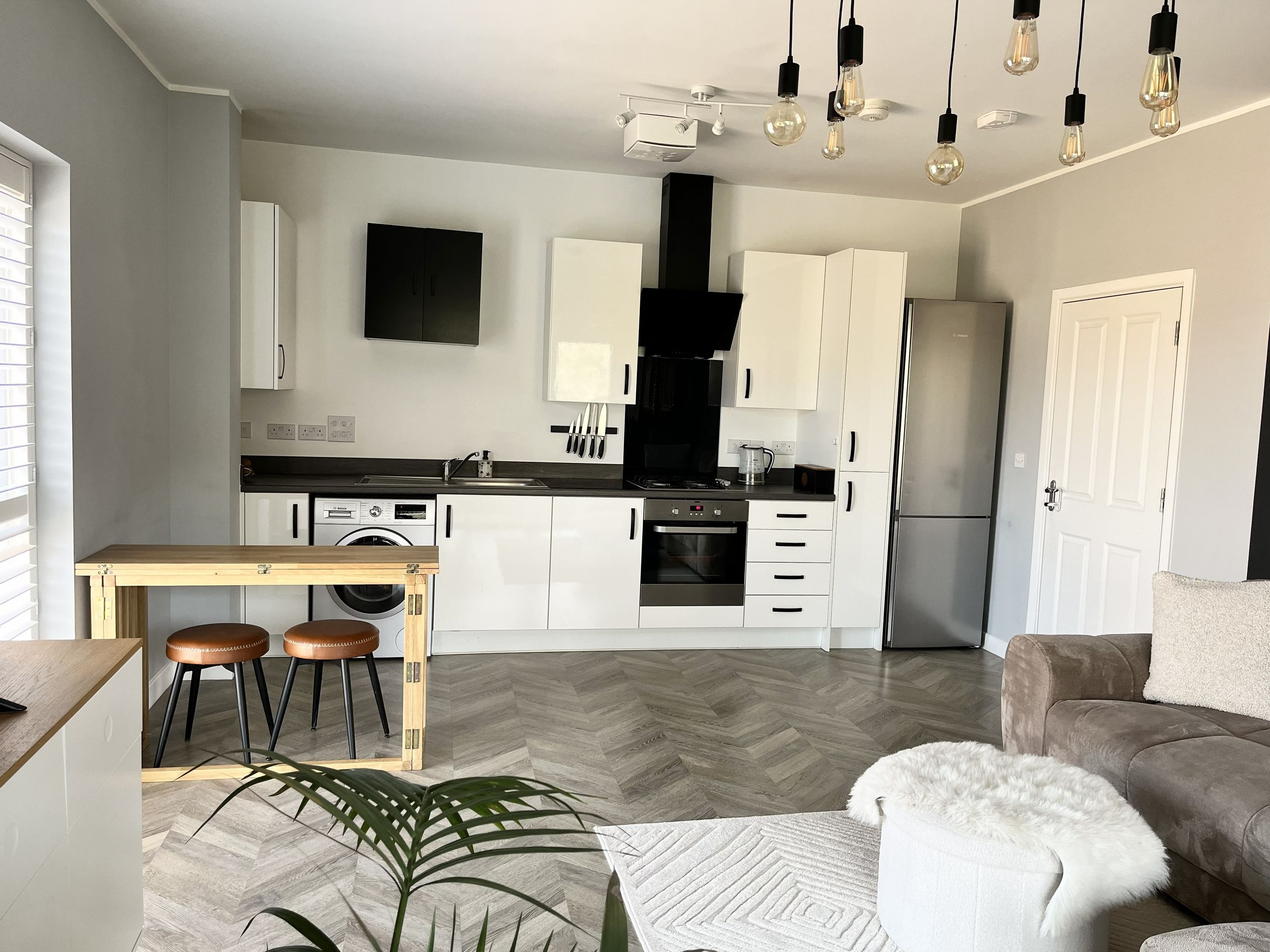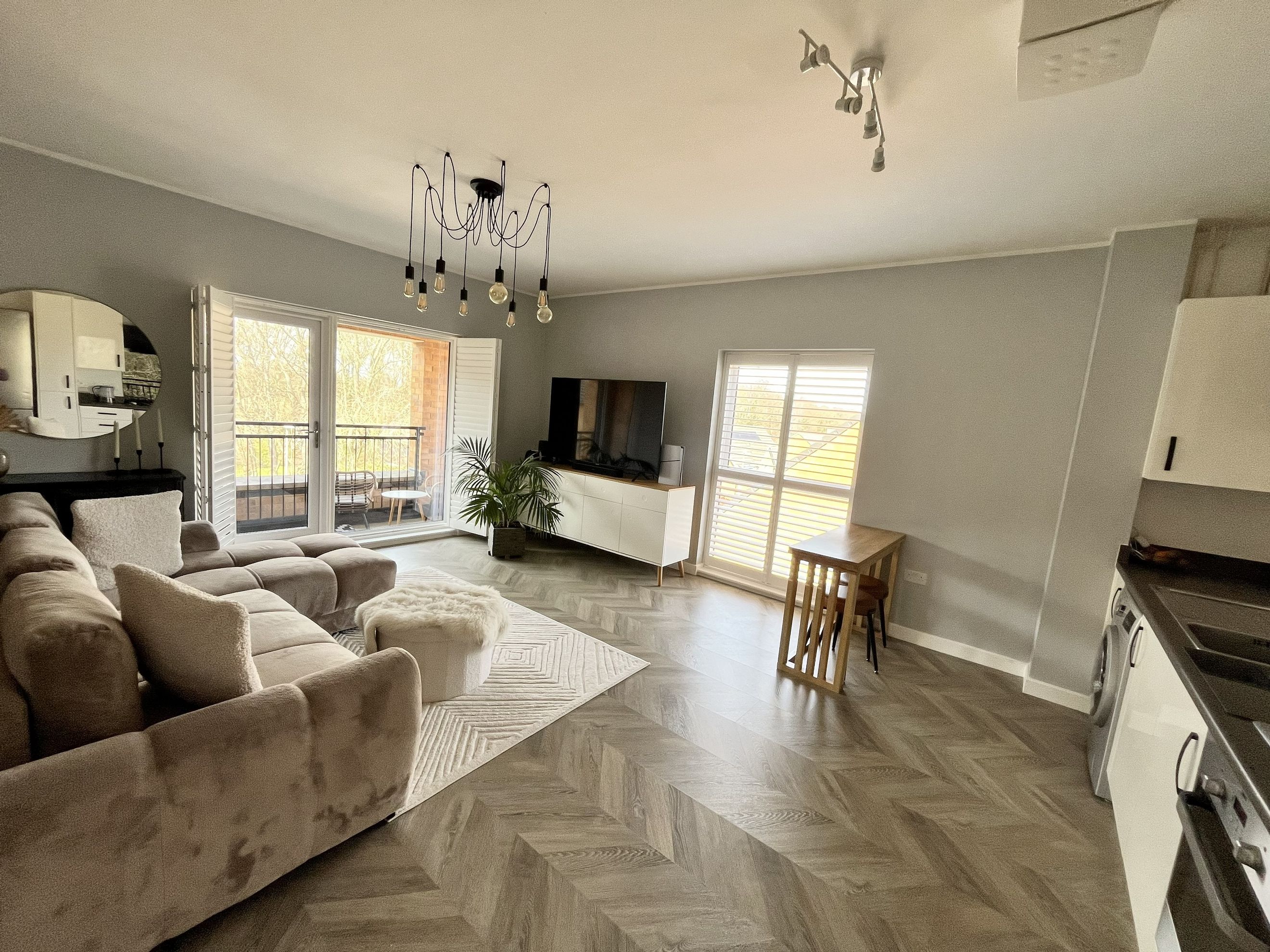 The property features a bright open-plan kitchen/living/dining area with a refreshed kitchen and access to a balcony overlooking parkland towards Weybrook Park Golf Fields. There are two spacious double bedrooms, a modern bathroom, wide hallway, high ceilings and a good size utility/storage room, creating a light and airy feel.