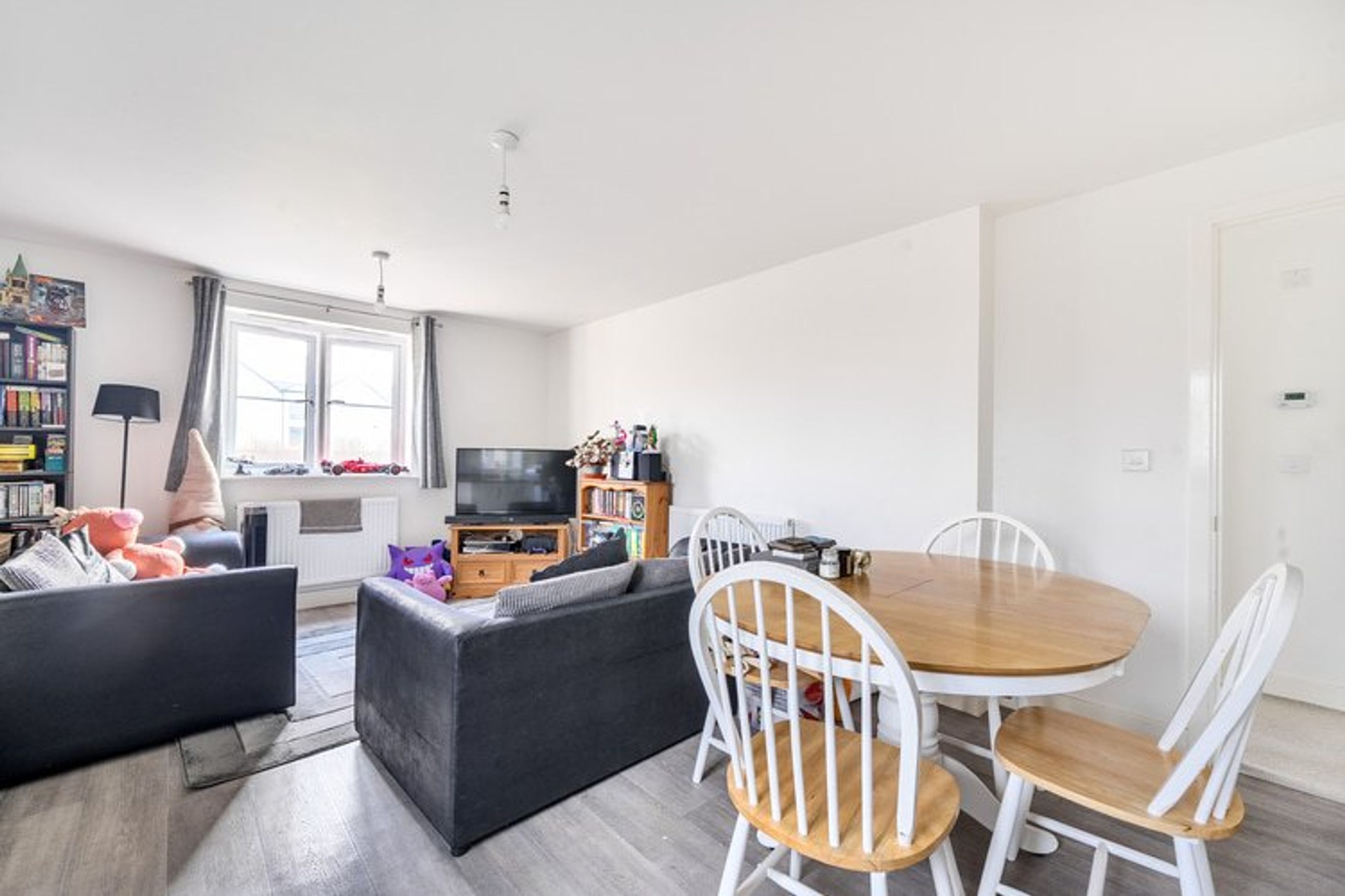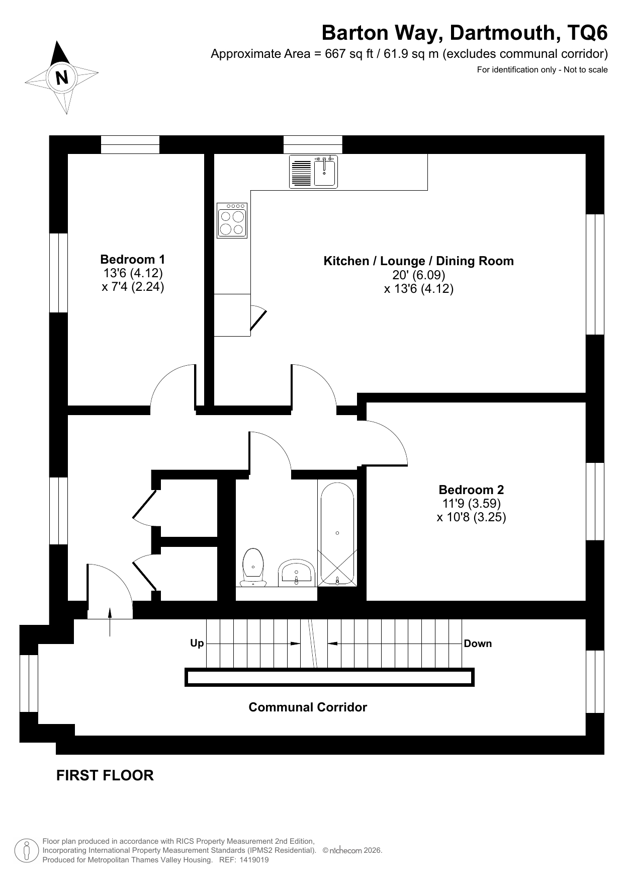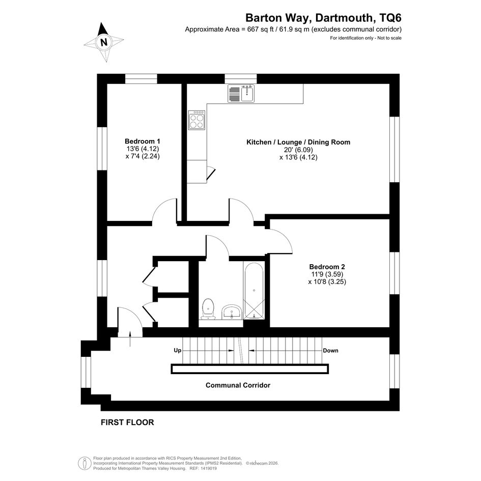 The property on the first floor features a communal corridor, a private entrance hallway with storage space, an open-plan living room and kitchen, two bedrooms and one bathroom.