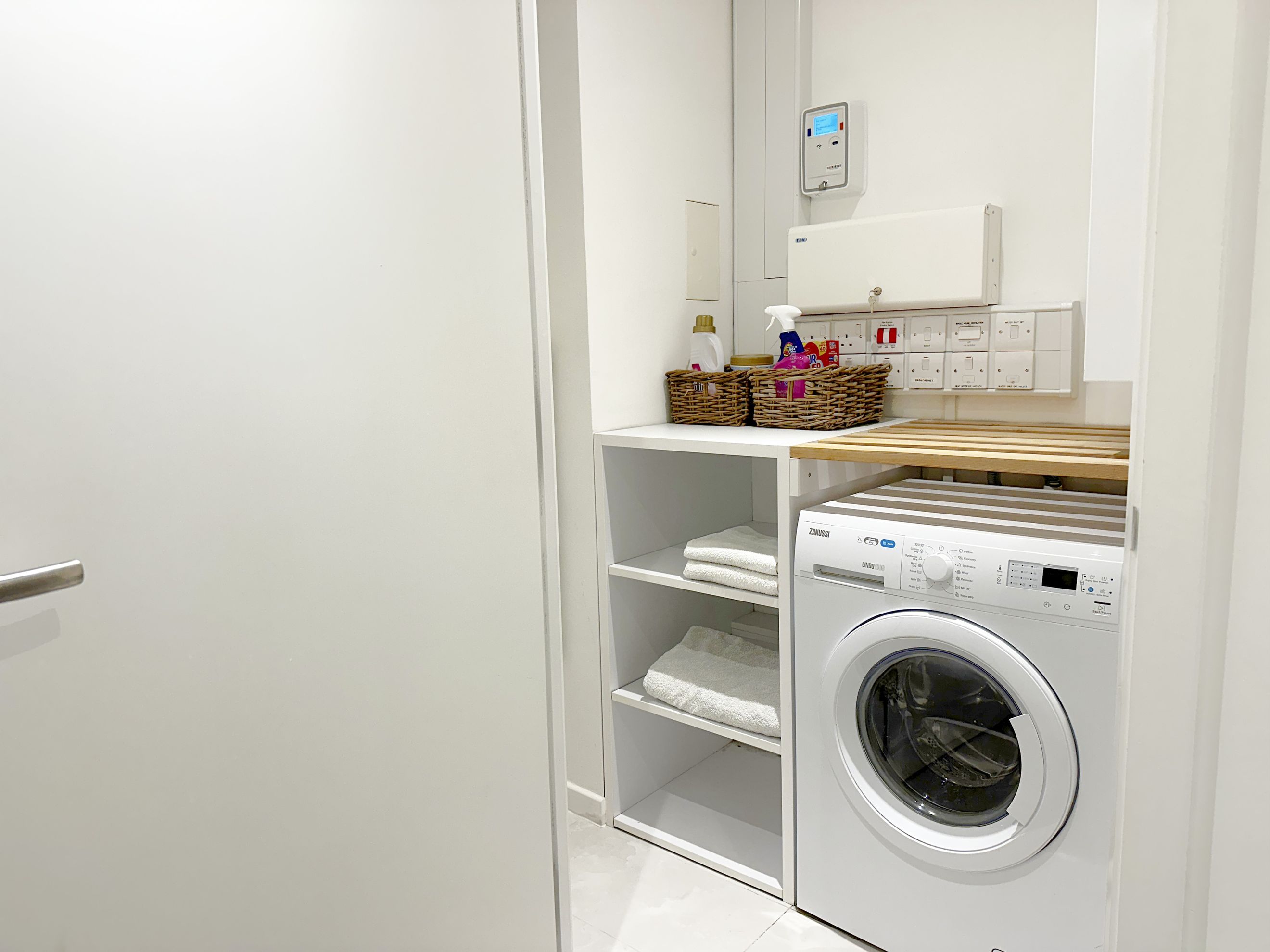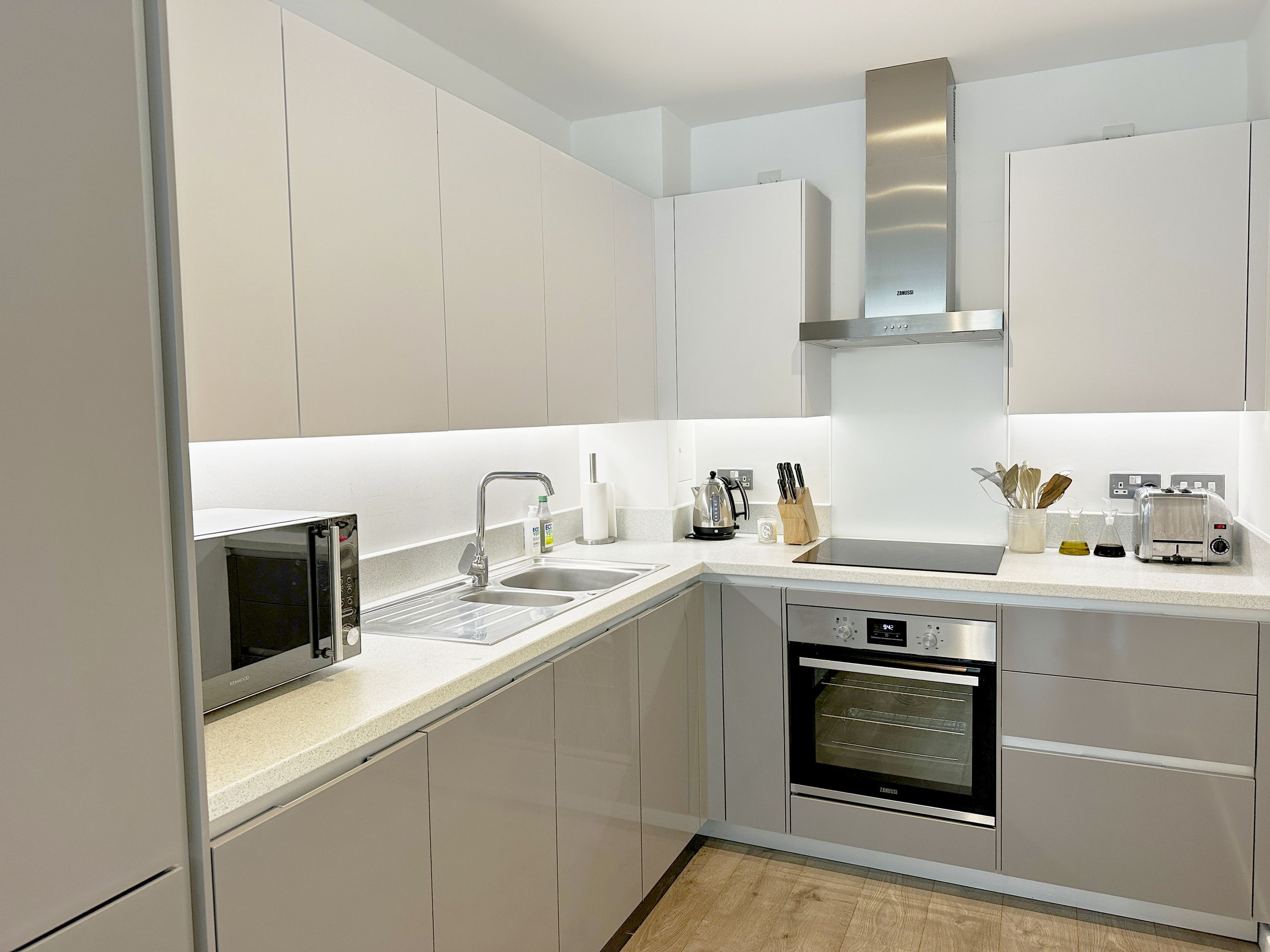 - Integrated appliances including a fridge, oven, electric hob, fan extractor, washing machine and tumble dryer