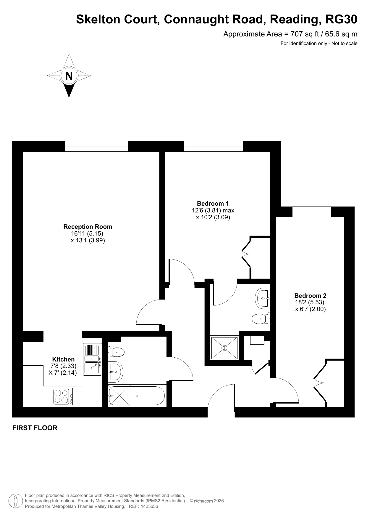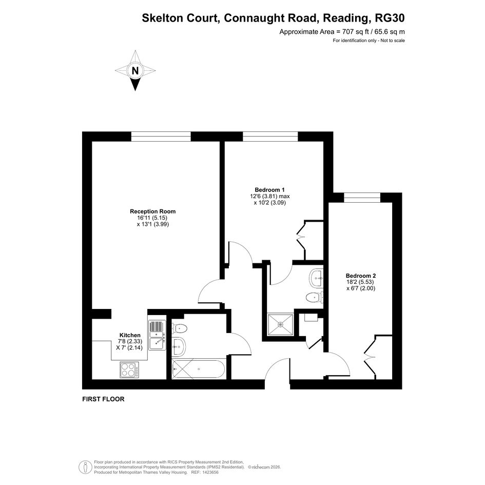 The property features an entrance hallway, a reception room, a separate kitchen, two bedrooms and two bathrooms.