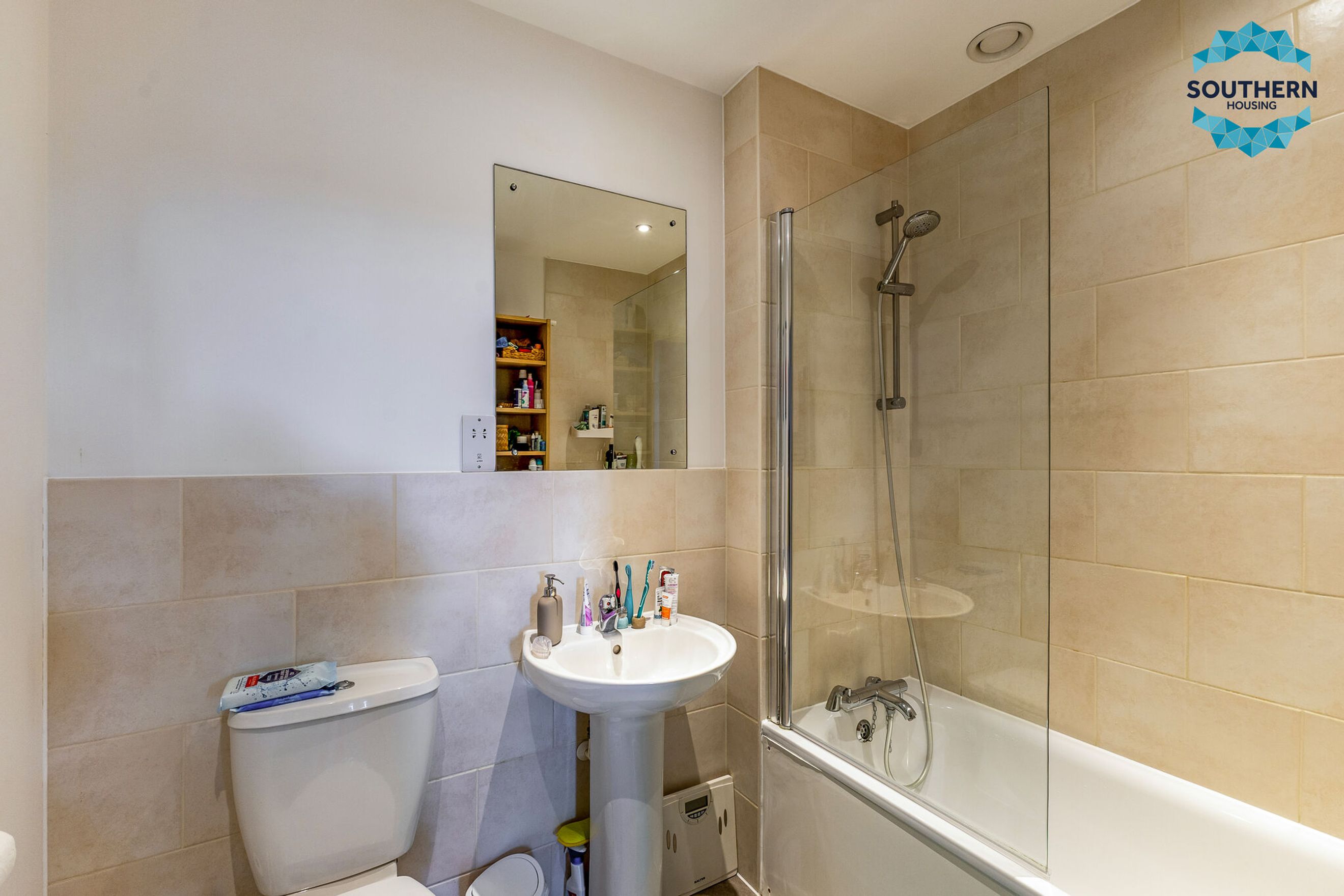 The contemporary bathroom is finished with sleek, neutral fittings and includes a full-sized bath with an overhead shower