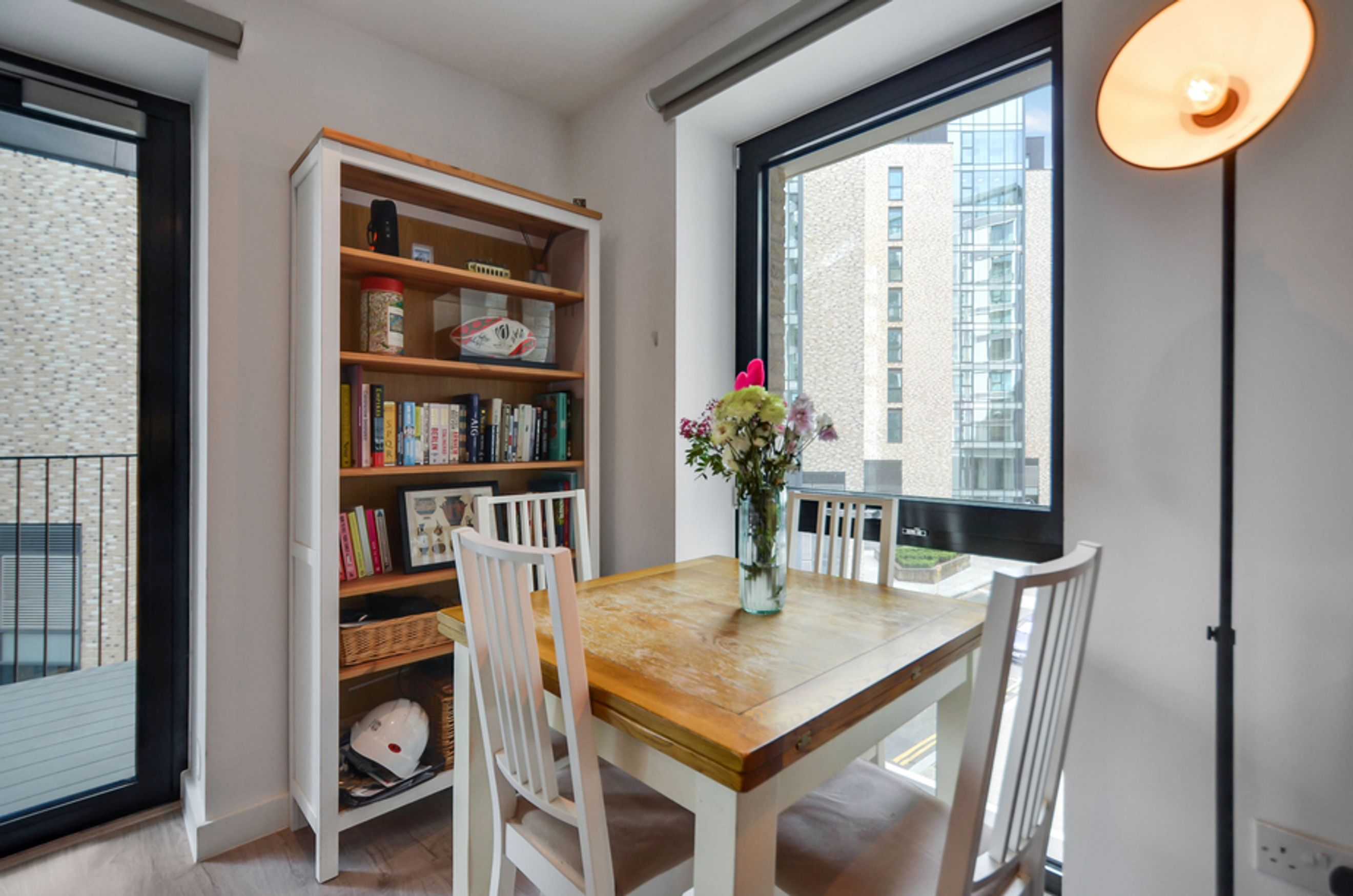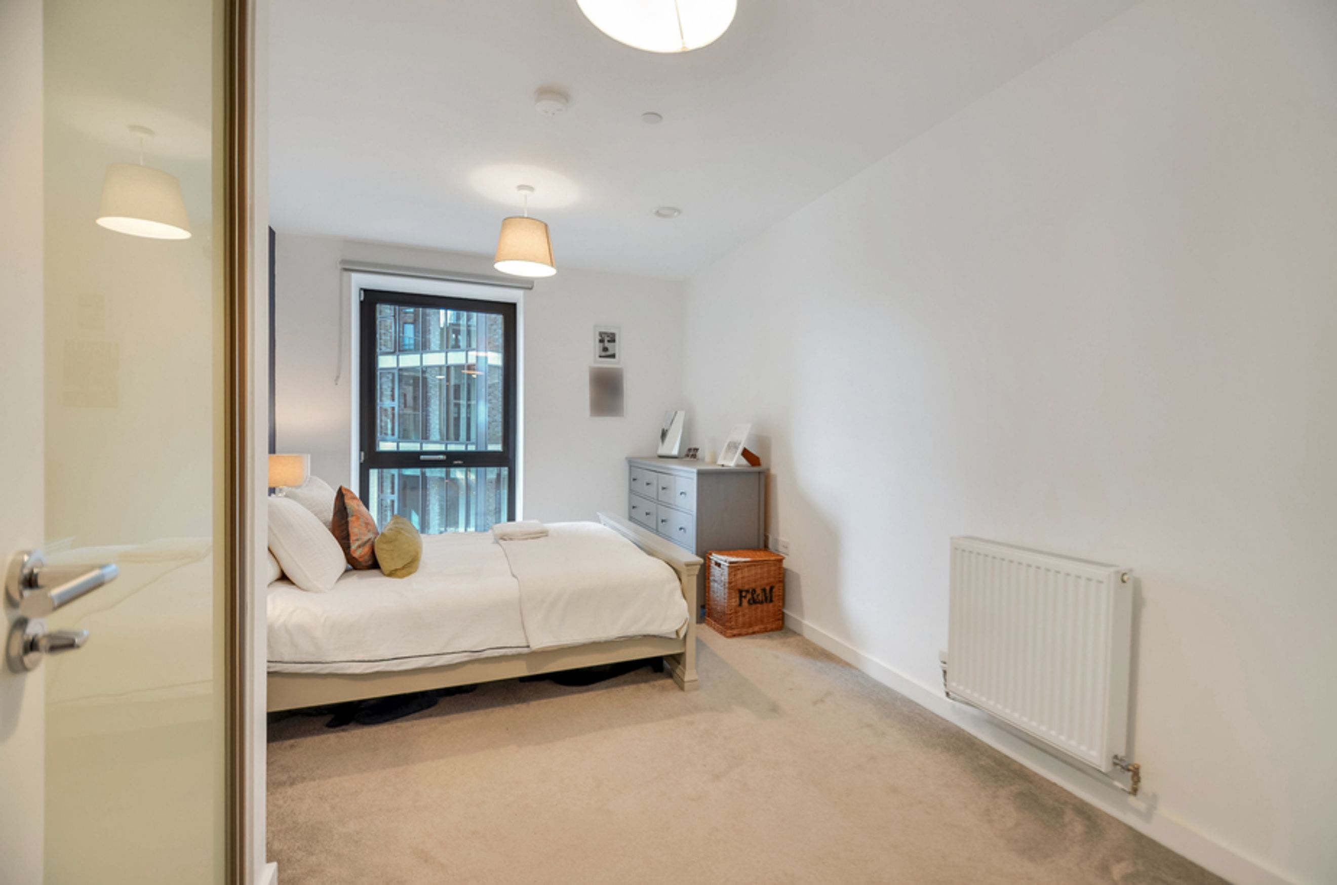 This property offers an open‑plan living area with floor‑to‑ceiling windows, a contemporary kitchen with integrated appliances, and a main bedroom with a fitted wardrobe. Additional benefits include central heating, a private balcony, secure bike storage, and access to a communal garden and playground.