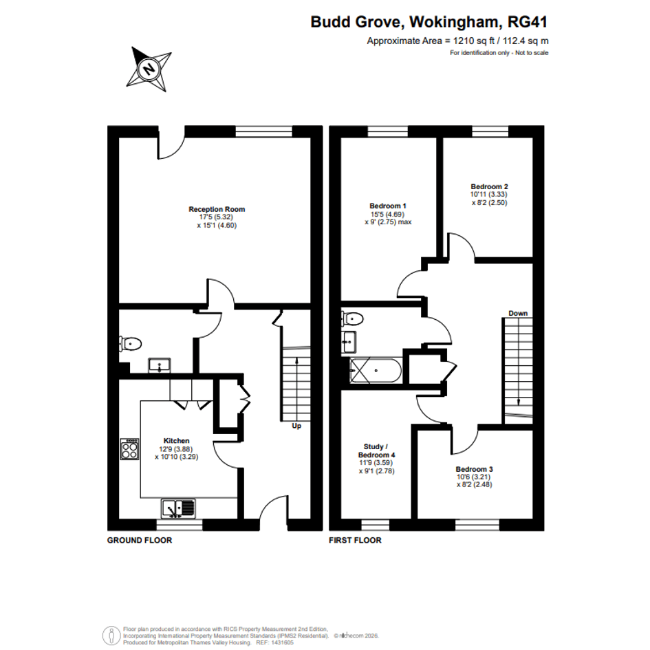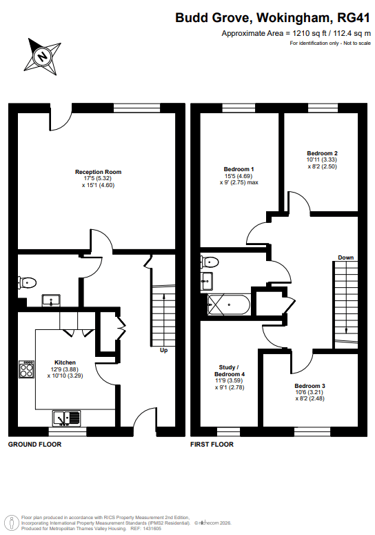 The property features an entrance hallway, reception room, separate kitchen and a toilet on the ground floor. On the first floor, there are four bedrooms and one family bathroom.