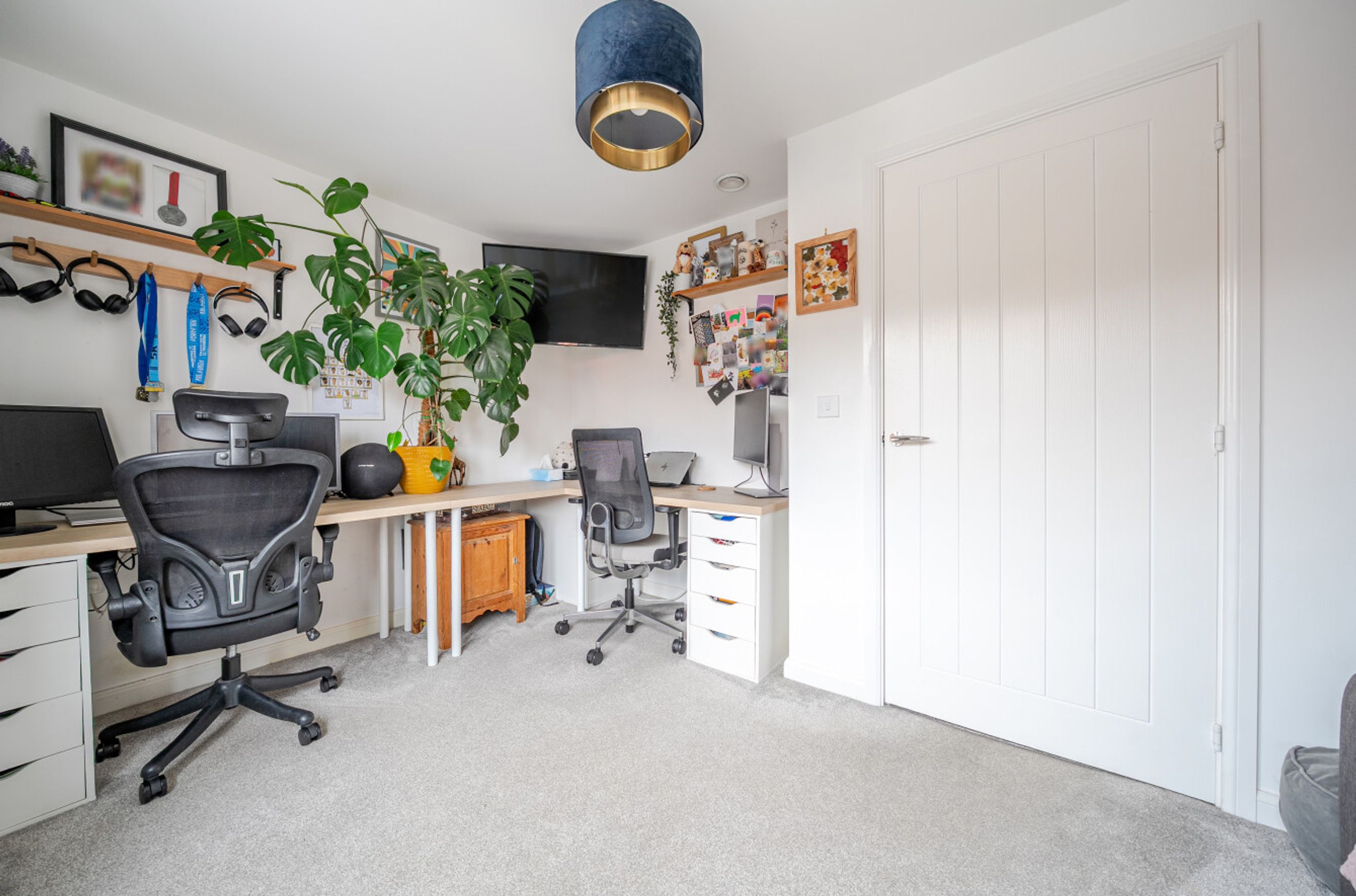 Upstairs, the property offers two well-proportioned double bedrooms. The principal bedroom is a particularly generous size, while the second bedroom provides flexibility for use as a guest room, home office, or nursery. A modern family bathroom serves both rooms.