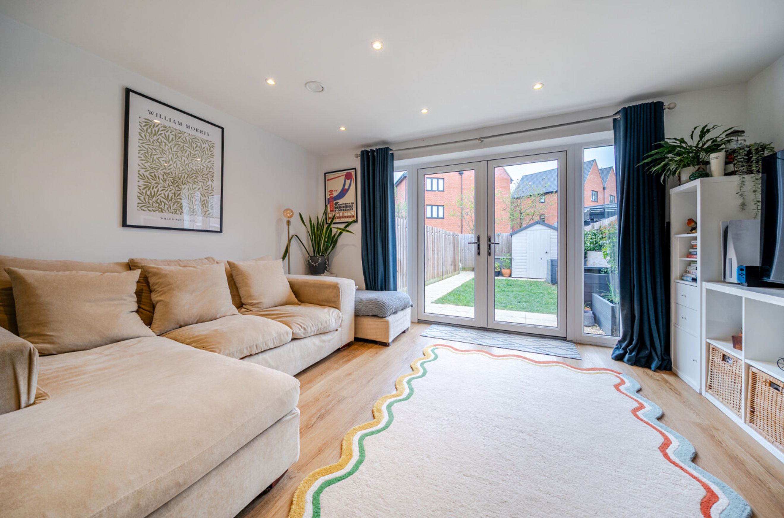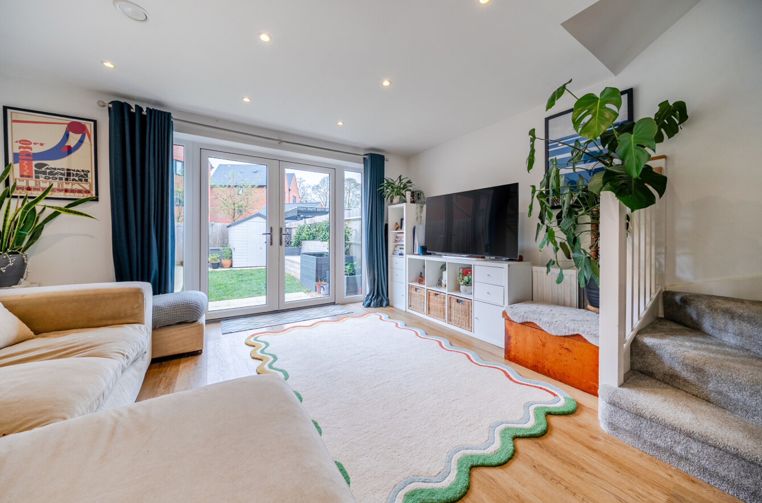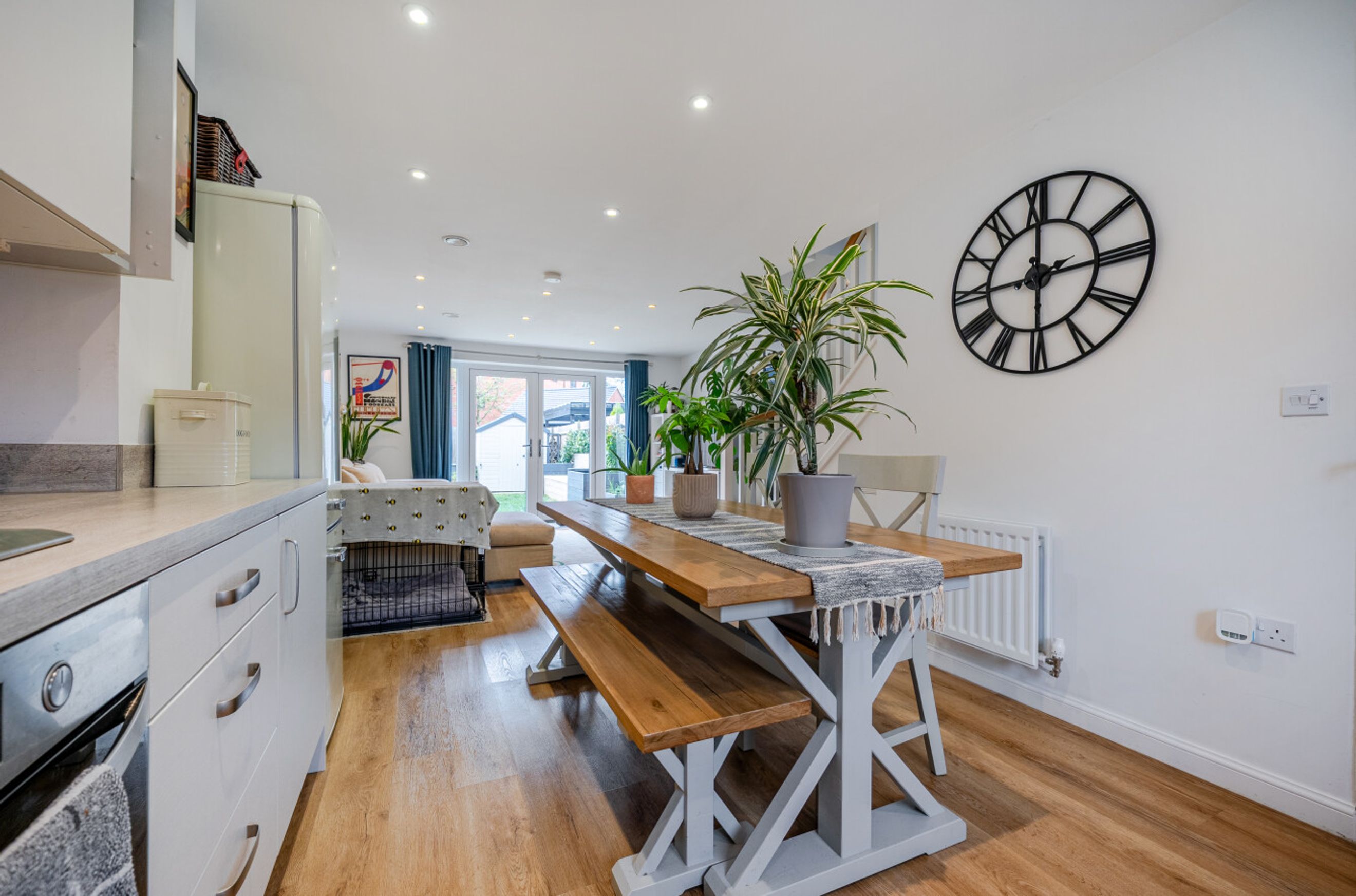 The ground floor is particularly impressive, featuring a generous open-plan kitchen/dining/living area measuring over 27ft in length. This versatile layout is ideal for both everyday living and entertaining, with clearly defined areas for cooking, dining, and relaxing. The kitchen is fitted with contemporary units and ample worktop space, with room for freestanding appliances, while French doors to the rear open directly onto the garden, allowing natural light to flood the space and creating a seamless indoor-outdoor connection.