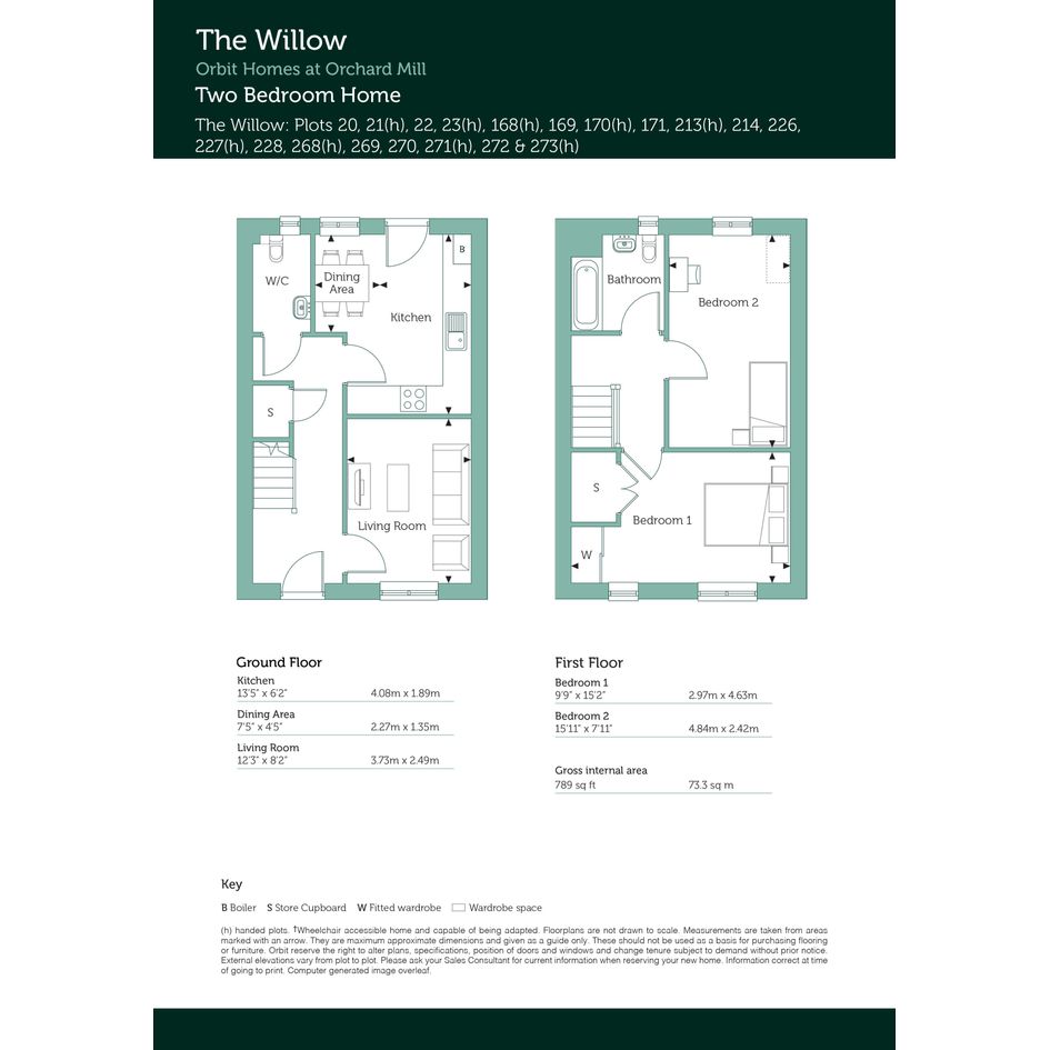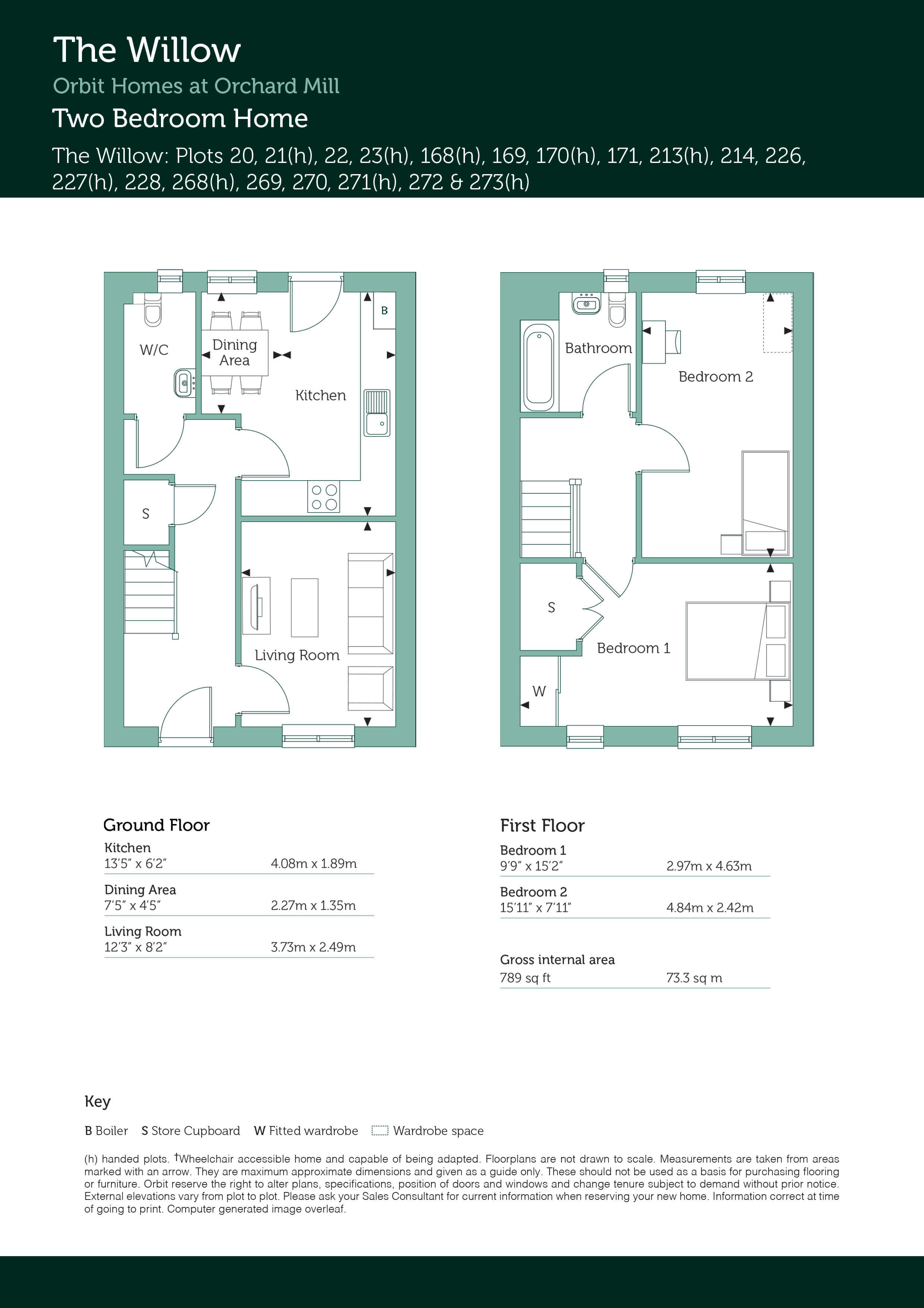 Floorplans: (h) handed plots. Floorplans are not drawn to scale. Measurements are taken from areas marked with an arrow. They are maximum approximate dimensions and given as a guide only. These should not be used as a basis for purchasing flooring or furniture. Orbit reserve the right to alter plans, specifications, position of doors and windows and change tenure subject to demand without prior notice. External elevations vary from plot to plot. Please ask your Sales Consultant for current information when reserving your new home. Information correct at time of going to print.