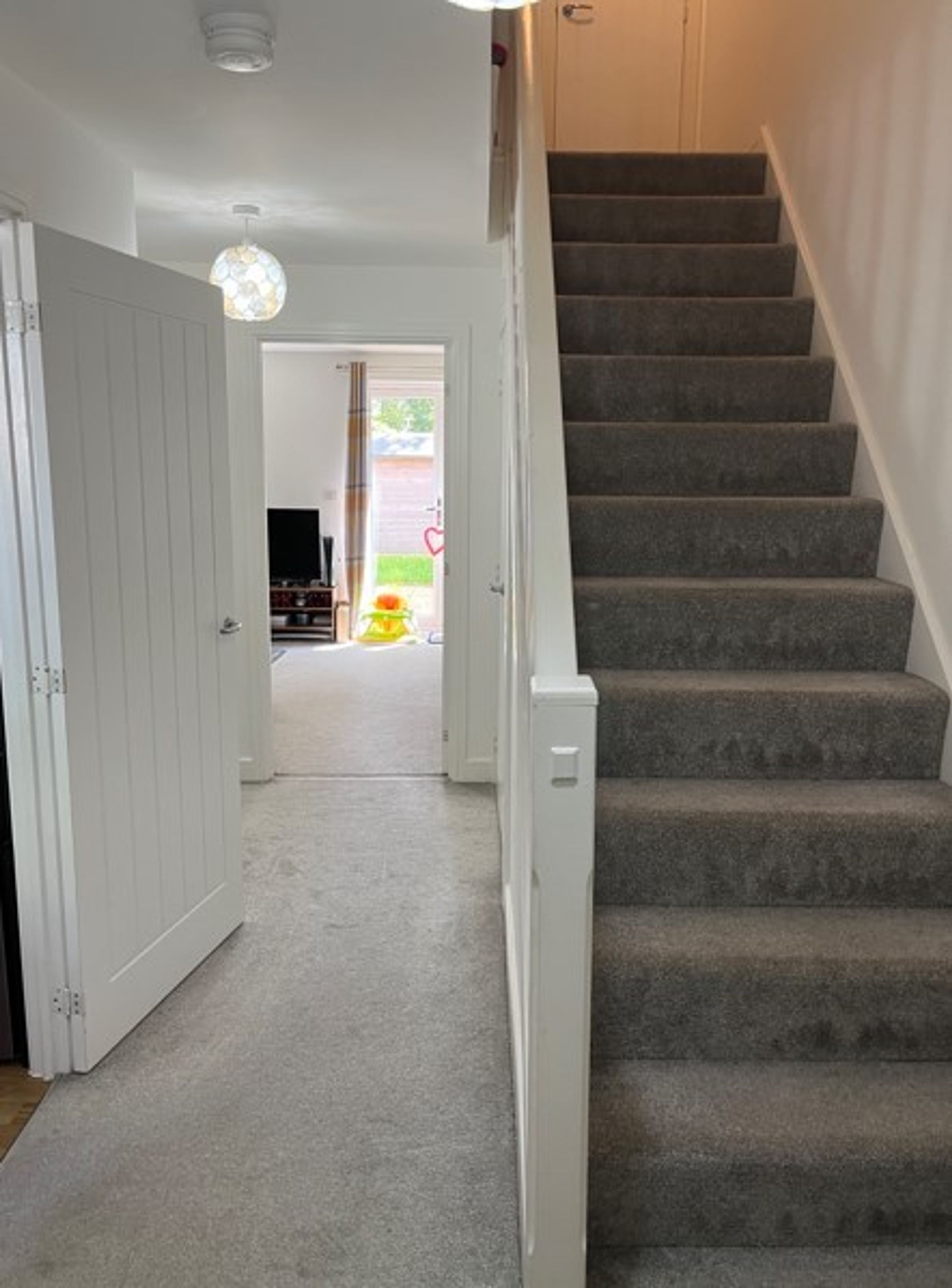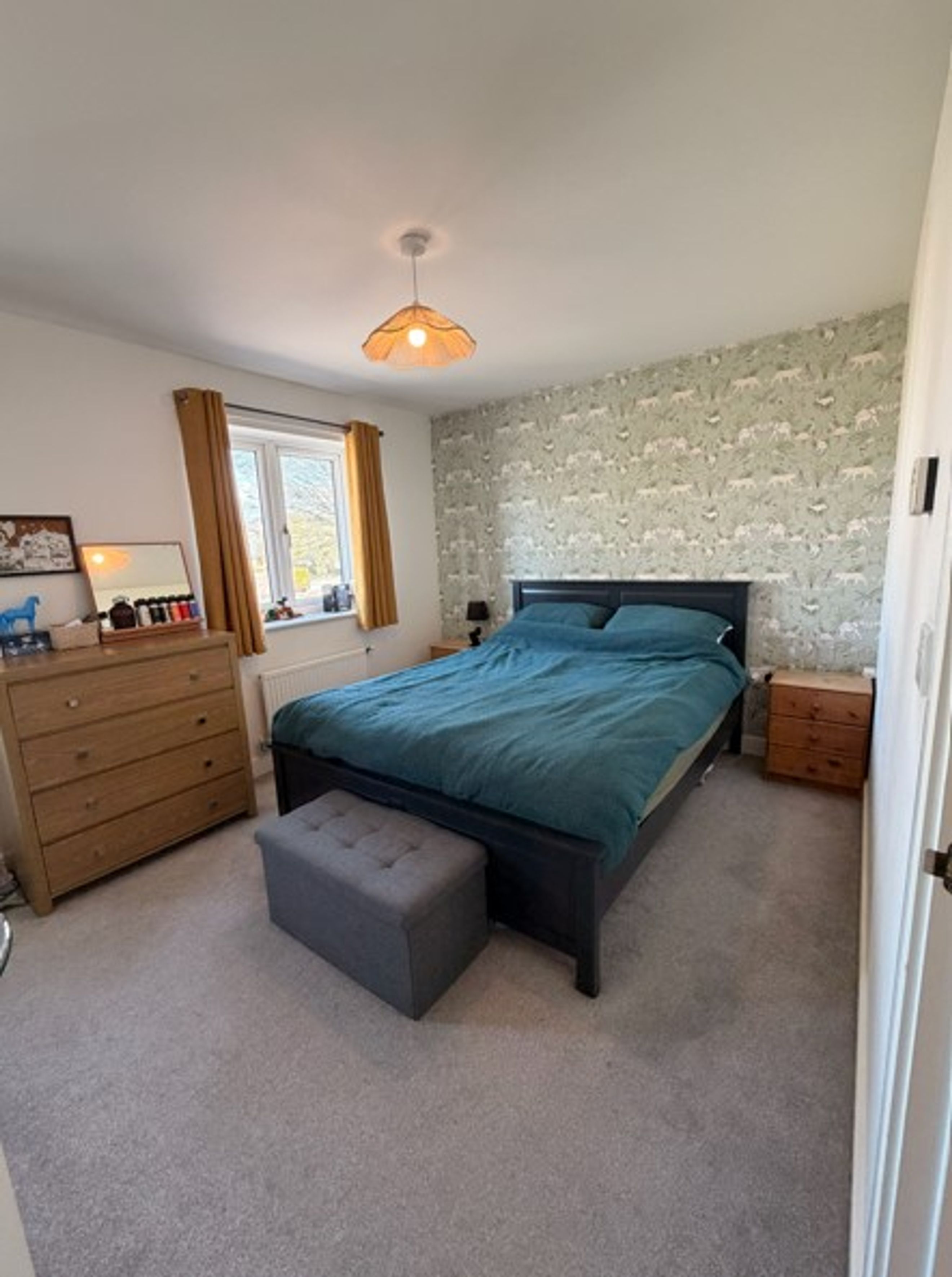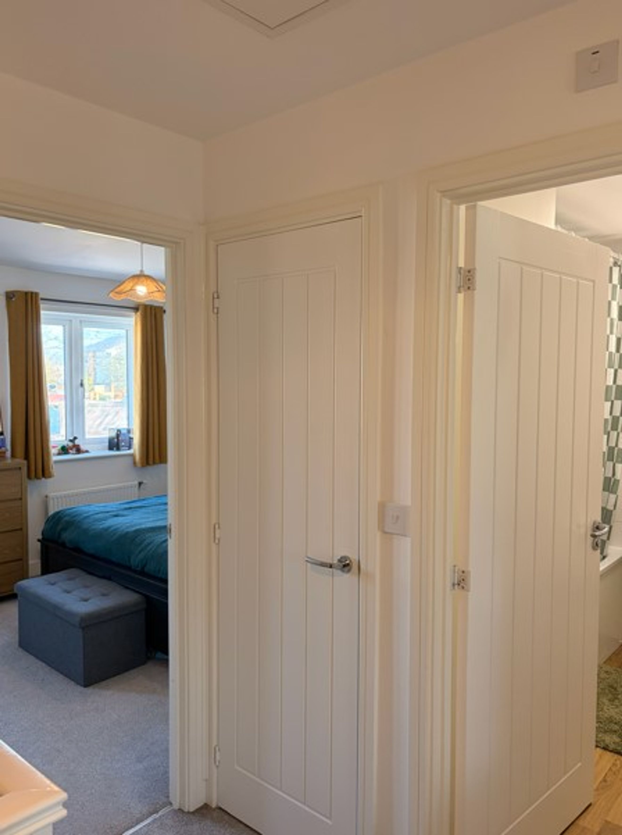 Upstairs are two double bedrooms, with the master benefiting from built‑in wardrobes, along with a family bathroom fitted with a three‑piece suite and shower over the bath, as well as two storage cupboards on the landing.