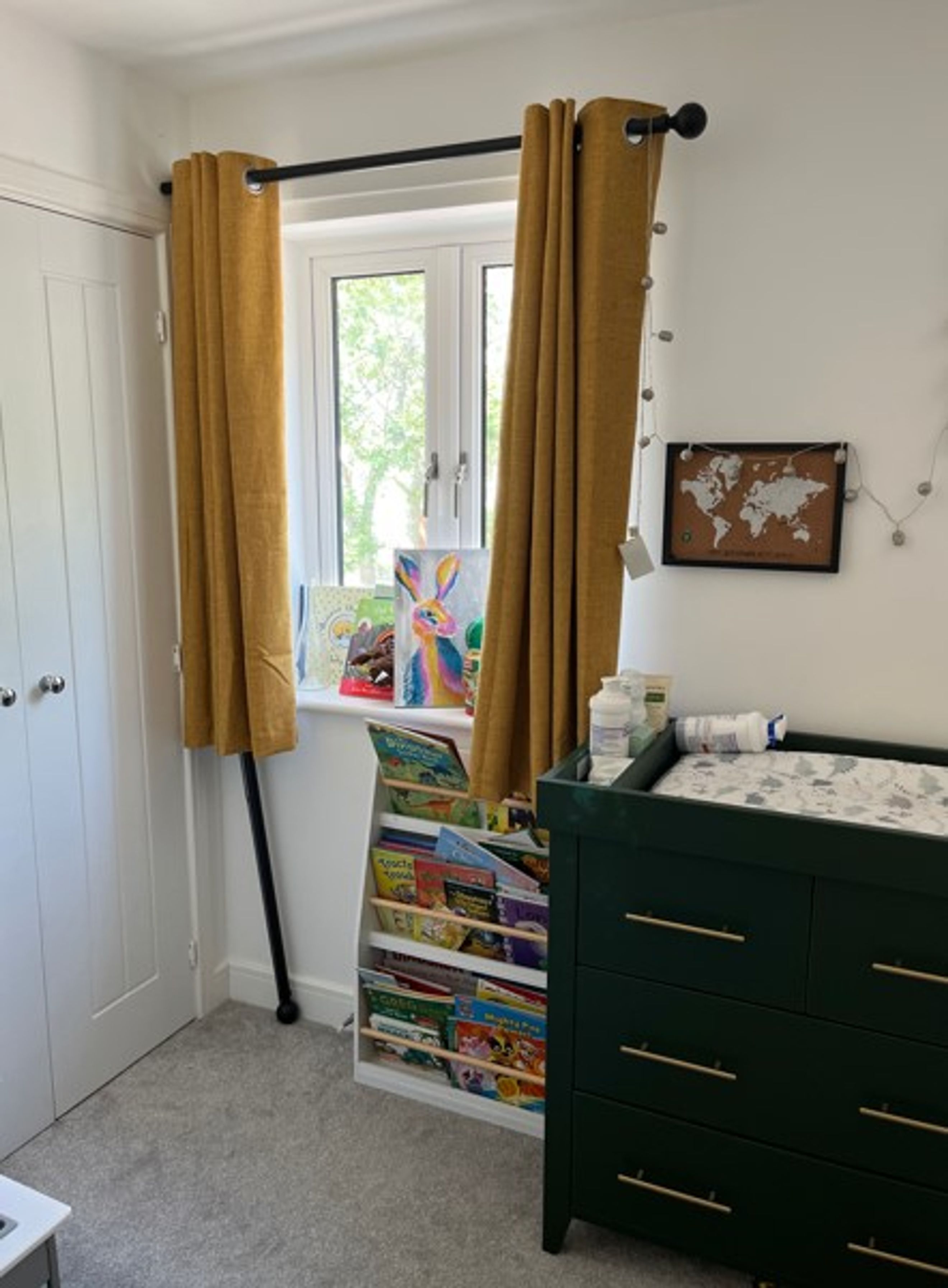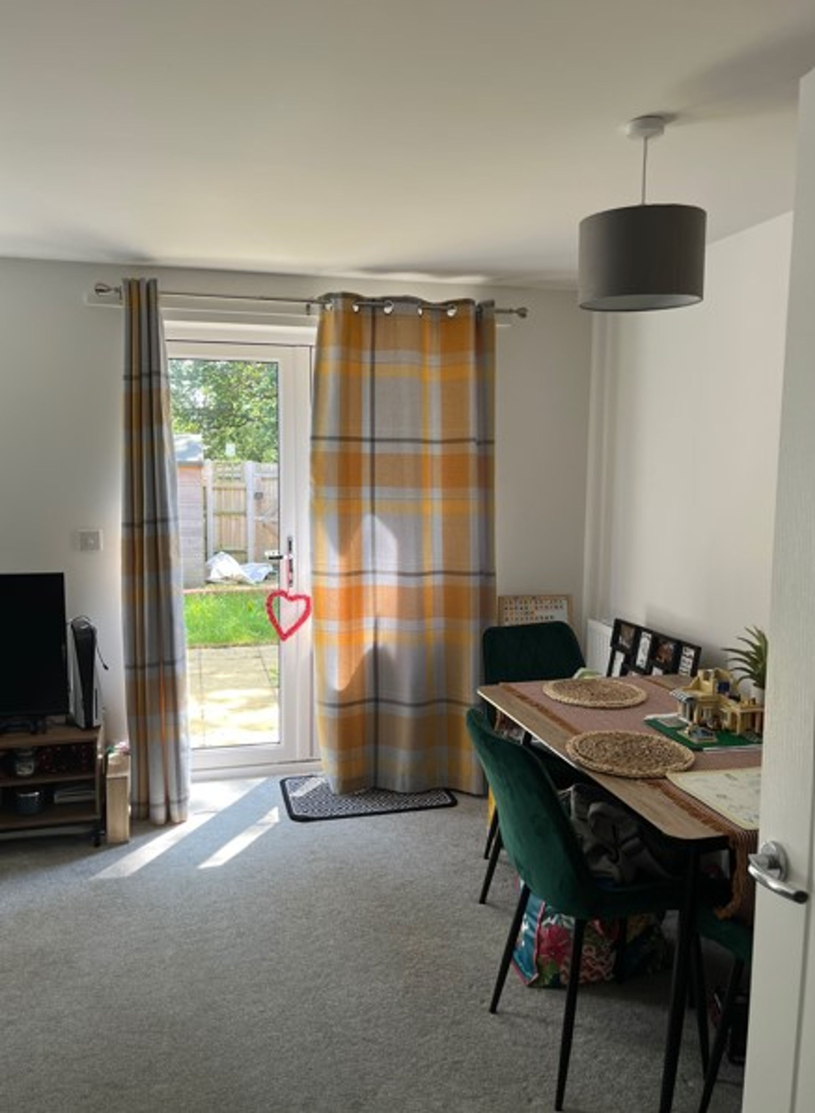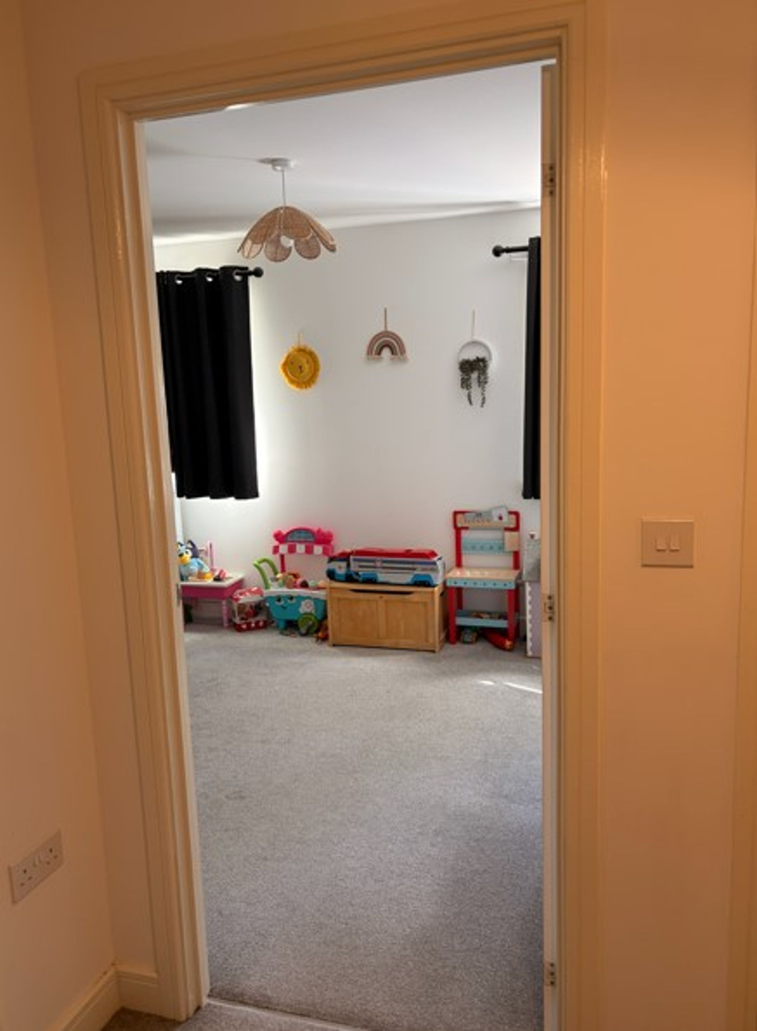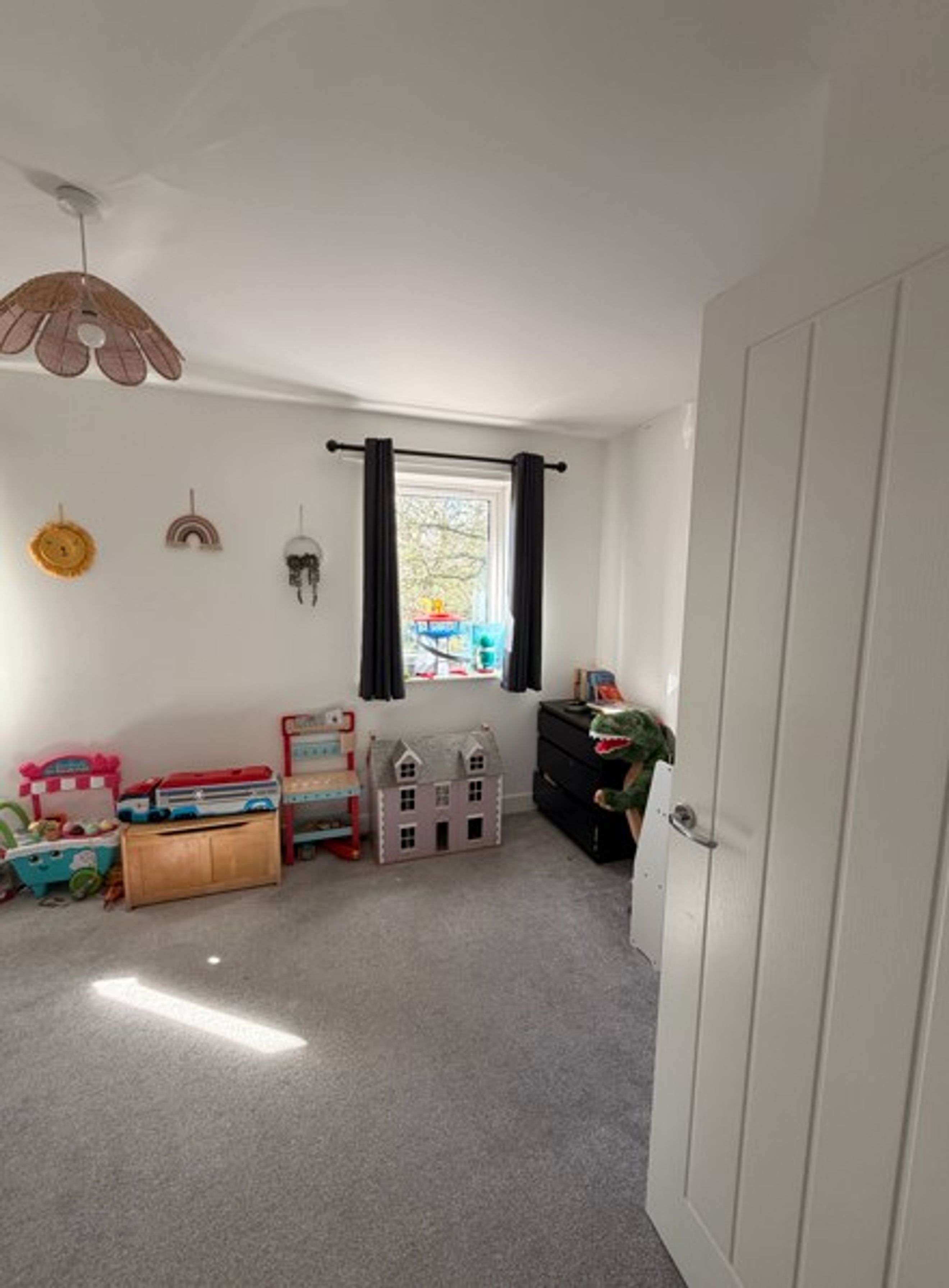 Upstairs are two double bedrooms, with the master benefiting from built‑in wardrobes, along with a family bathroom fitted with a three‑piece suite and shower over the bath, as well as two storage cupboards on the landing.