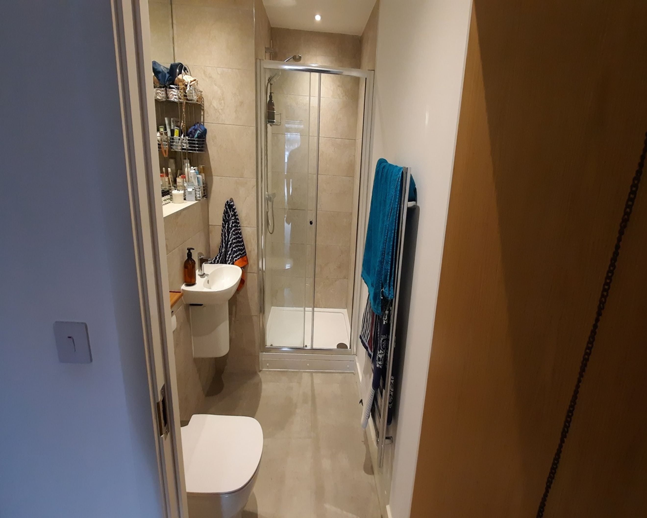 The master bedroom benefits from a private en-suite with a walk-in shower, while the second bedroom is served by a modern family bathroom with a shower over the bath.