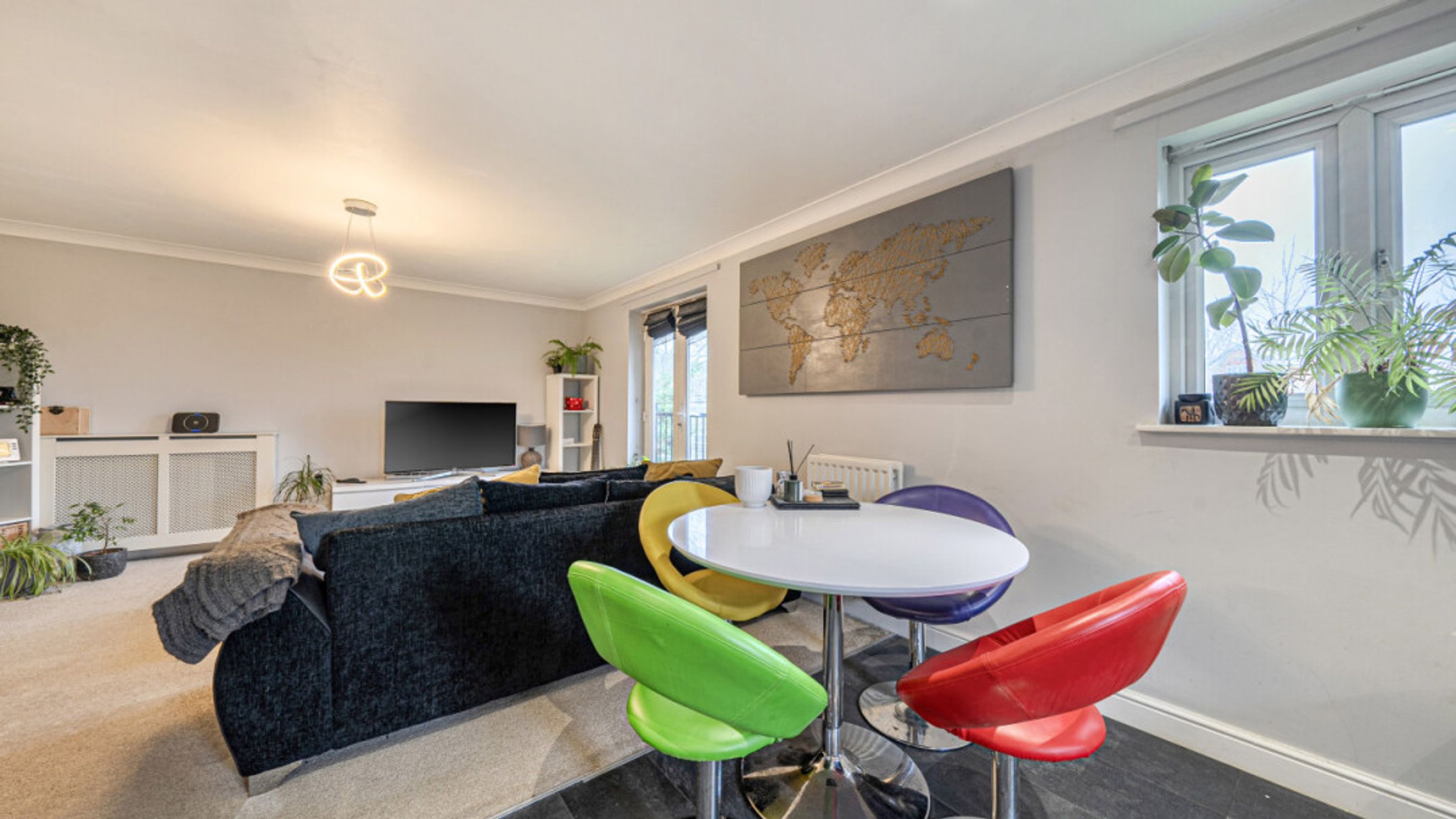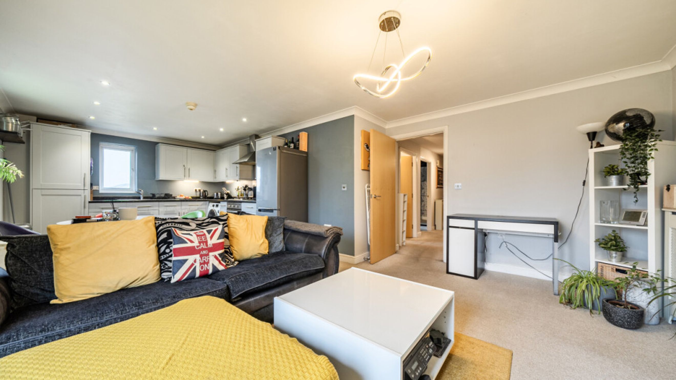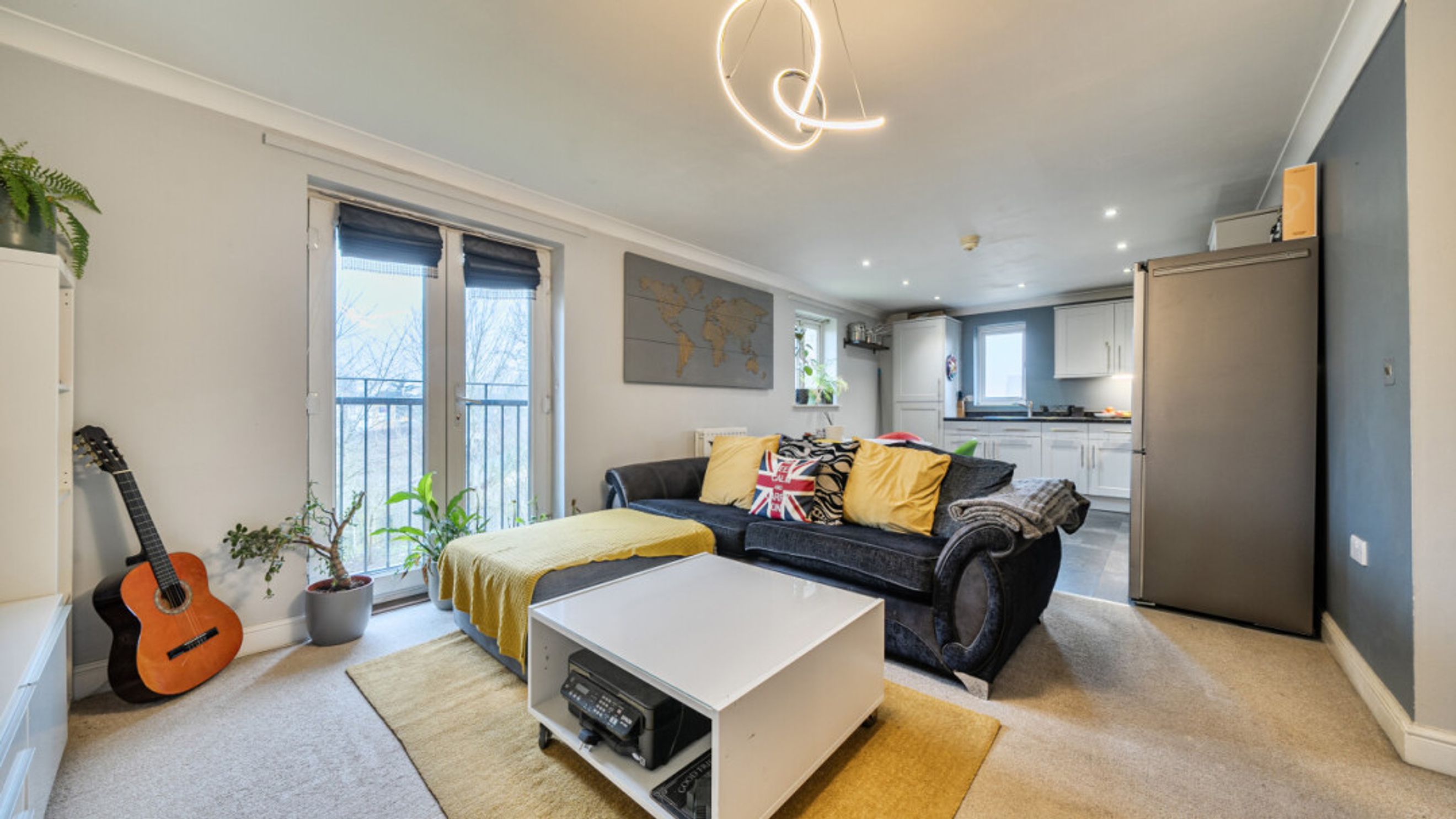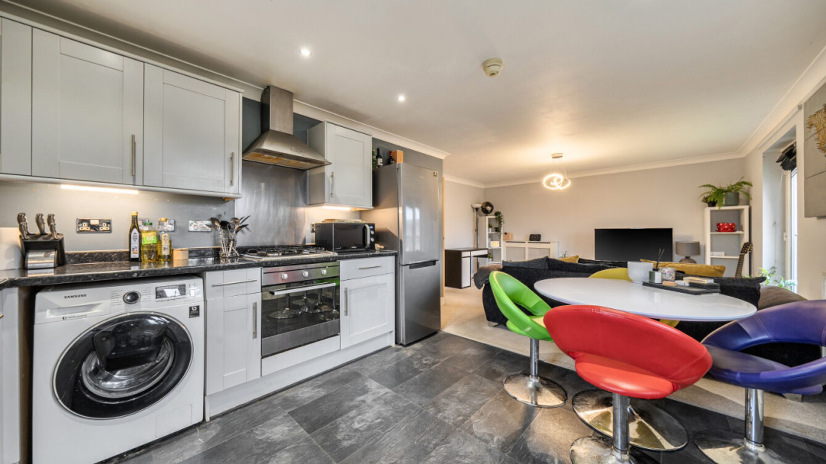 This apartment consists of a dual aspect open plan kitchen and living area with a juliette balcony overlooking the communal garden. The kitchen is fitted with white wall and base units, and a black granite effect worktop and includes an integrated oven, hob and extractor. There are two equally sized double bedrooms, one with a fitted wardrobe. The contemporary bathroom comes complete with a white three-piece suite with a shower over the bath with tile surround. This property also benefits from allocated parking.