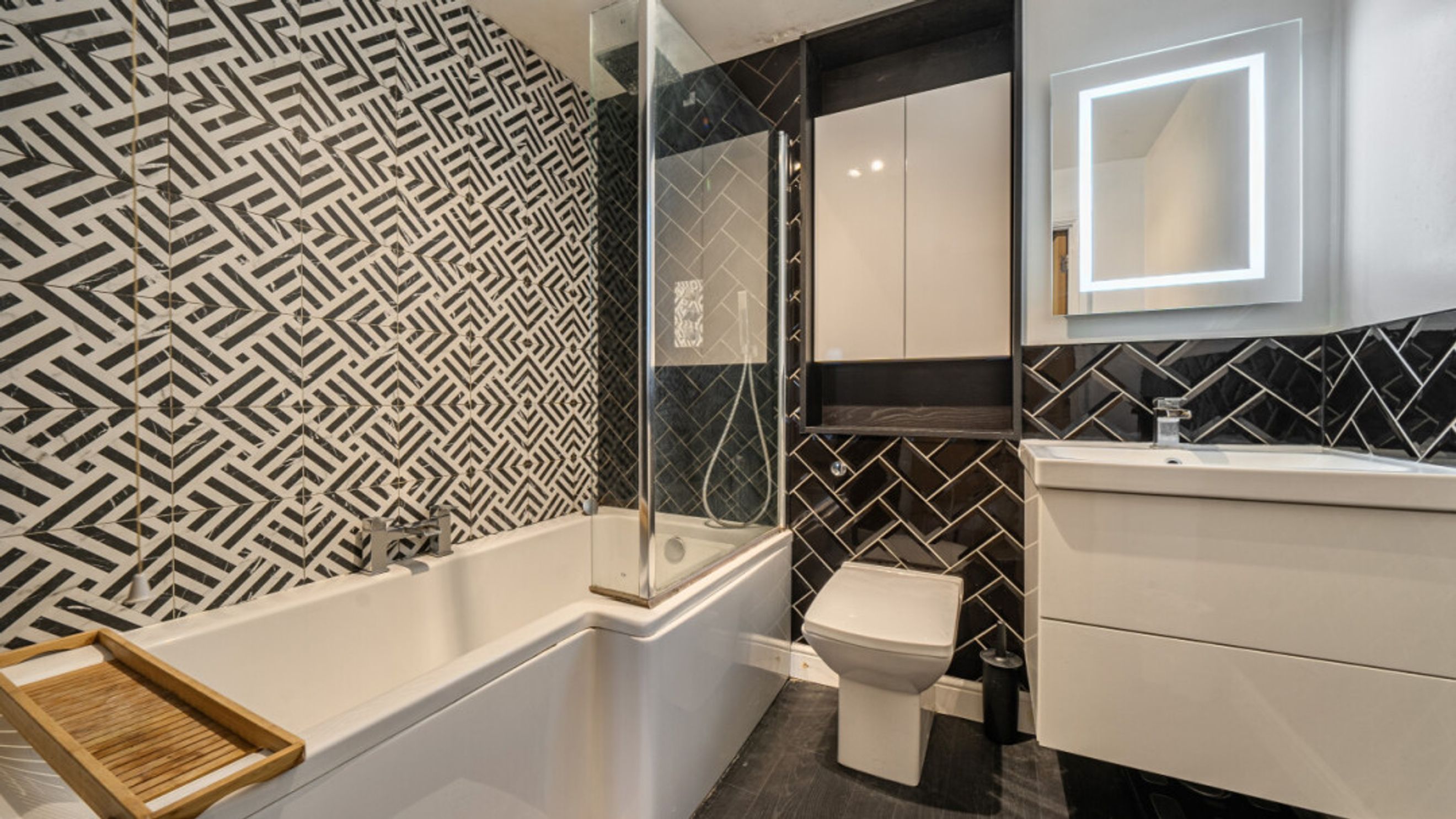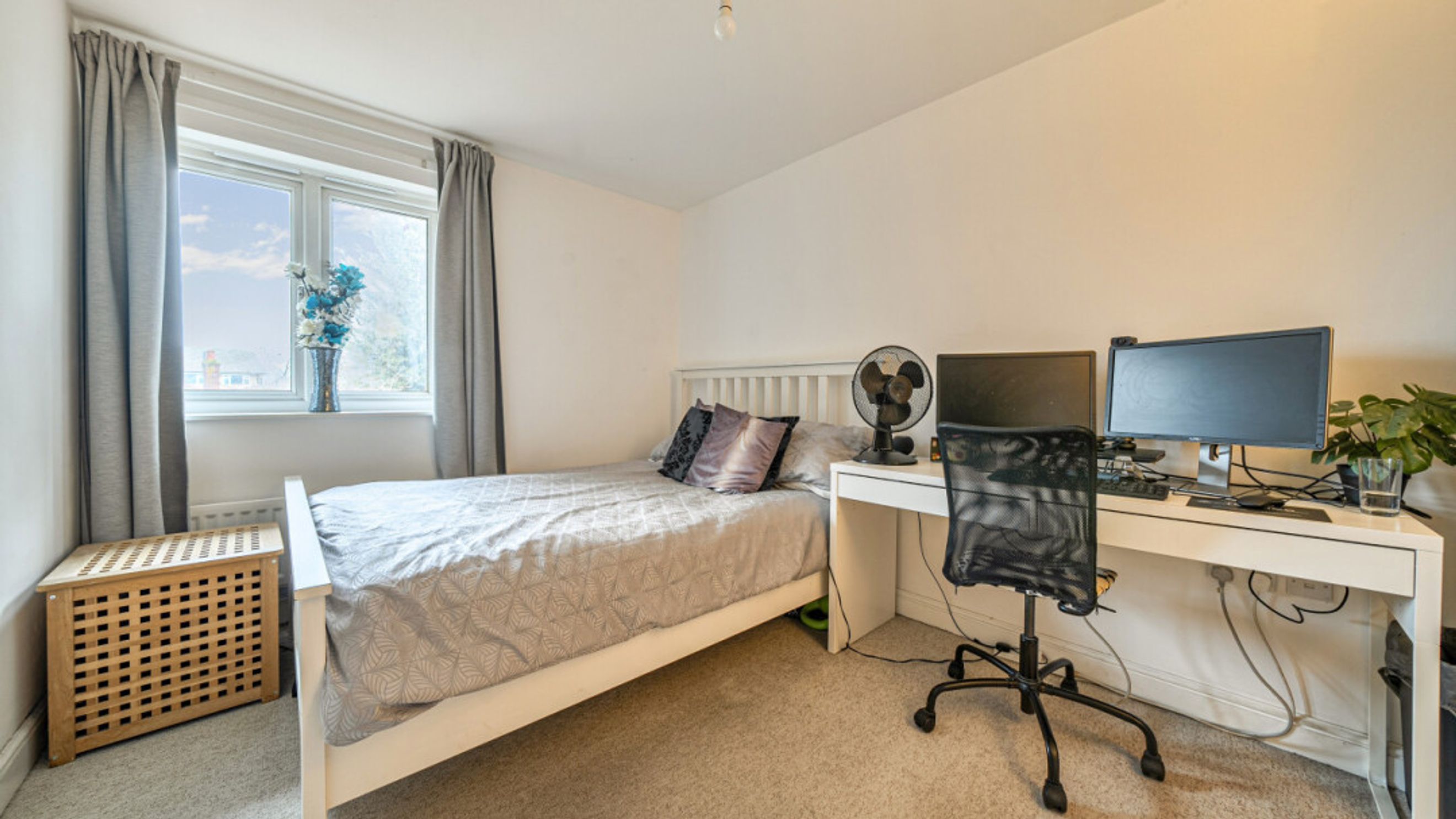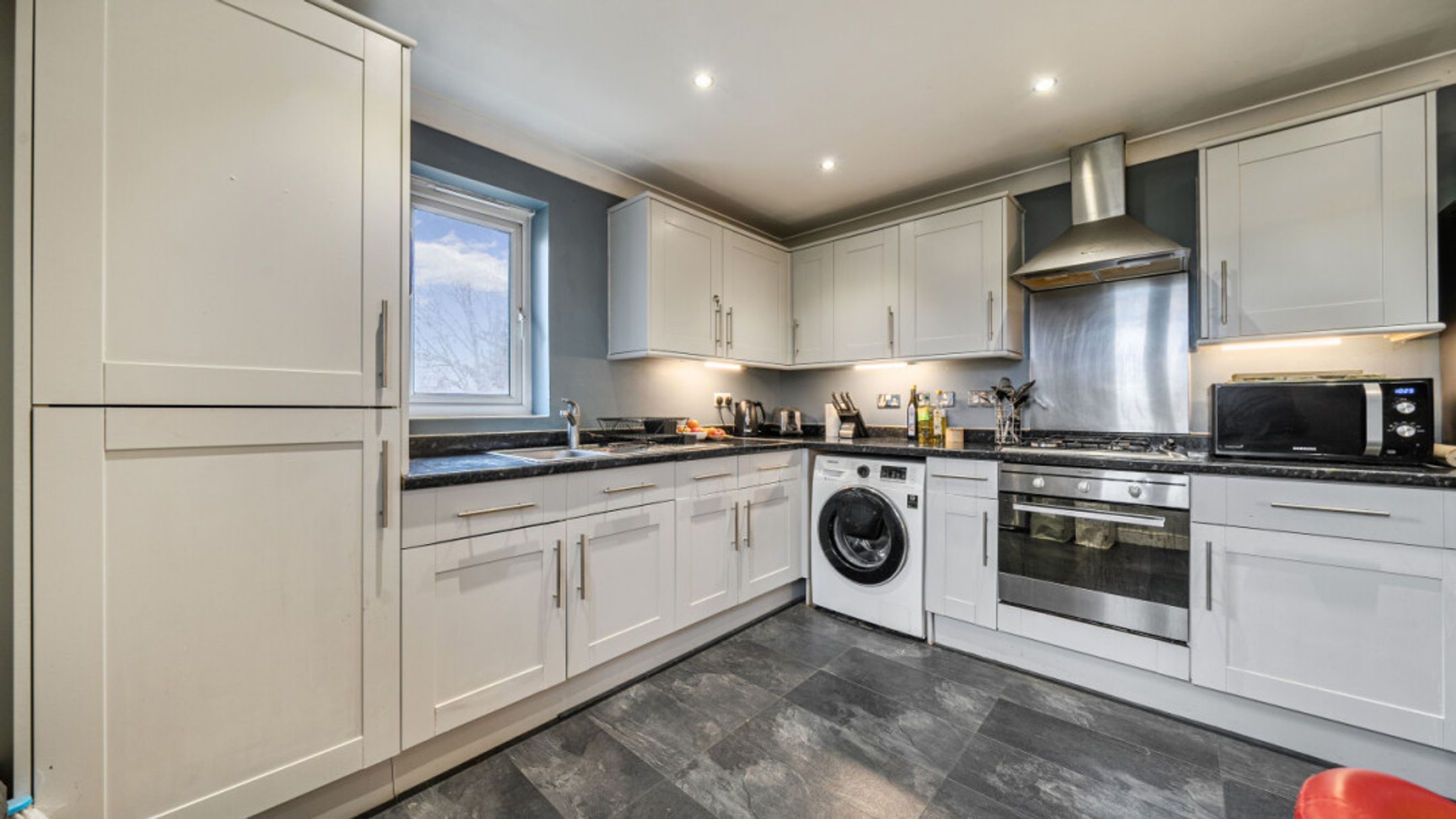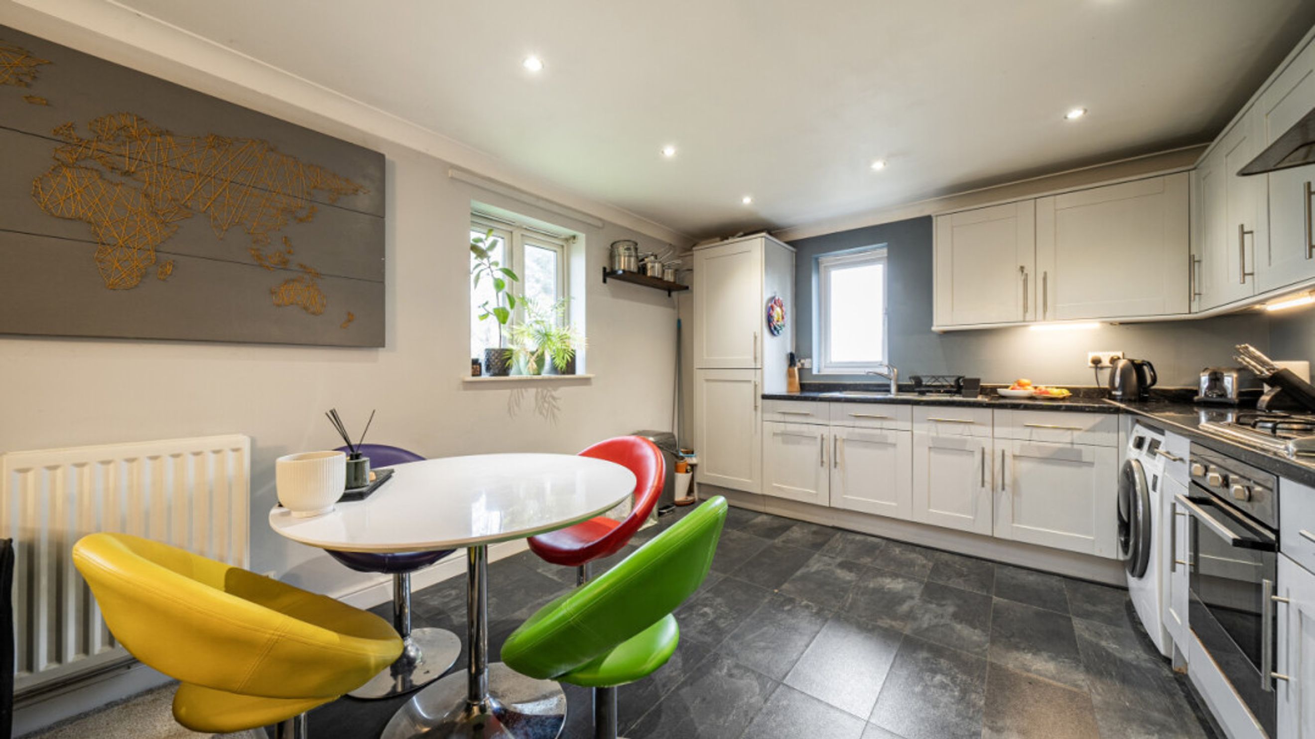 This apartment consists of a dual aspect open plan kitchen and living area with a juliette balcony overlooking the communal garden. The kitchen is fitted with white wall and base units, and a black granite effect worktop and includes an integrated oven, hob and extractor. There are two equally sized double bedrooms, one with a fitted wardrobe. The contemporary bathroom comes complete with a white three-piece suite with a shower over the bath with tile surround. This property also benefits from allocated parking.