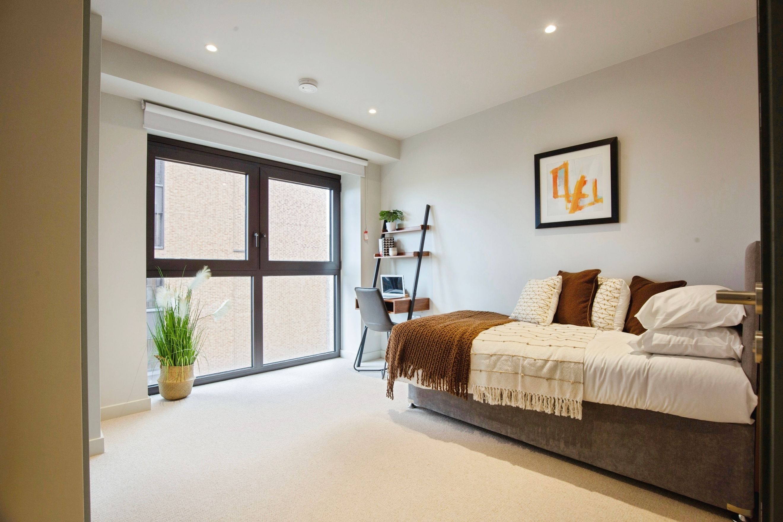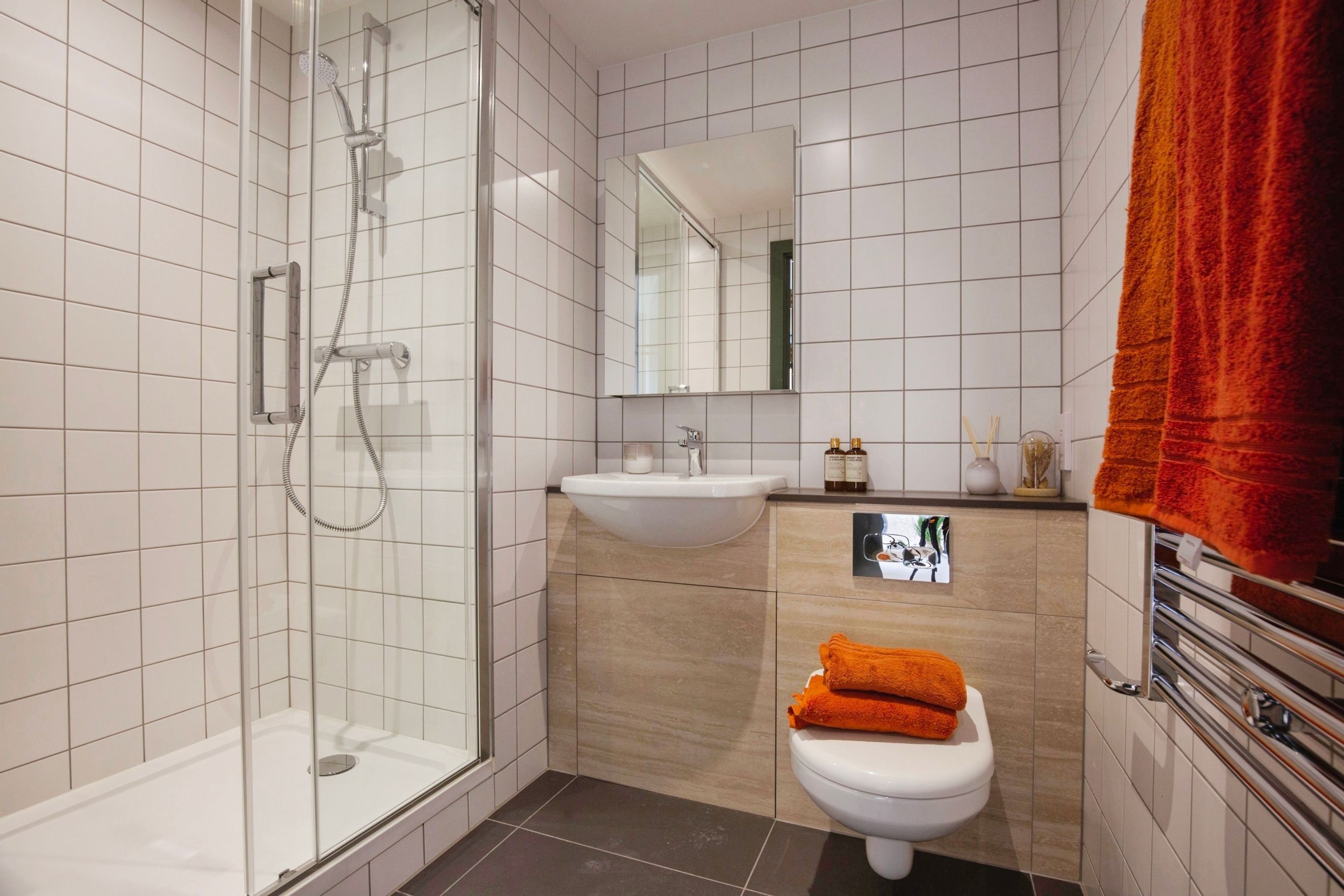 The apartment features two well‑proportioned bedrooms, both benefitting from natural light. The principal bedroom includes built‑in wardrobe space, while the second bedroom is ideal for guests, home working or family use. A contemporary bathroom is finished to a high standard with modern fittings and a bath with overhead shower.