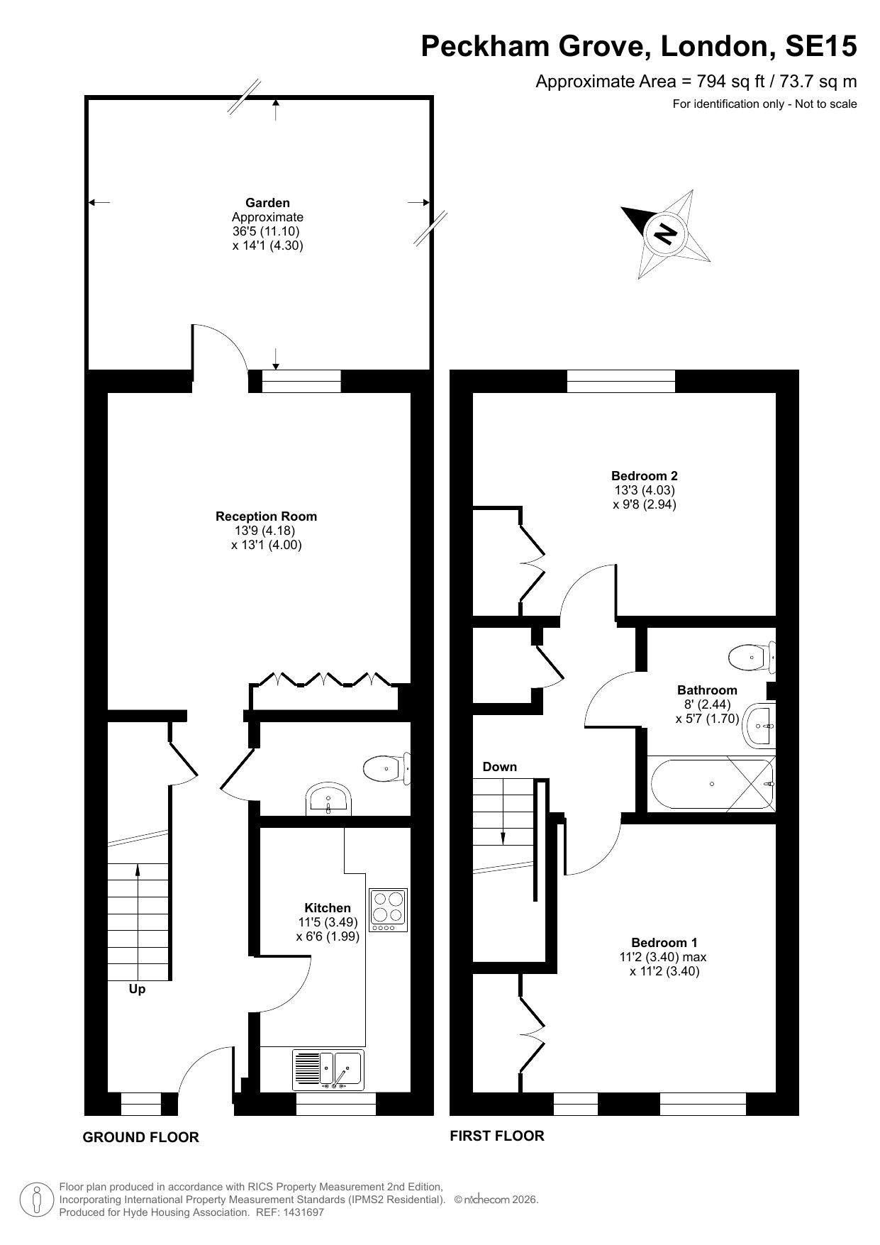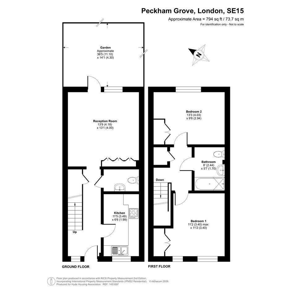 The property features an entrance hallway, reception room, separate kitchen, and a toilet on the ground floor. On the first floor, there are two bedrooms and one family bathroom.