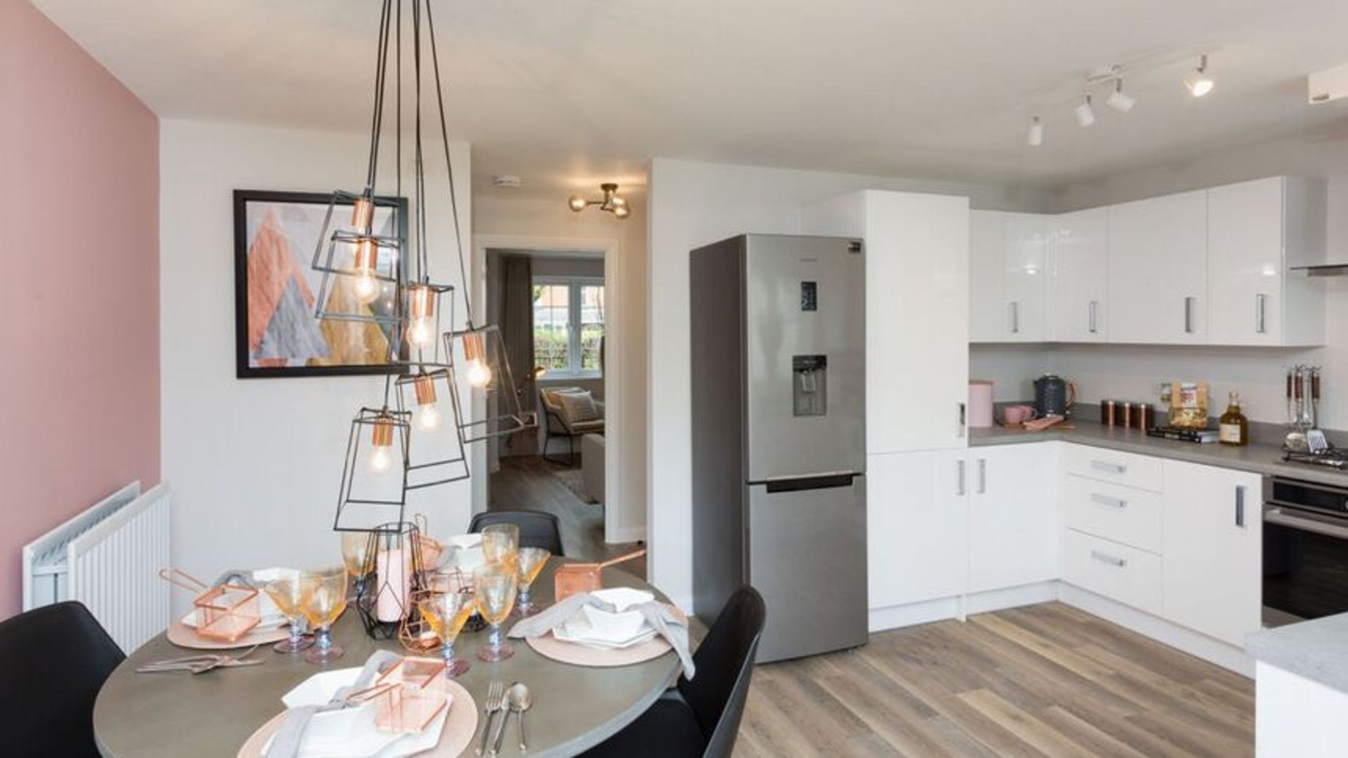 Inside, the welcoming hallway sets the tone for this thoughtfully designed space. Discover the open-plan wrap-around kitchen with a dining area, offering a versatile space for family meals. French doors lead to the garden from the separate lounge, allowing plenty of natural light to flood the room. A convenient guest cloakroom and handy storage cupboard complete the ground floor.